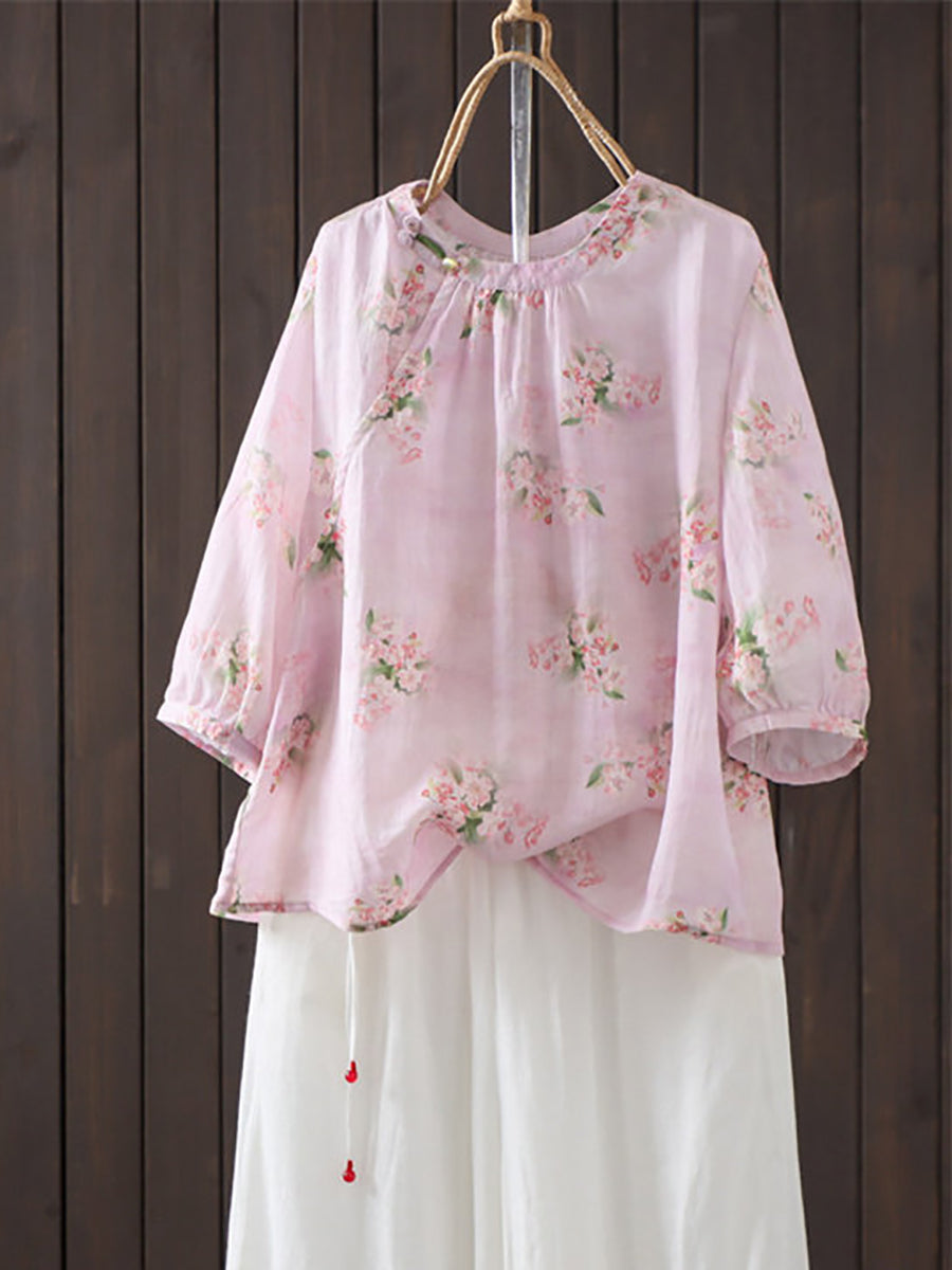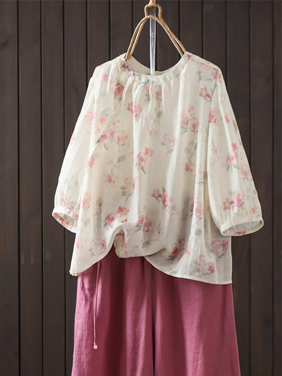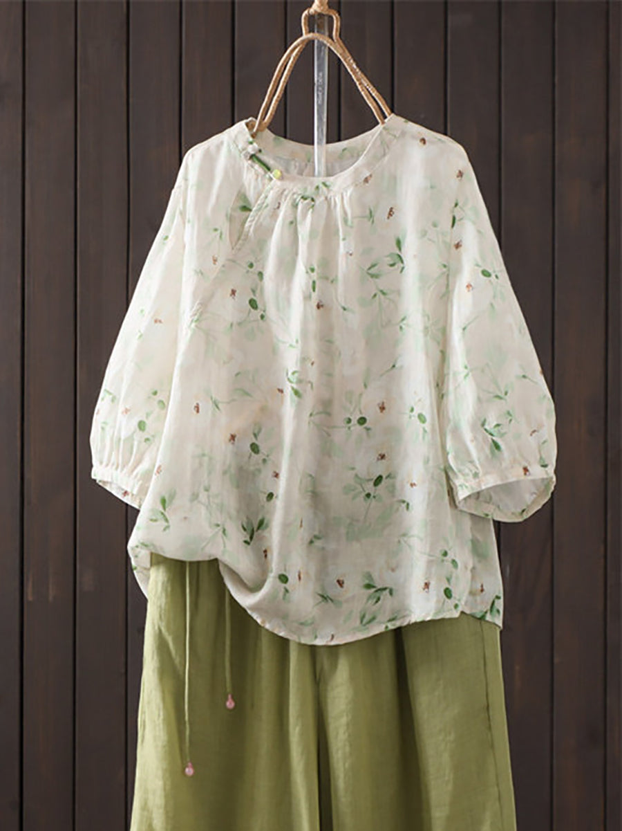 レディース 夏物 アーティスティック 花柄 ラウンドネック 100%ラミーシャツ