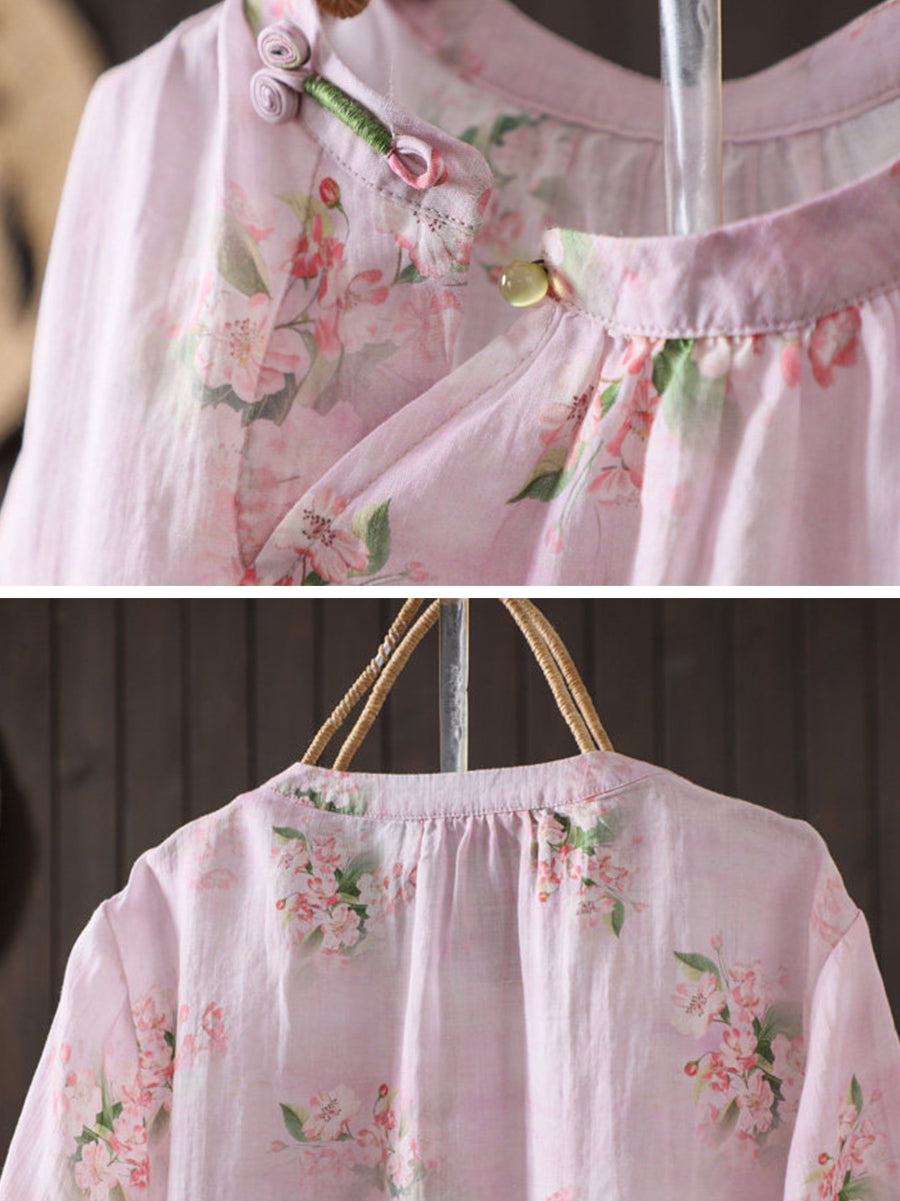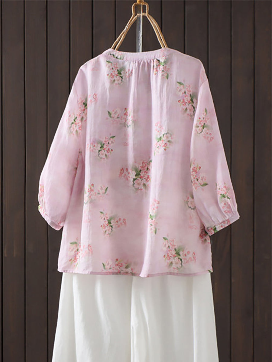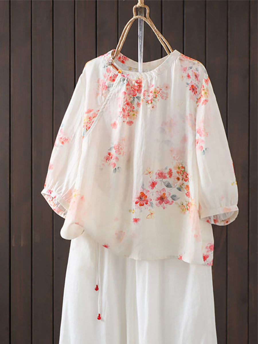 レディース 夏物 アーティスティック 花柄 ラウンドネック 100%ラミーシャツ