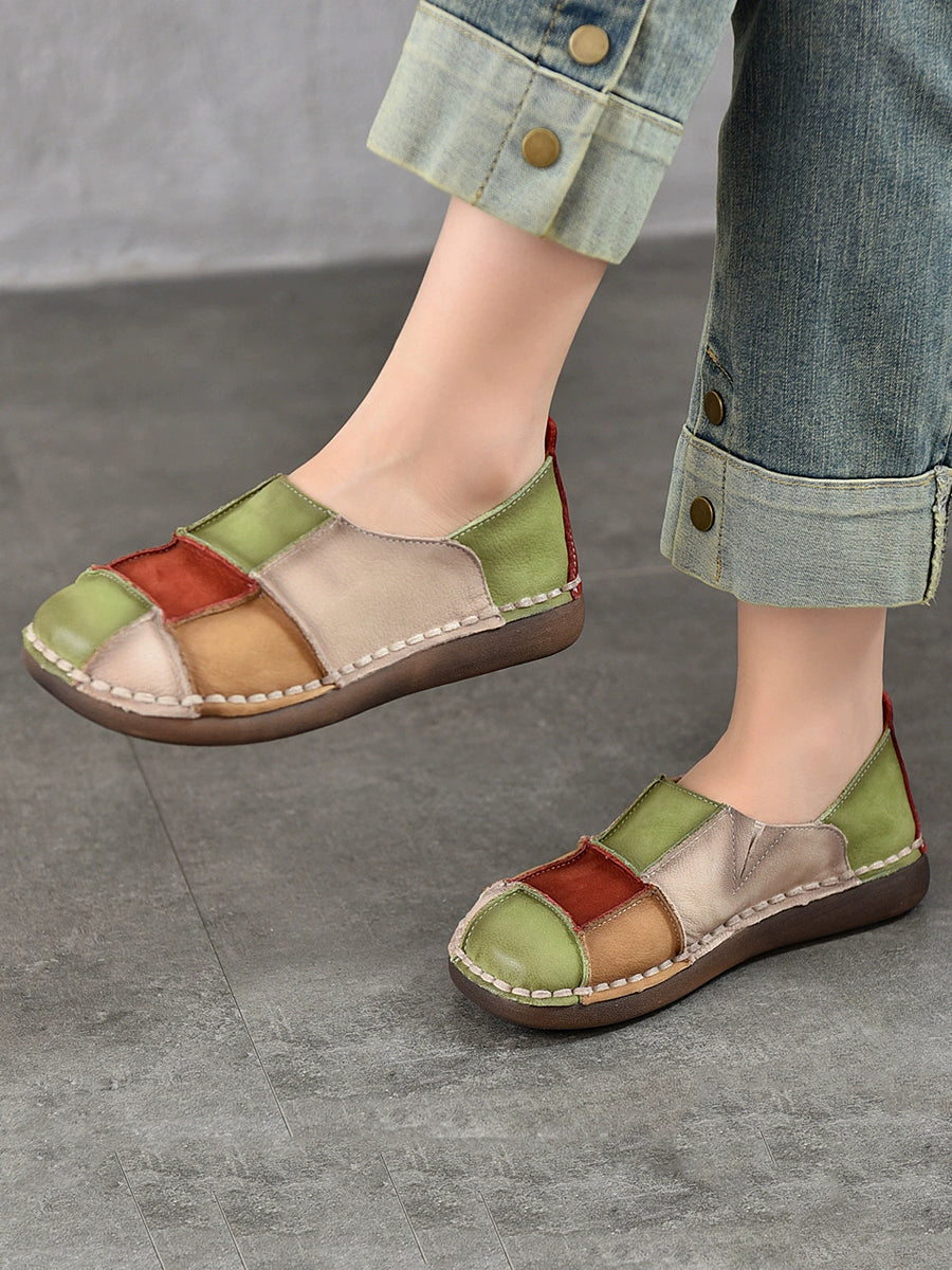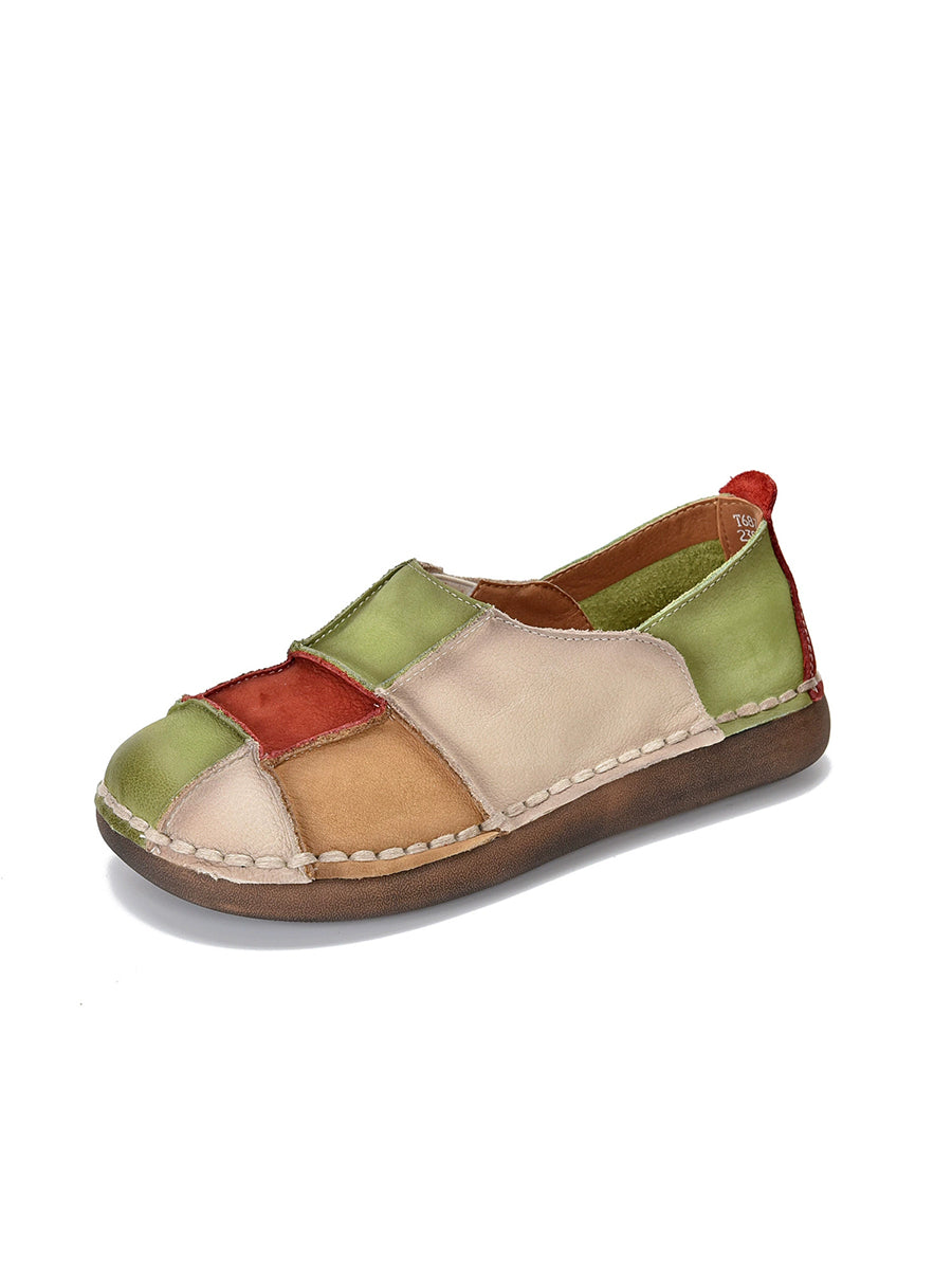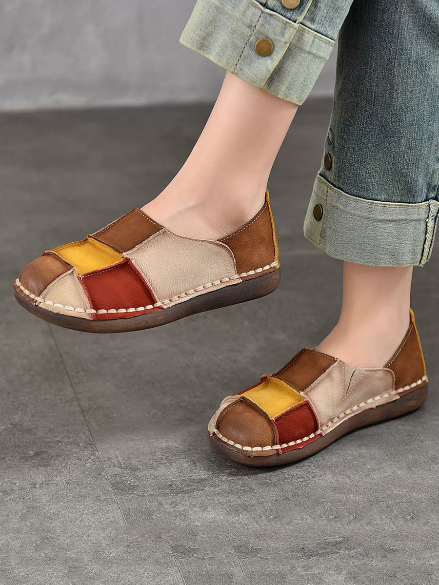 Women Spring Retro Colorblock Leather Flat Shoes