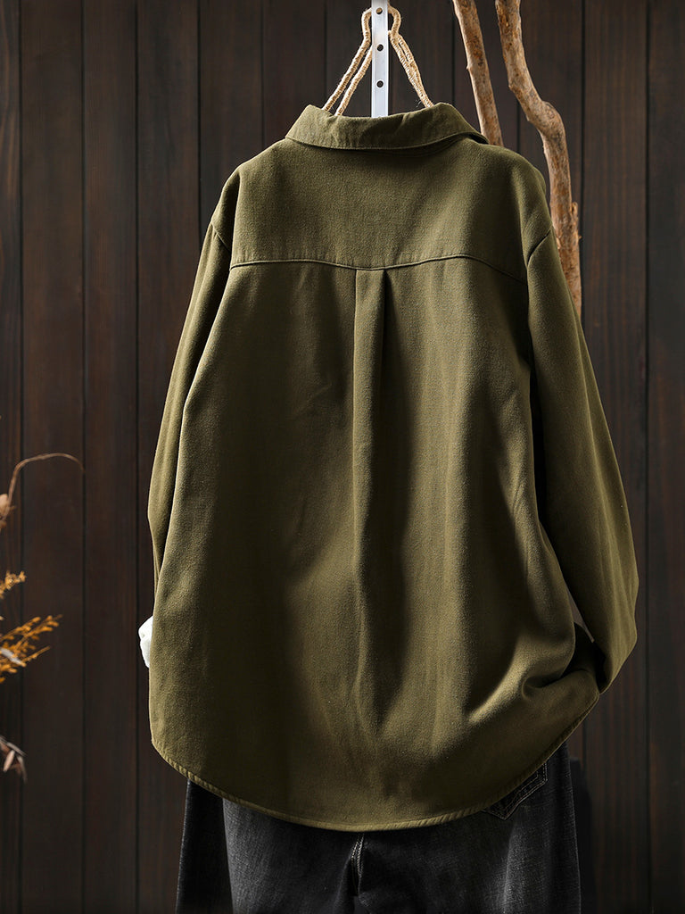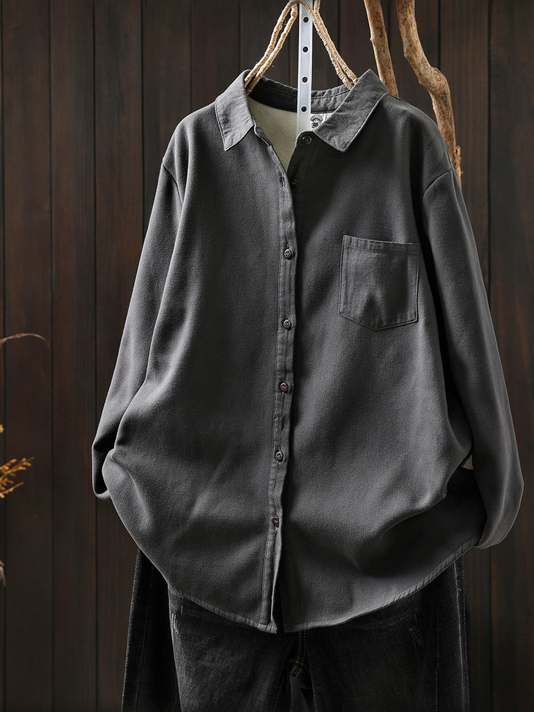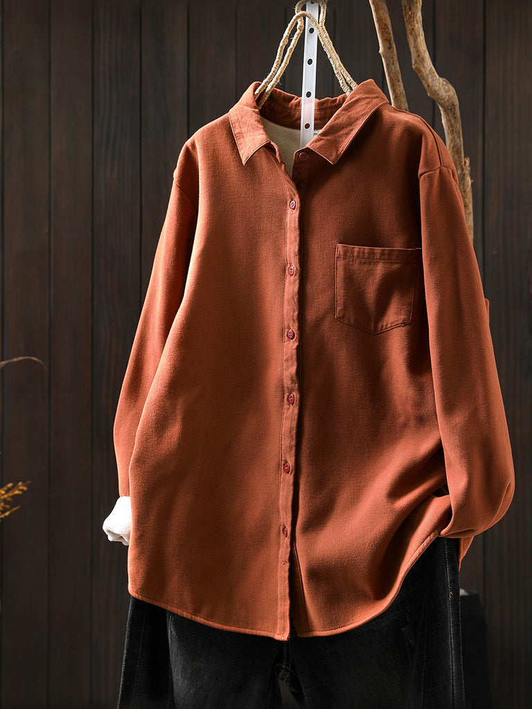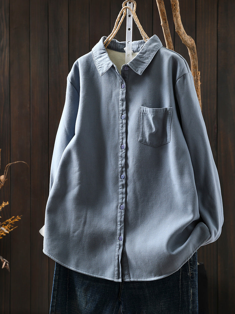 Women Autumn Casual Pure Color Fleece-lined Shirt