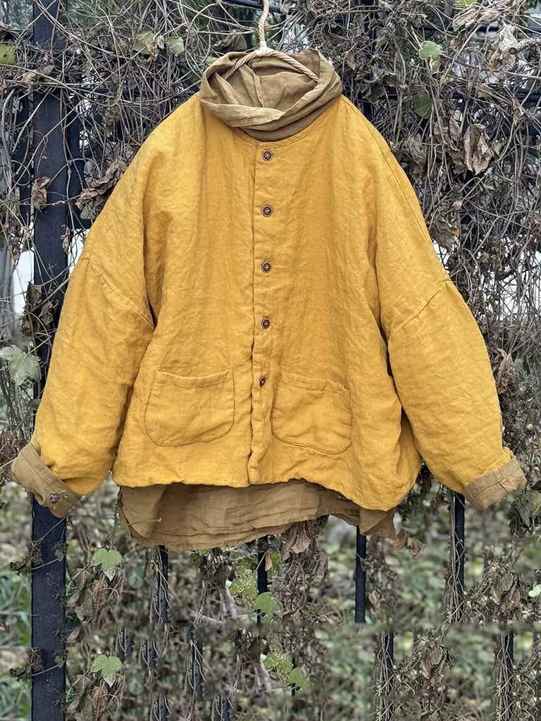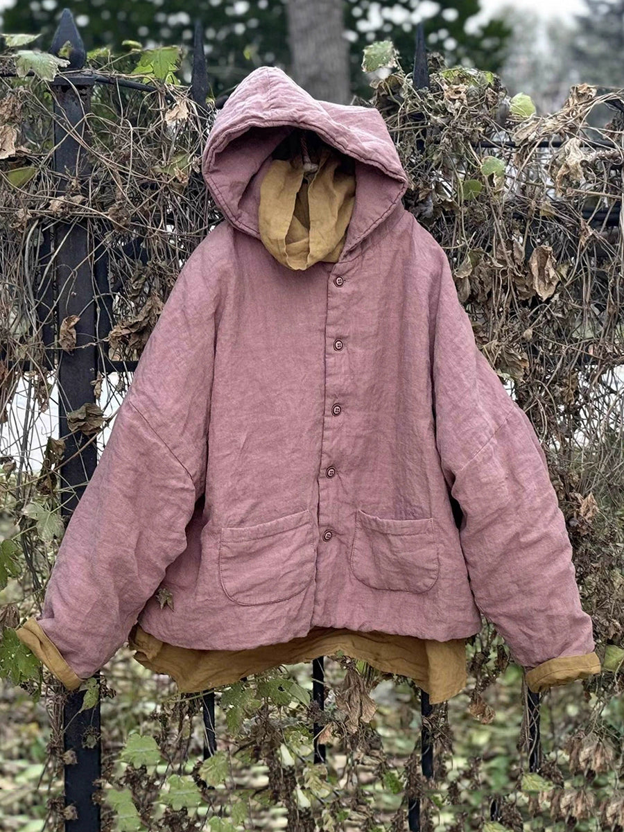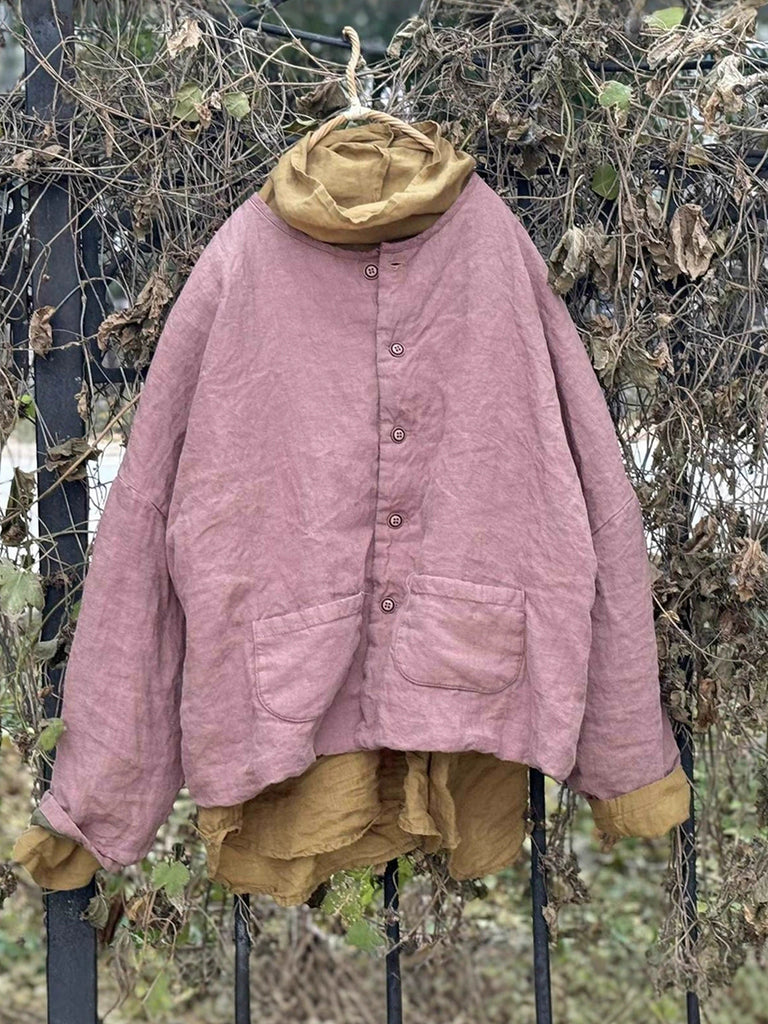 Women Winter Retro Pure Color Linen Padded Coat