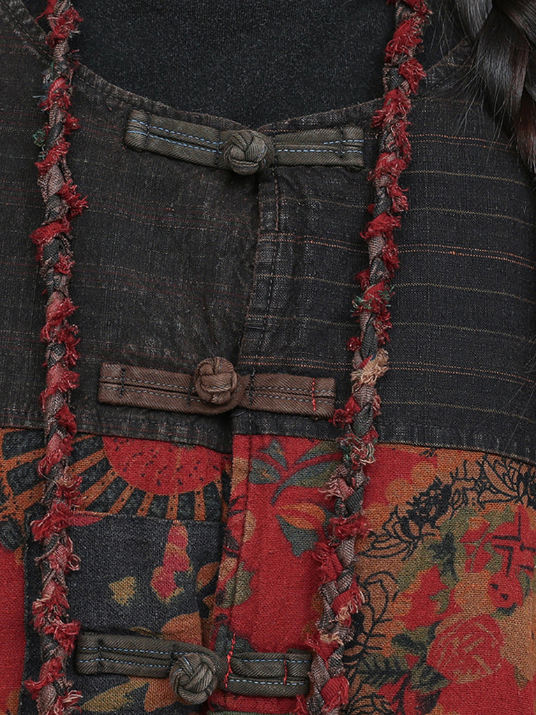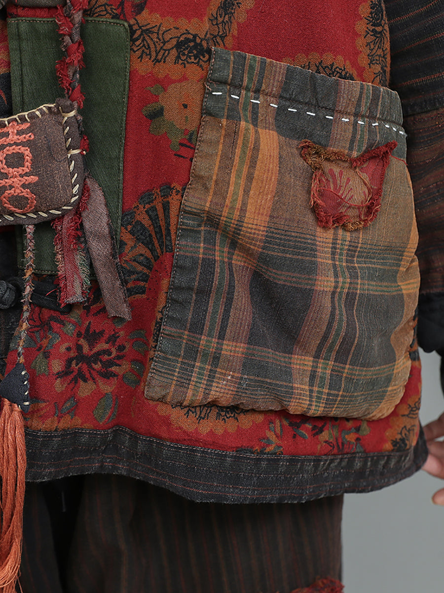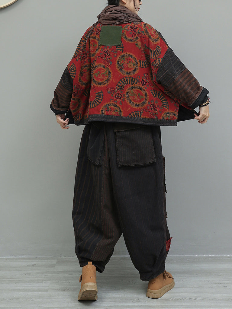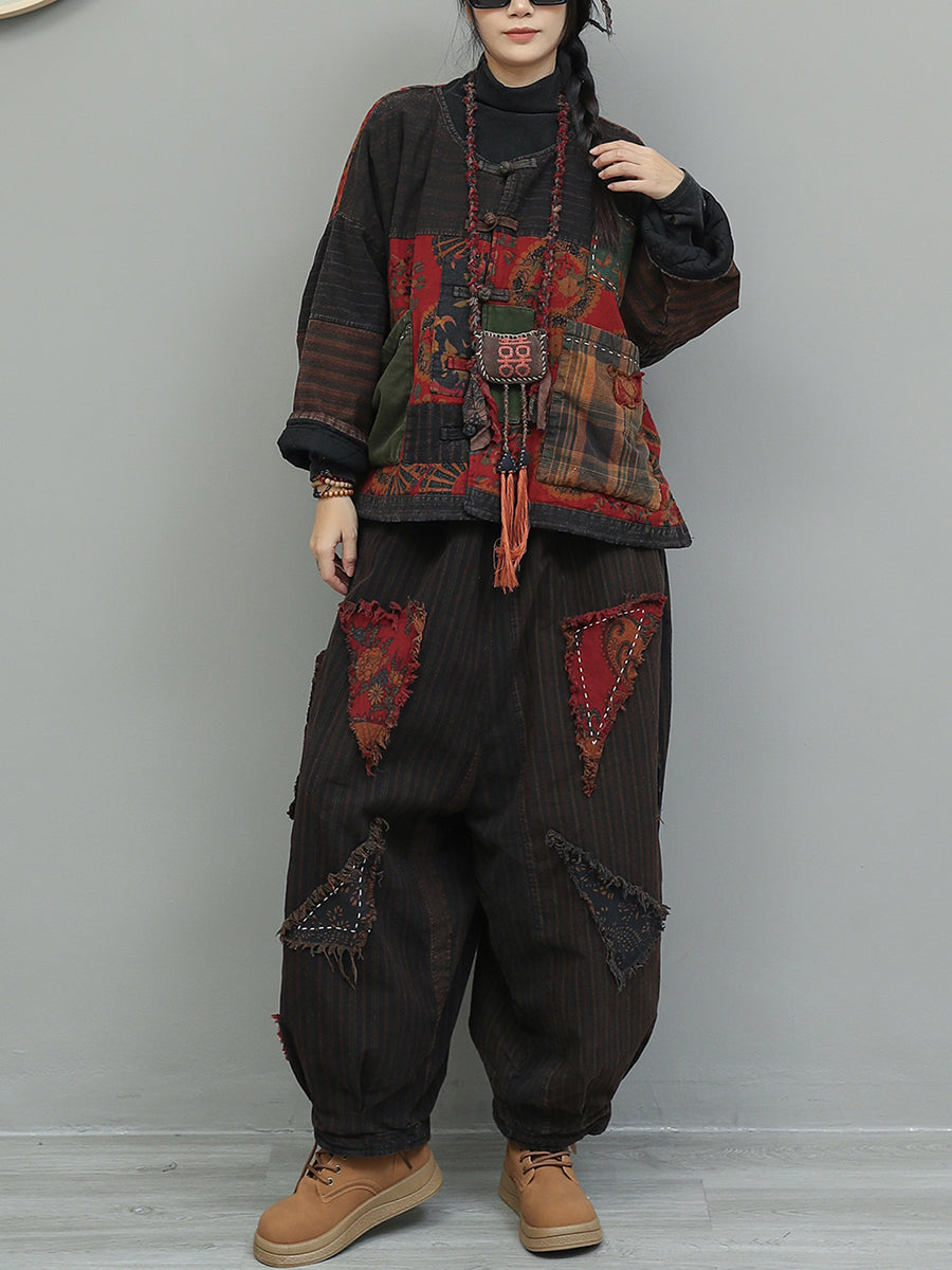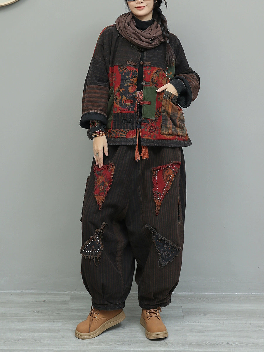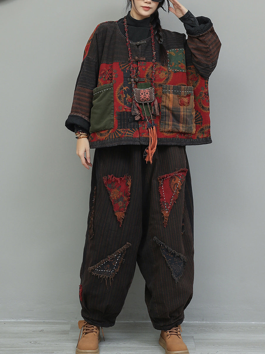 Women Winter Retro Flower Patchwork O-Neck Padded Suits