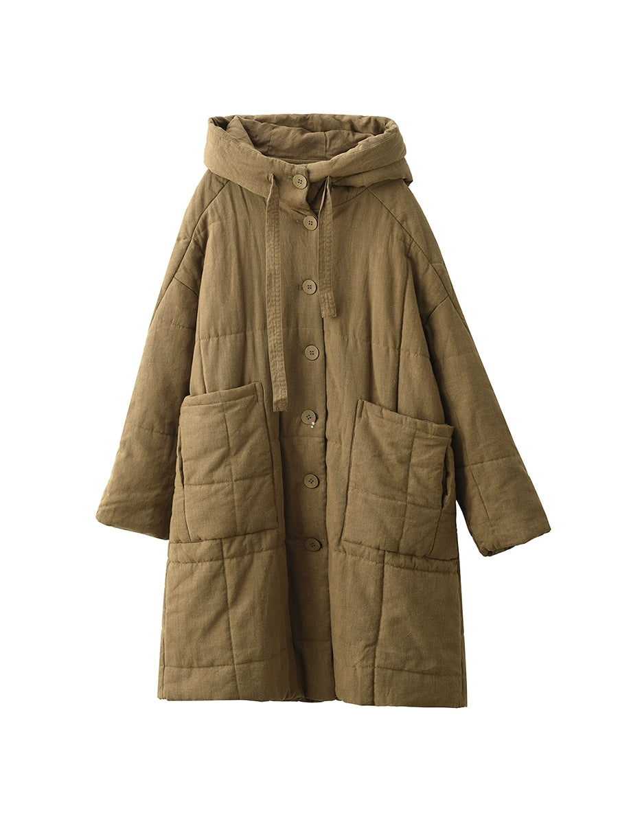 Women Winter Retro Ramie Hooded Padded Coat