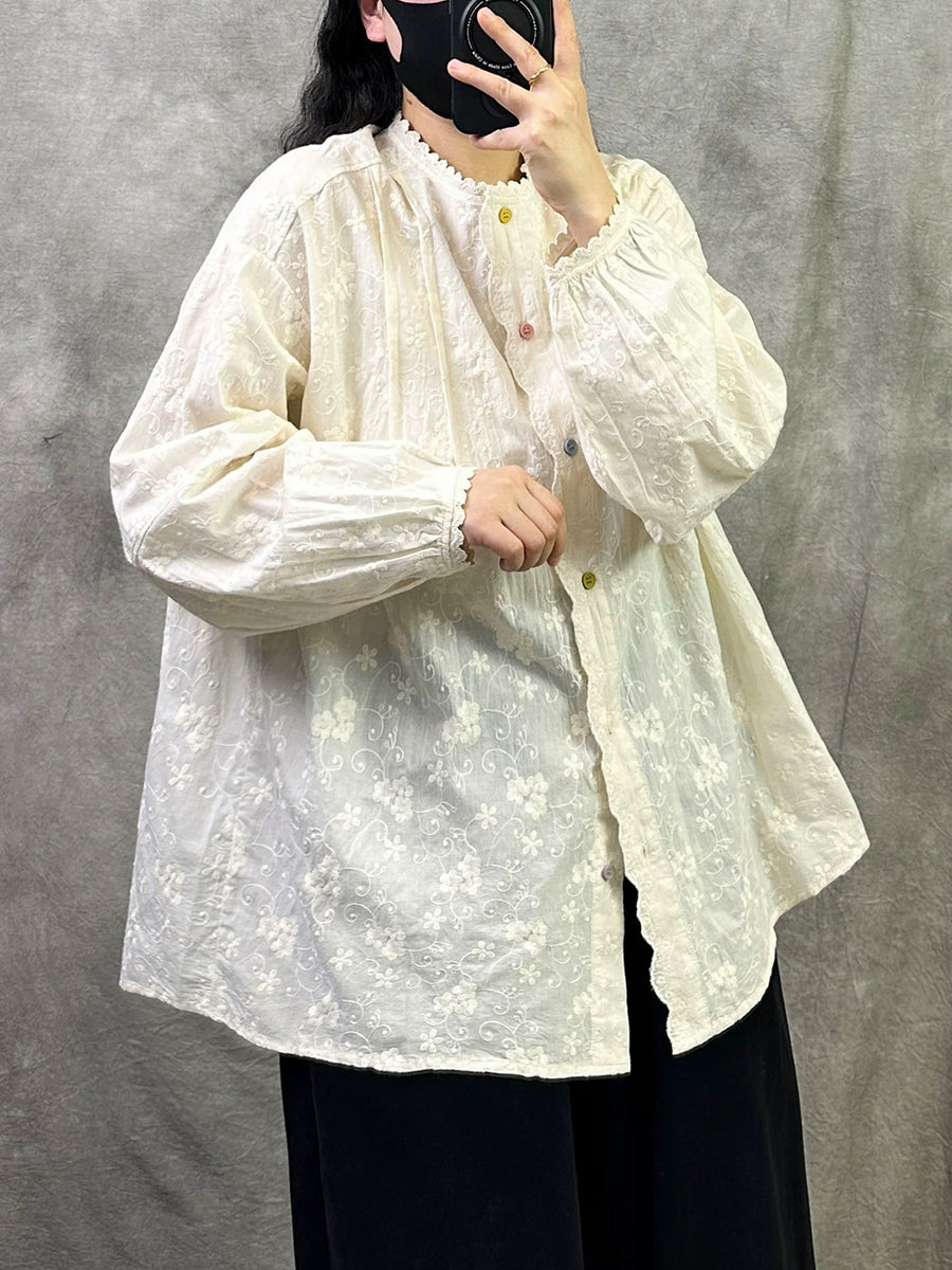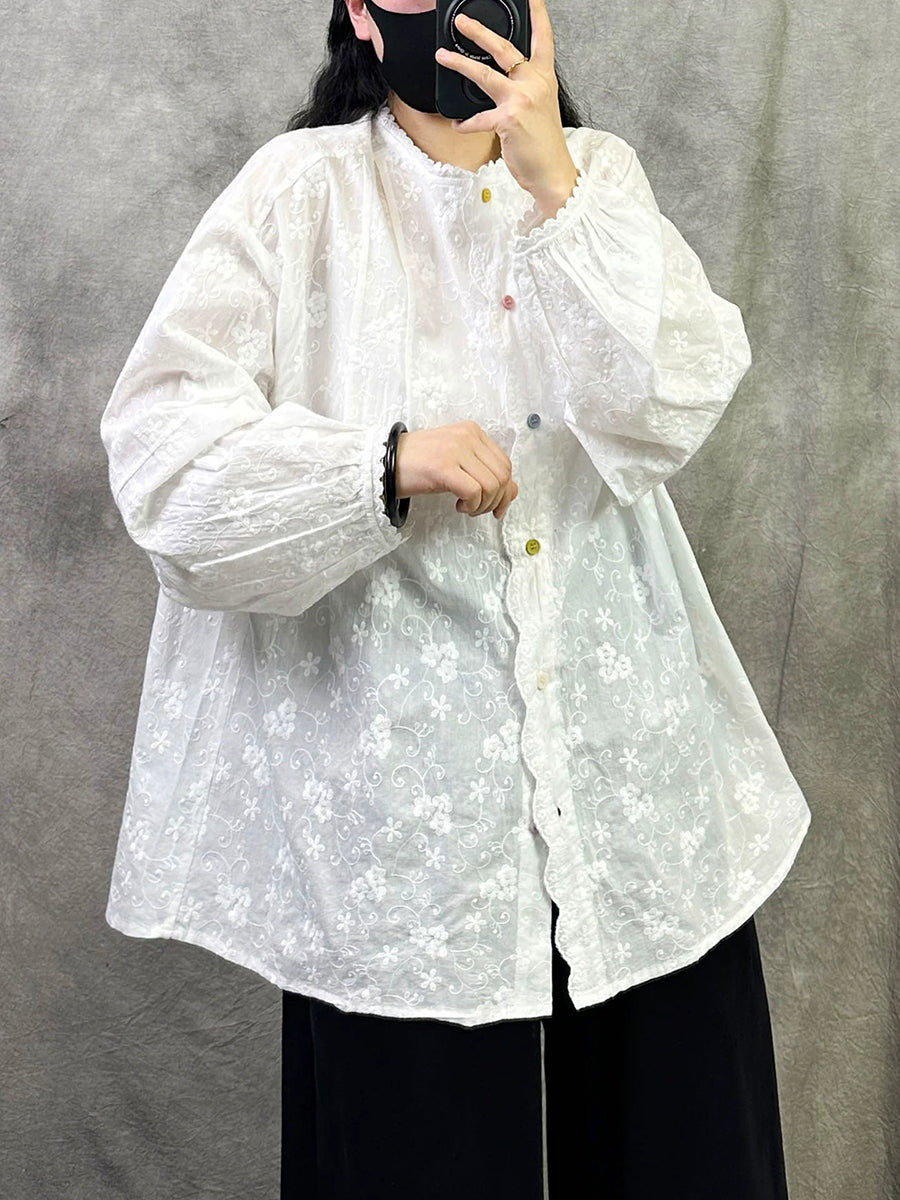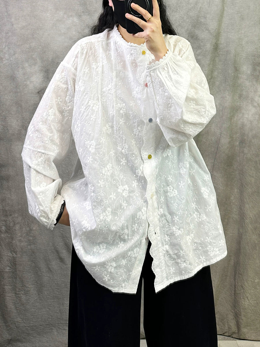 Women Spring Artsy Embroidery Cotton Stand Collar Shirt
