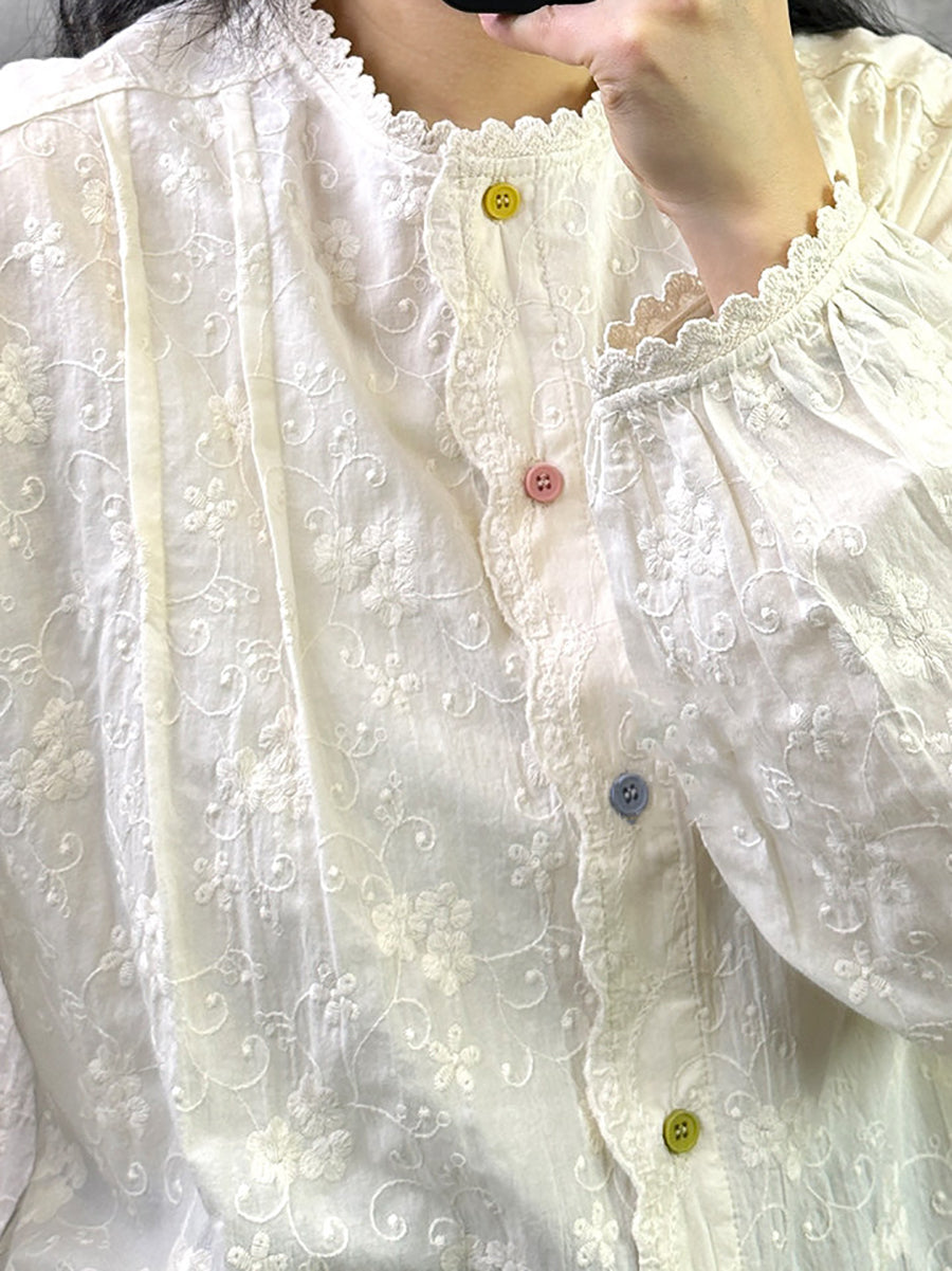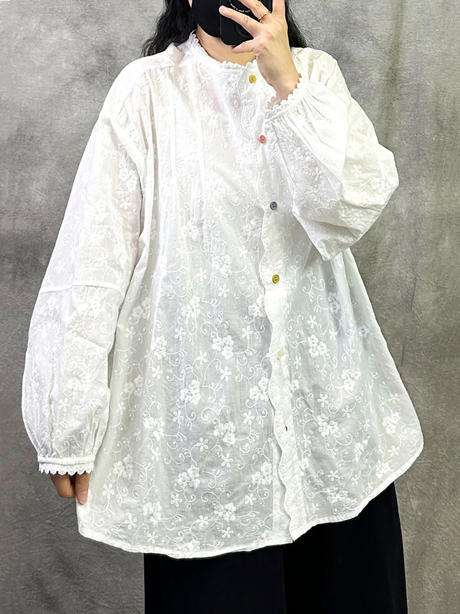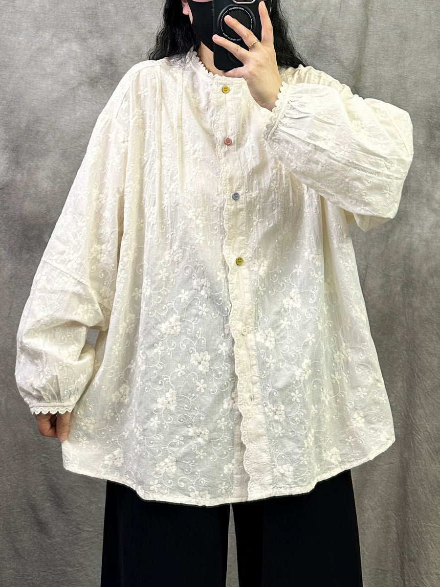 Women Spring Artsy Embroidery Cotton Stand Collar Shirt
