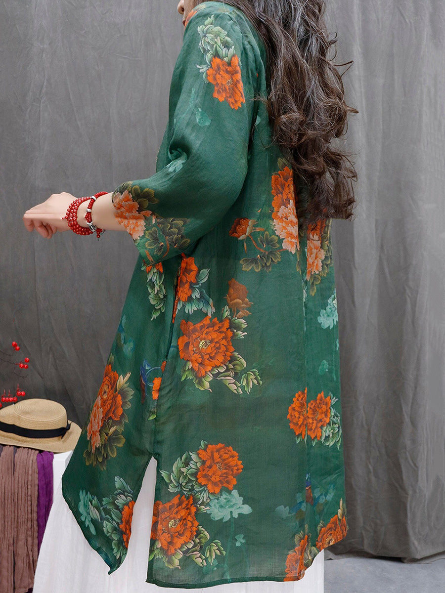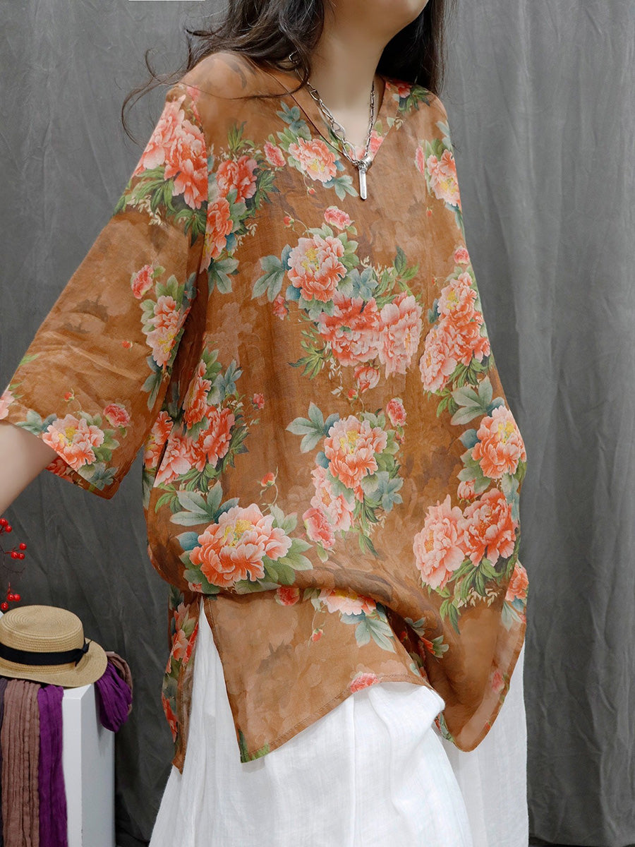 Women Spring Artsy Flower 100%Ramie V-Neck Blouse