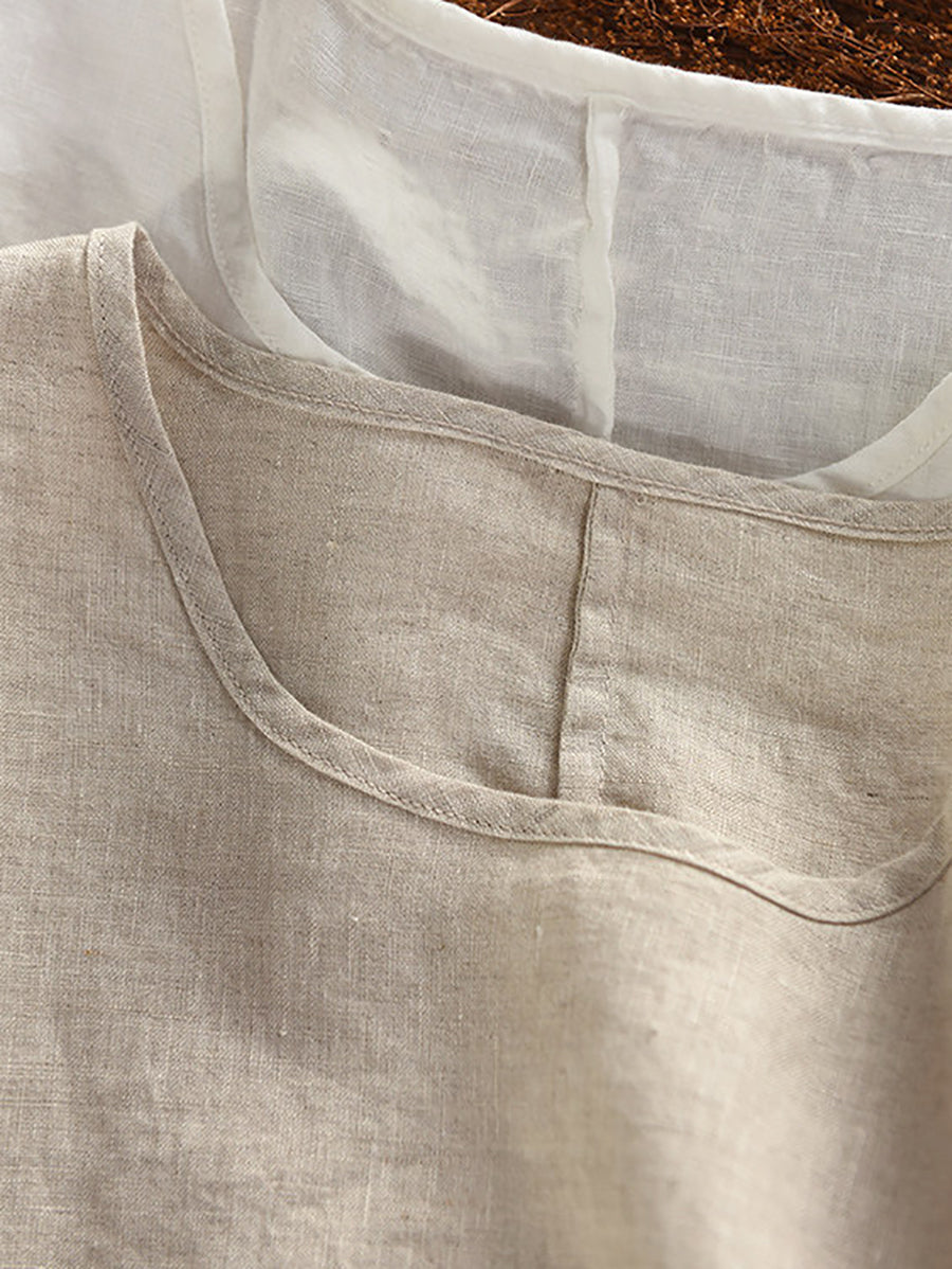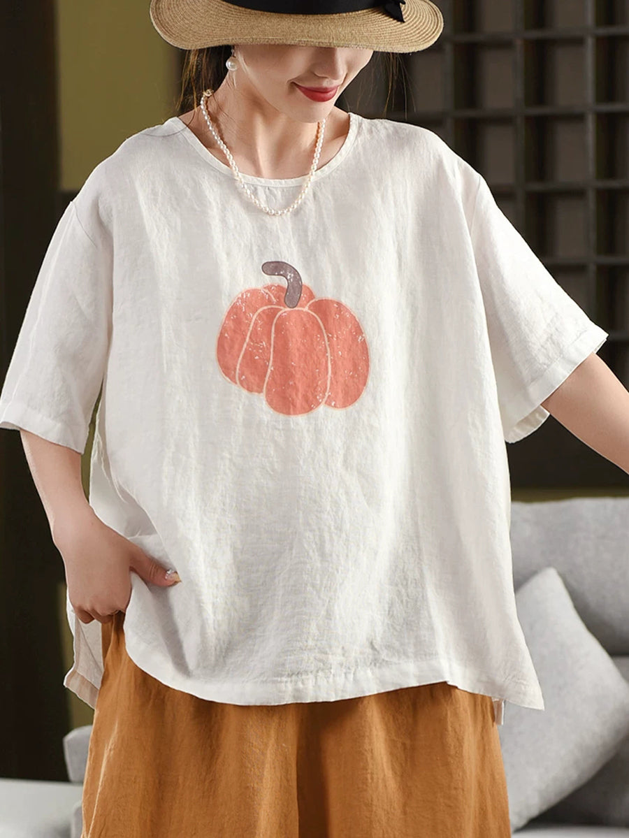 Women Summer Pumkin O-Neck 100%Linen Blouse