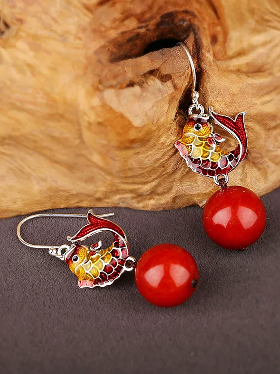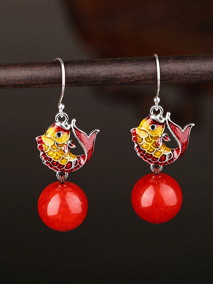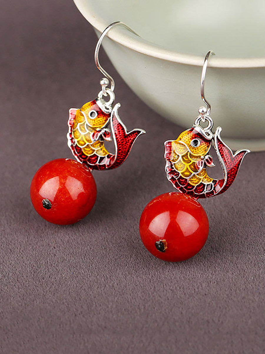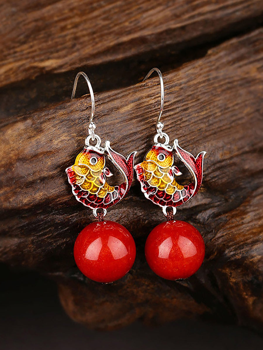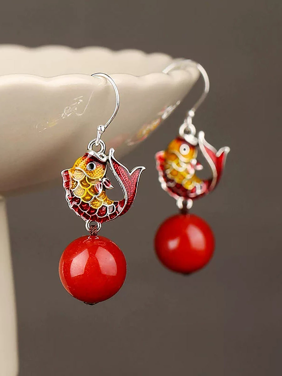 Women Ethnic Cloisonne Fish Red Bead Earrings
