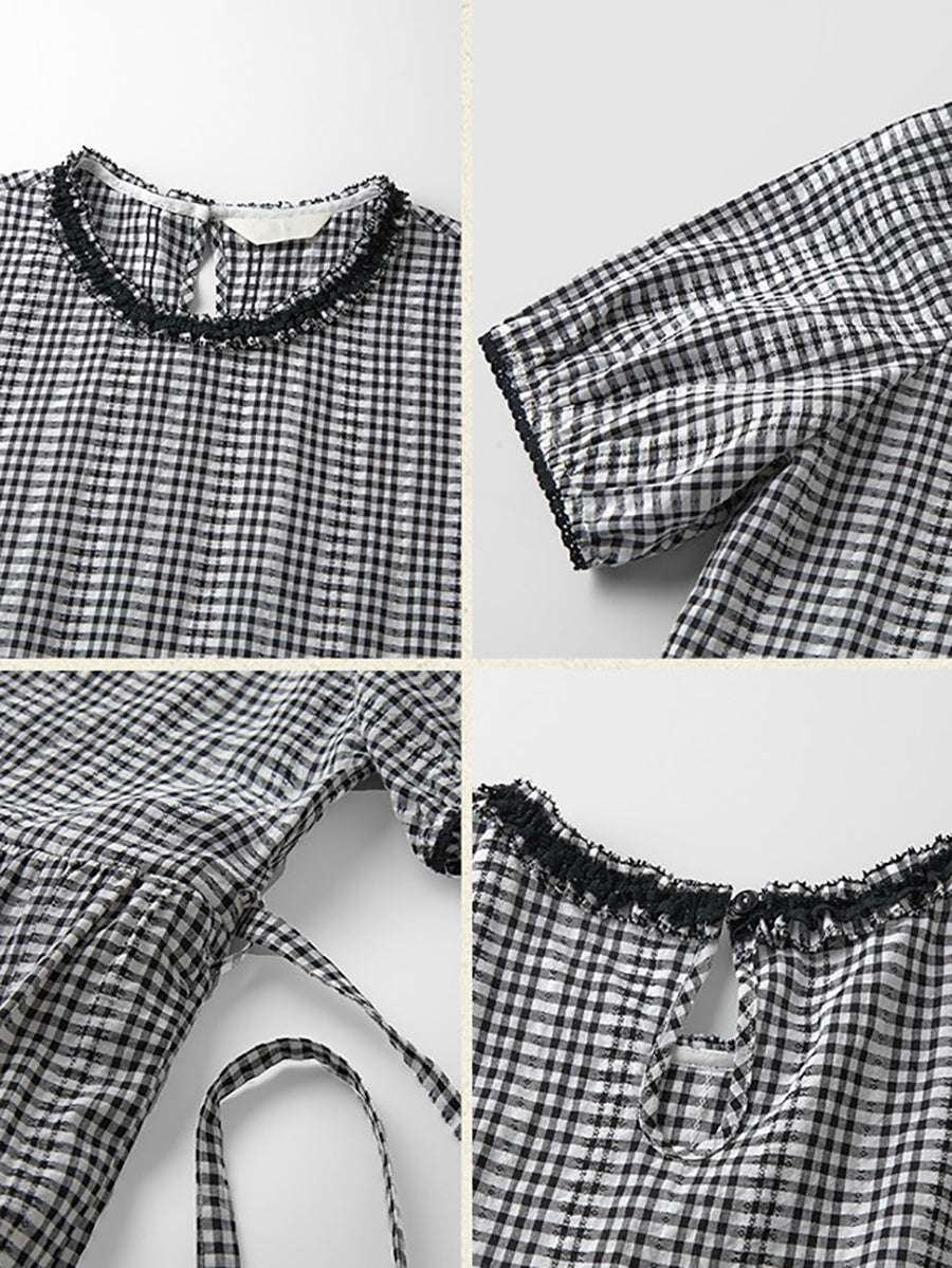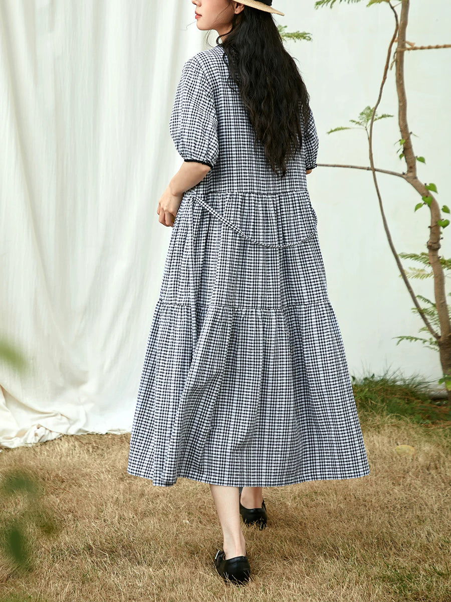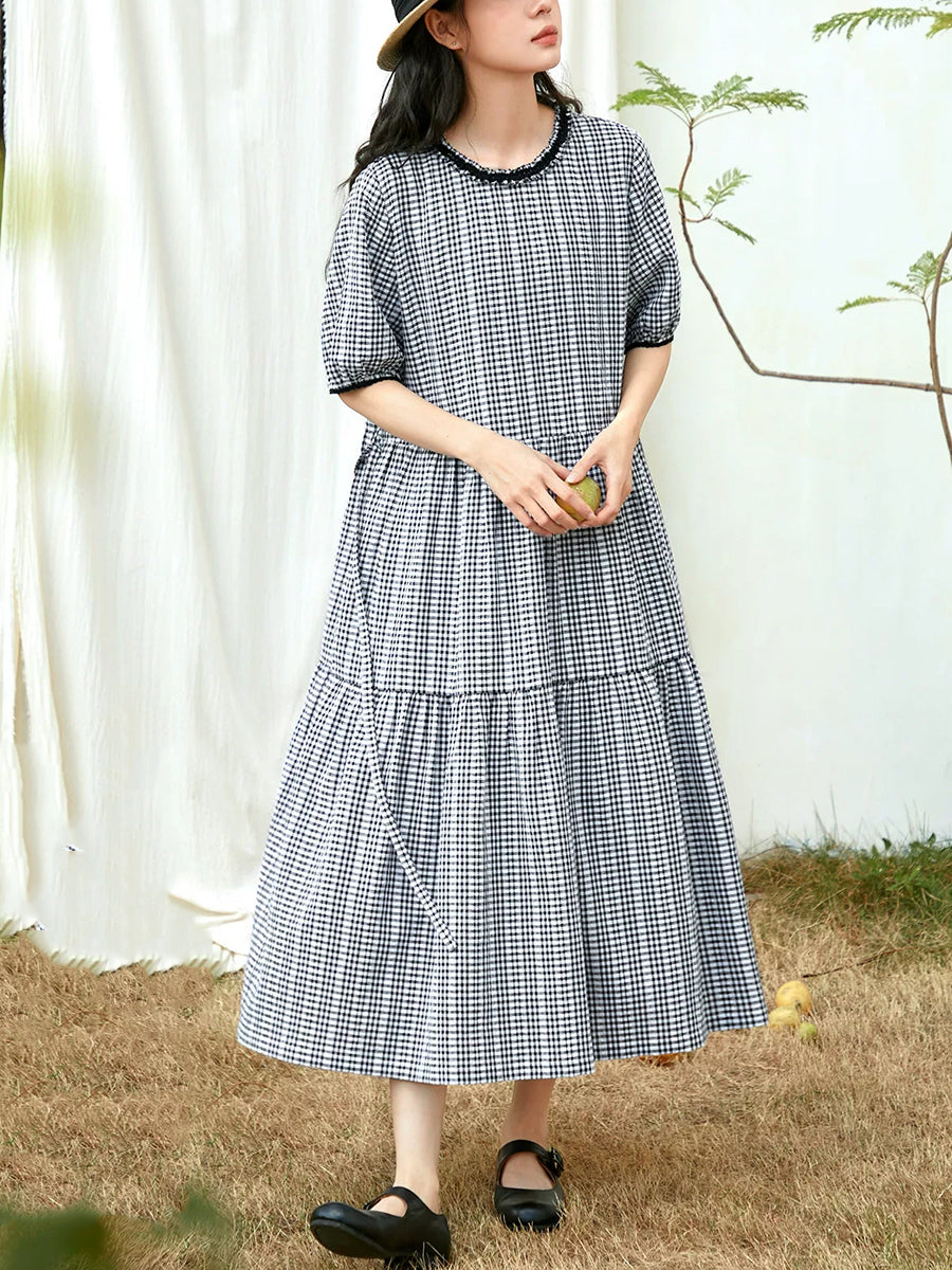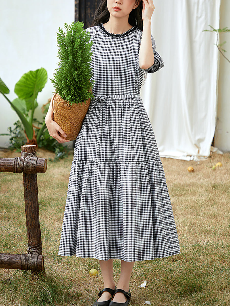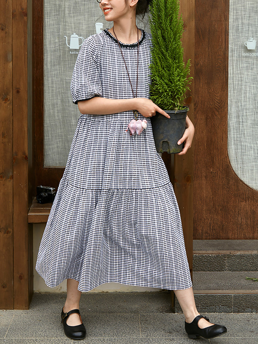 Women Summer Artsy Plaid Cotton O-Neck Dress
