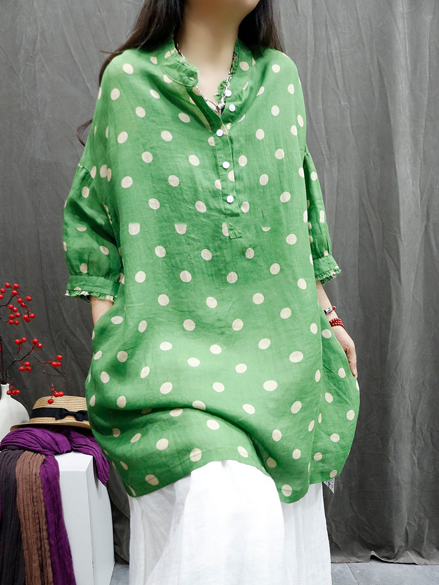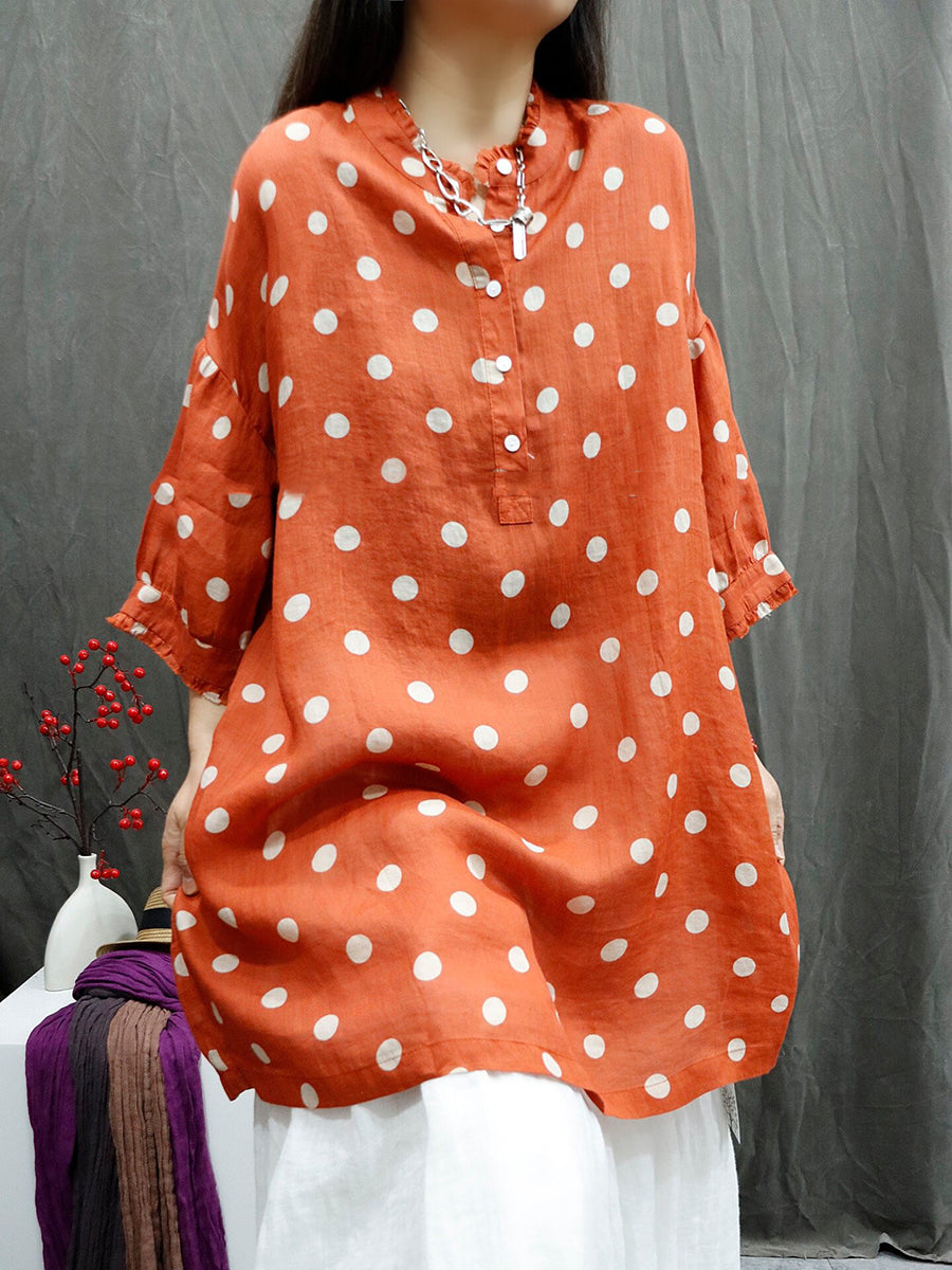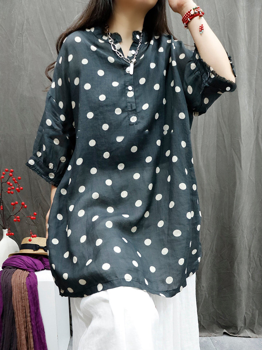 Women Summer Artsy Dot O-Neck 100%Ramie Shirt