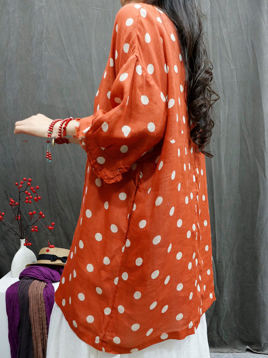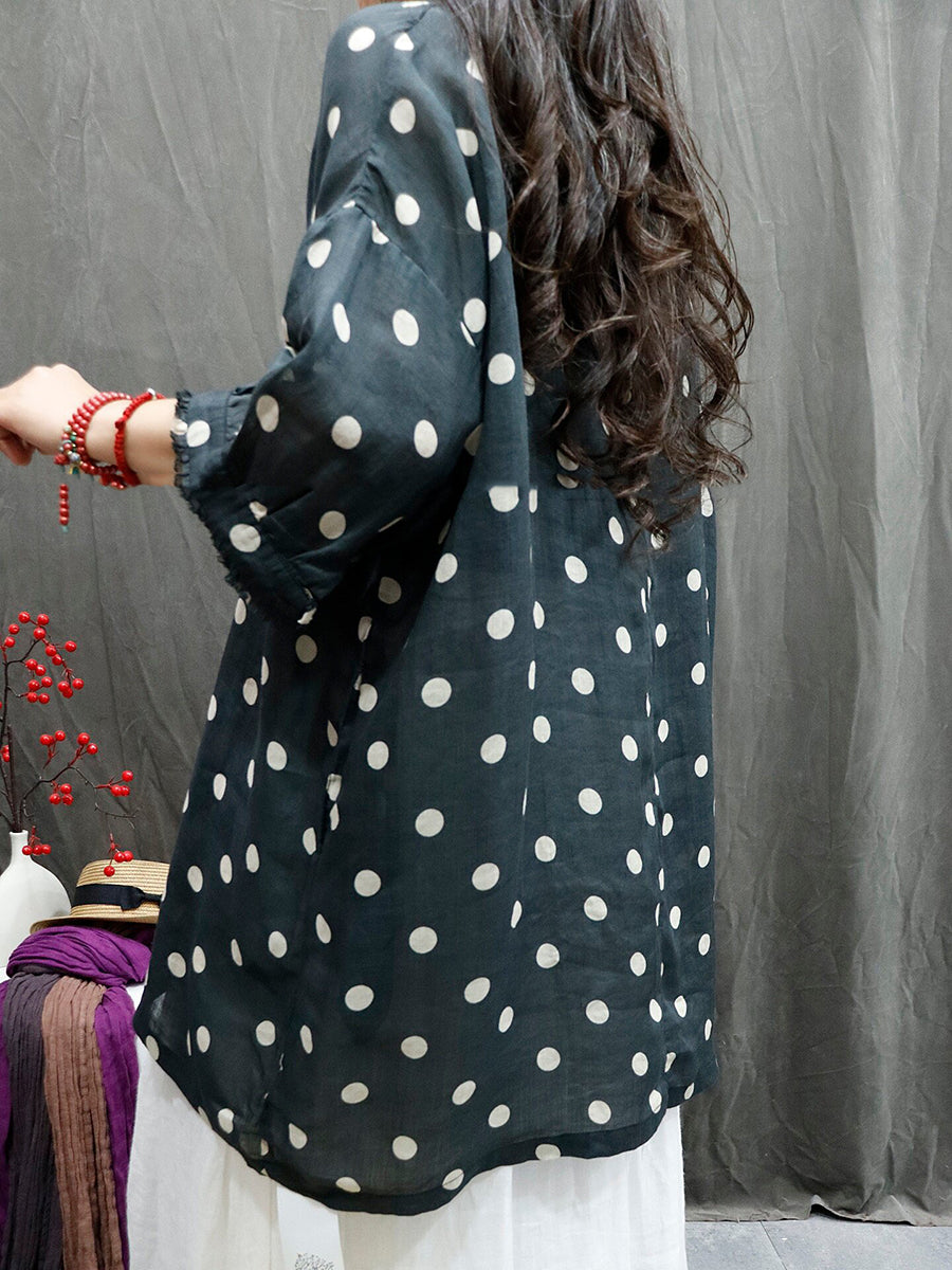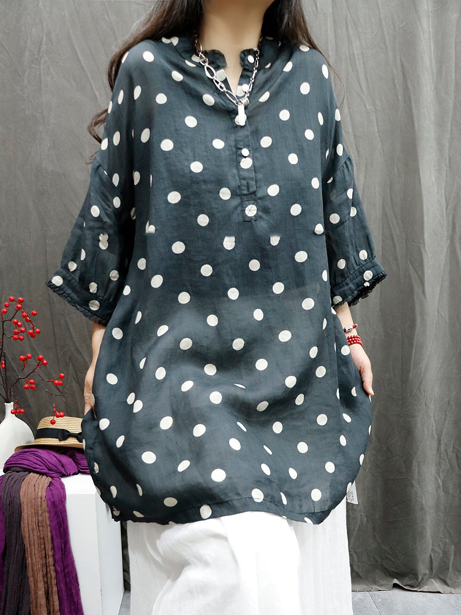 Women Summer Artsy Dot O-Neck 100%Ramie Shirt