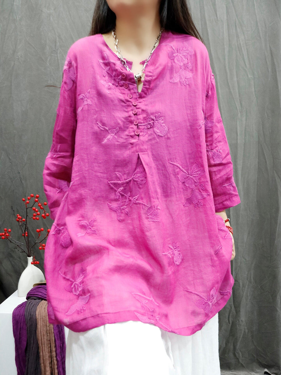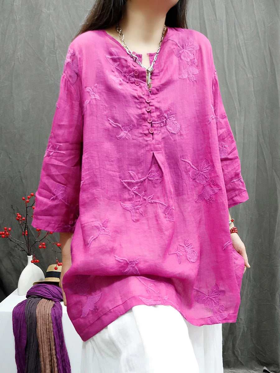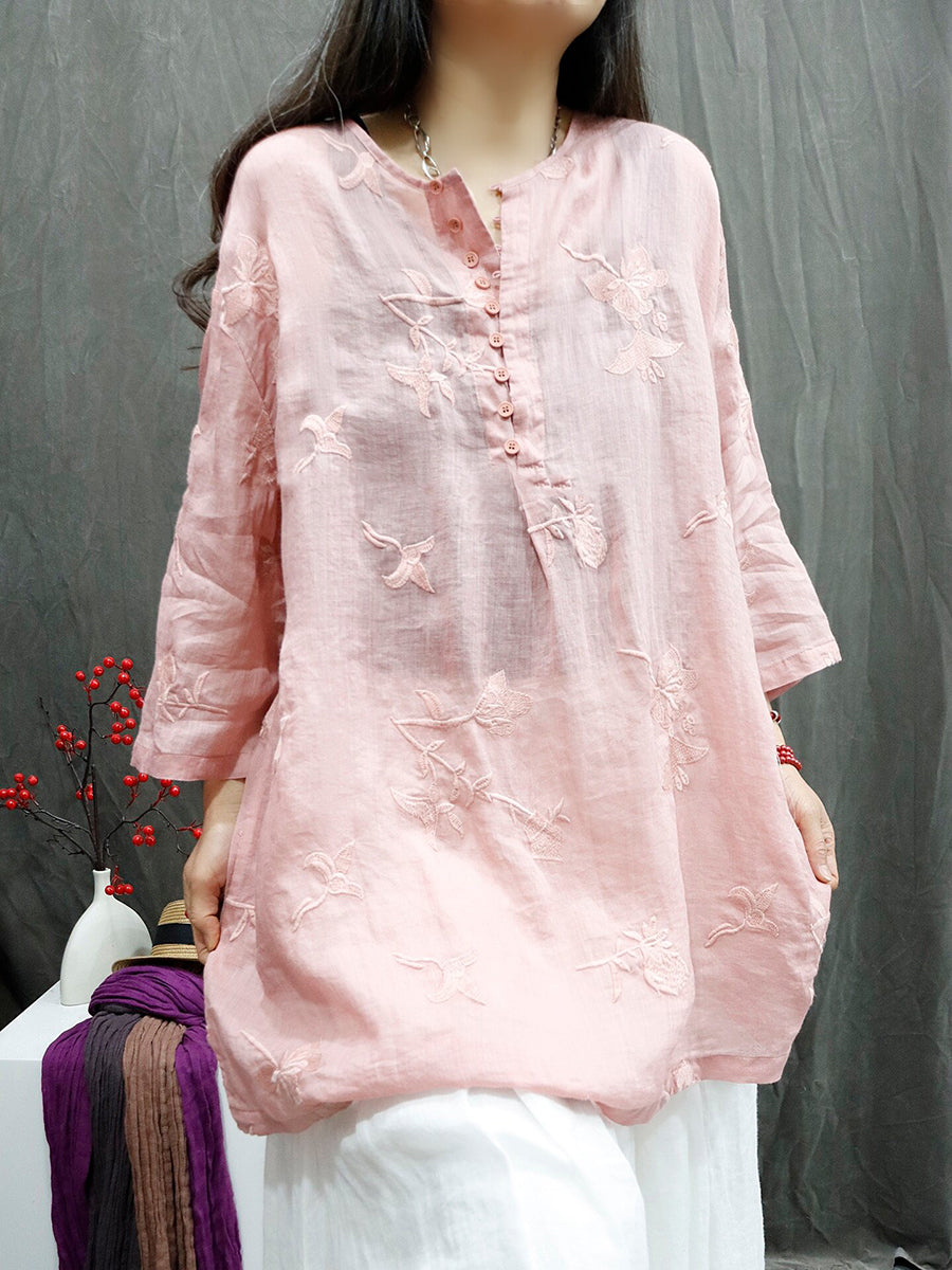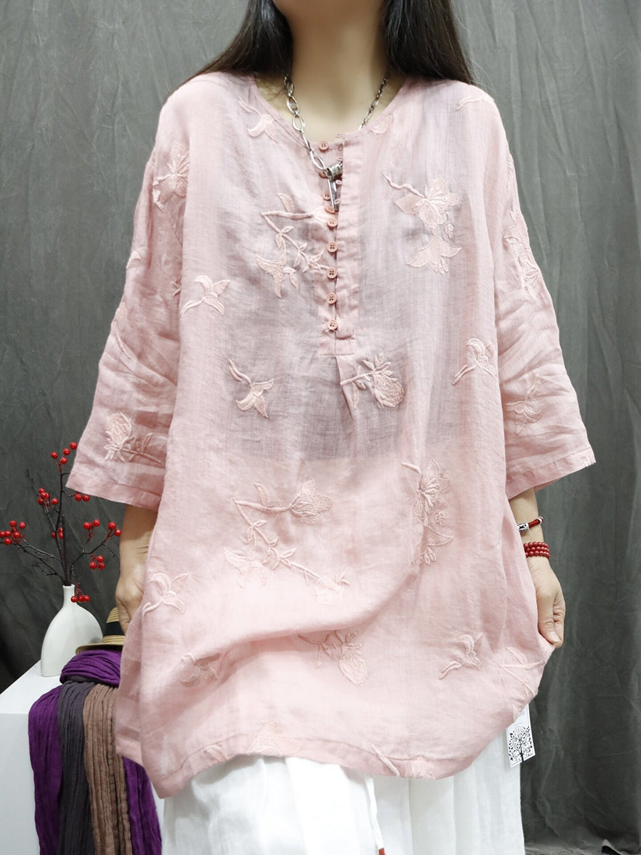 Women Summer Artsy Embroidery O-Neck Ramie Shirt