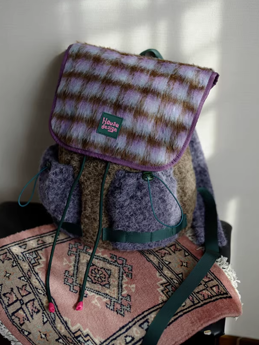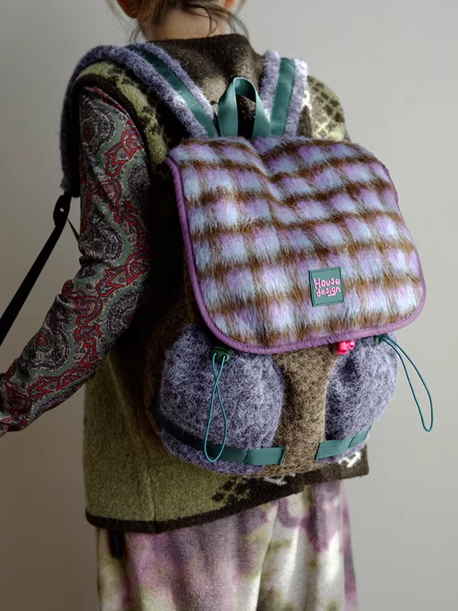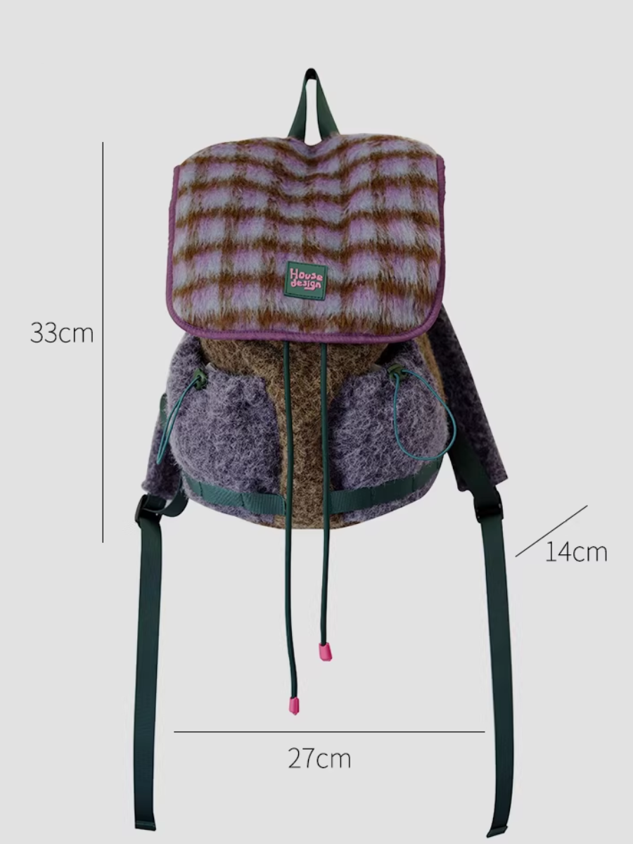 Retro Fluffy Purple Plaids Spliced Backpack