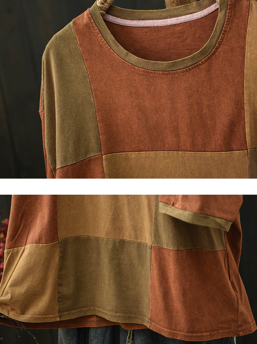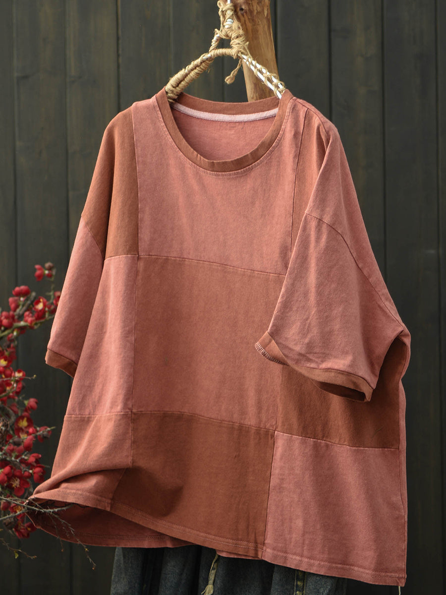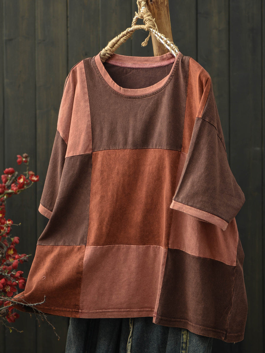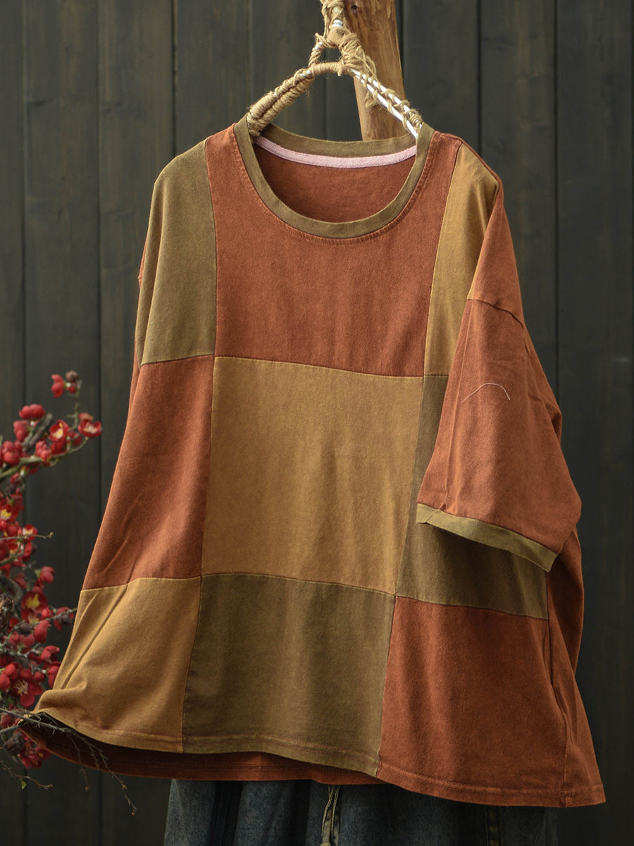 Women Summer Retro Patchwork O-Neck T-Shirt