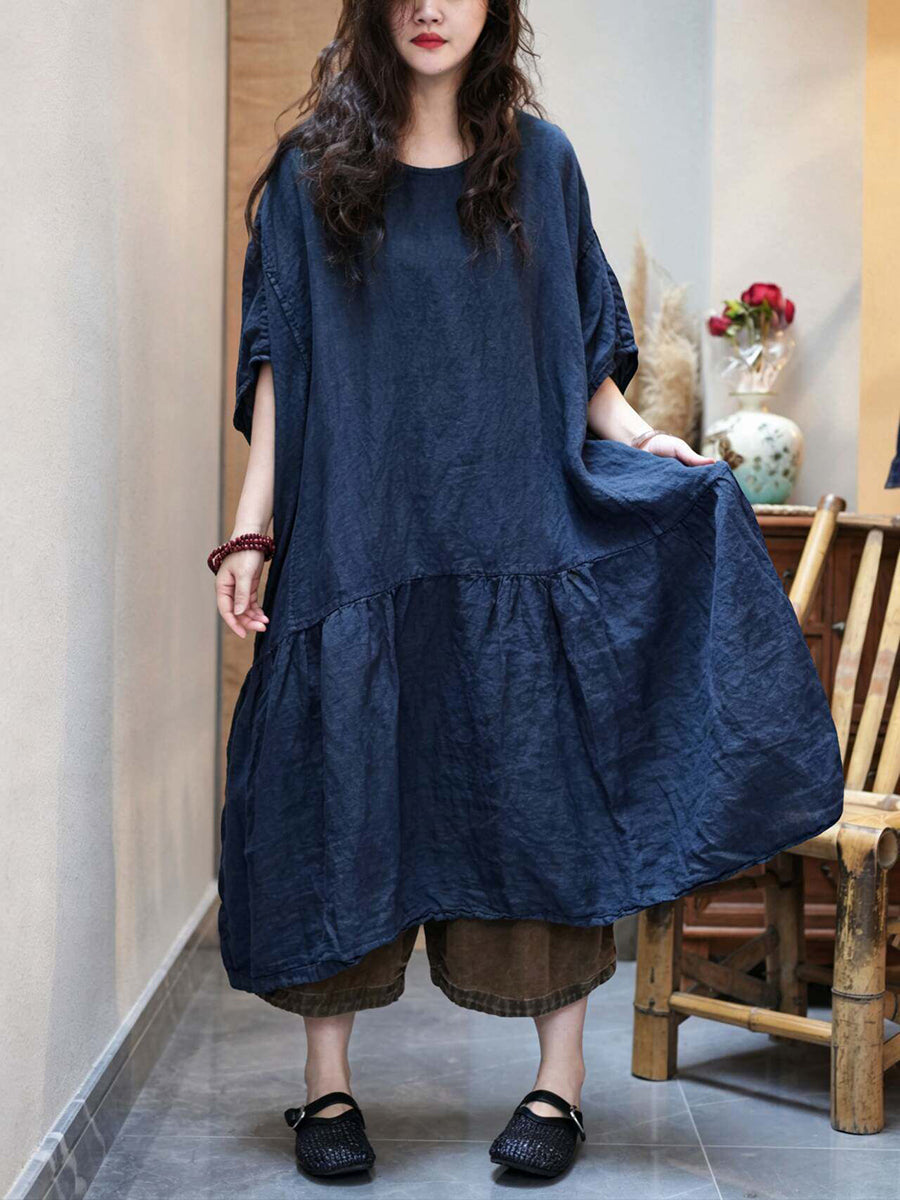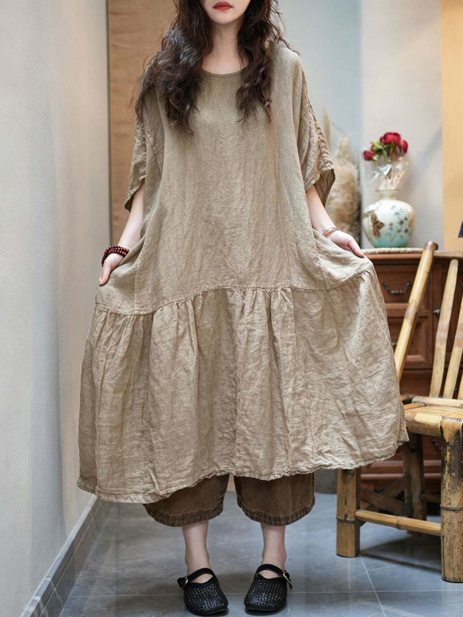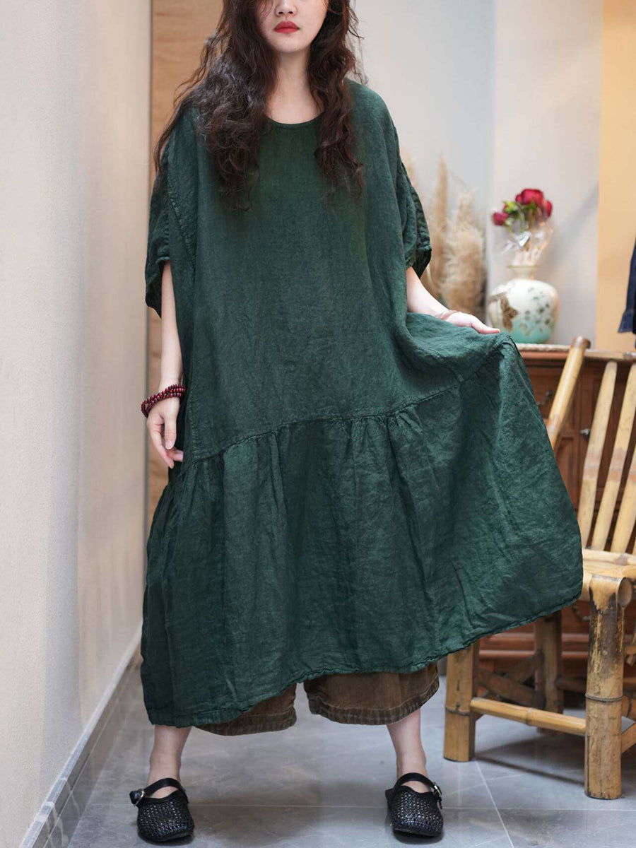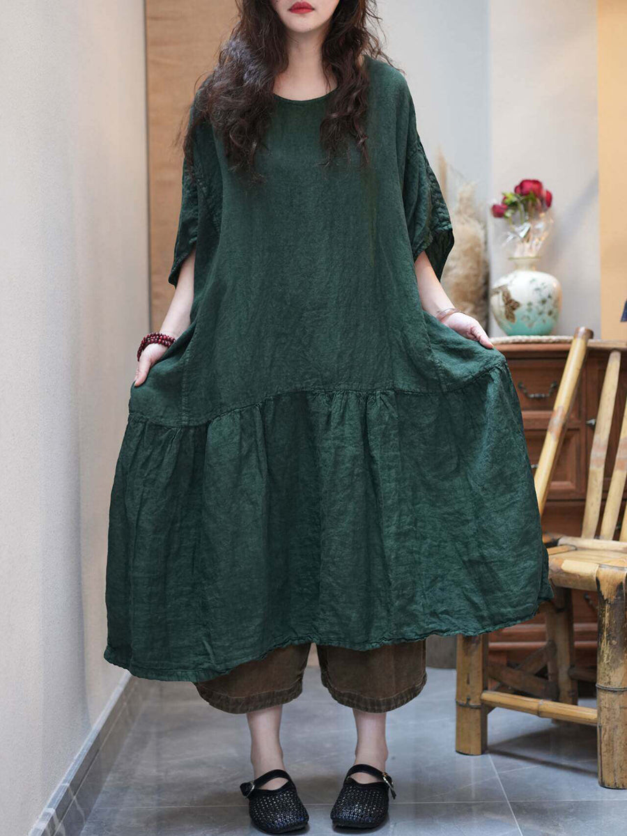 Women Summer Retro Pure Color Linen O-Neck Dress