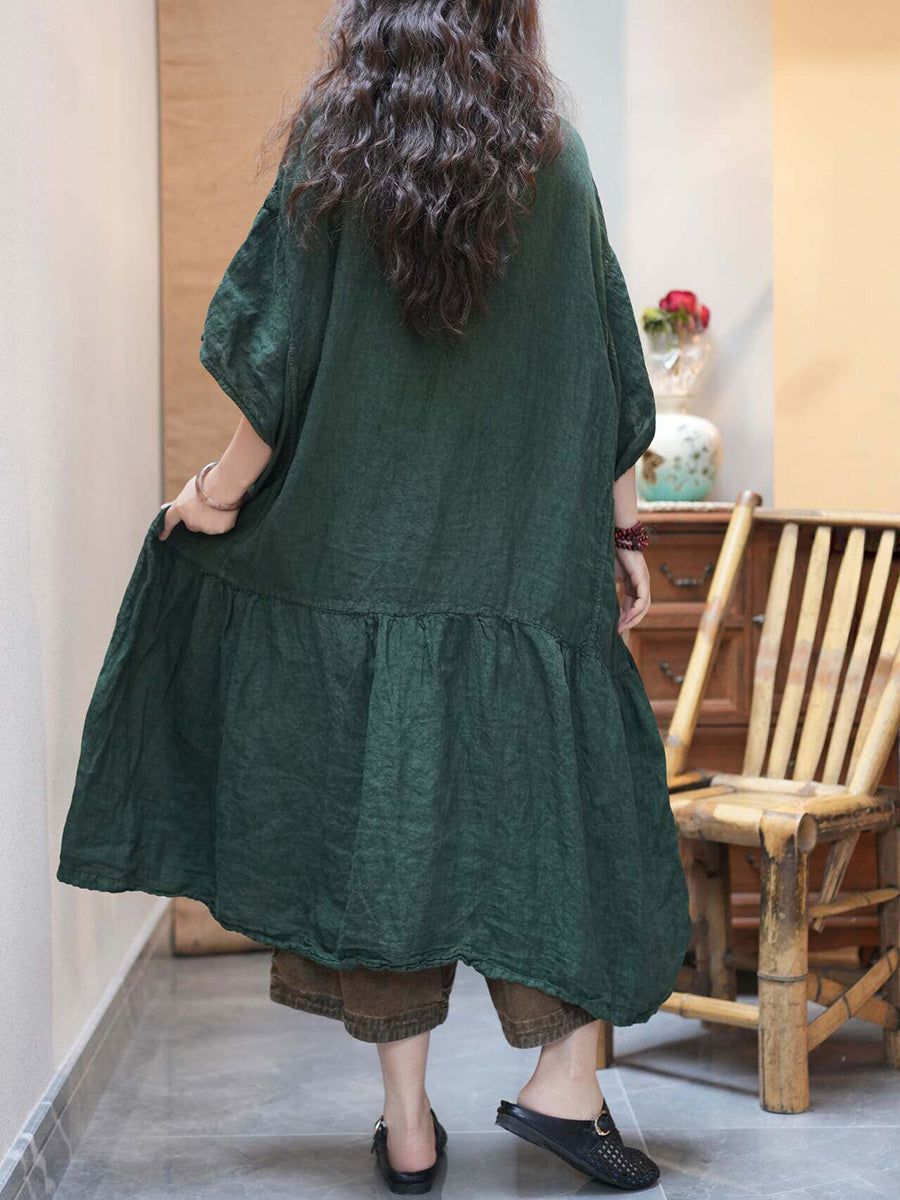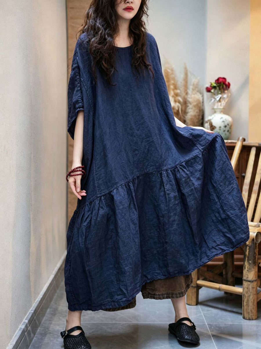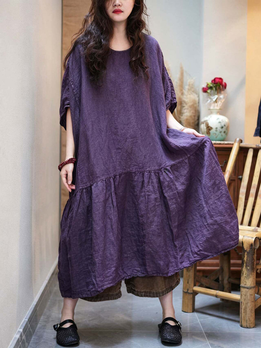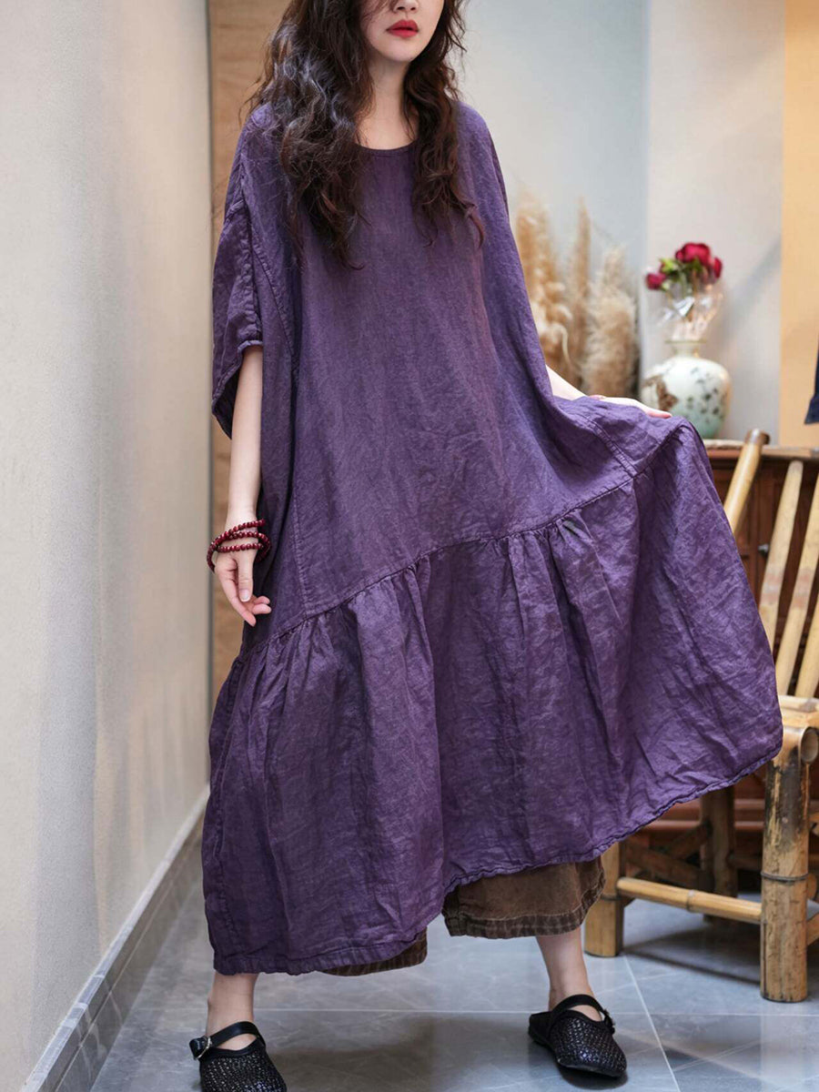 Women Summer Retro Pure Color Linen O-Neck Dress