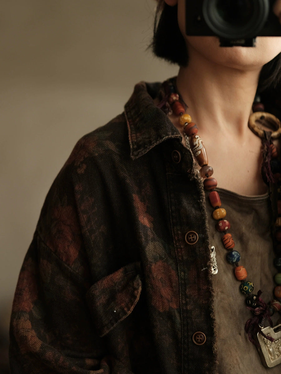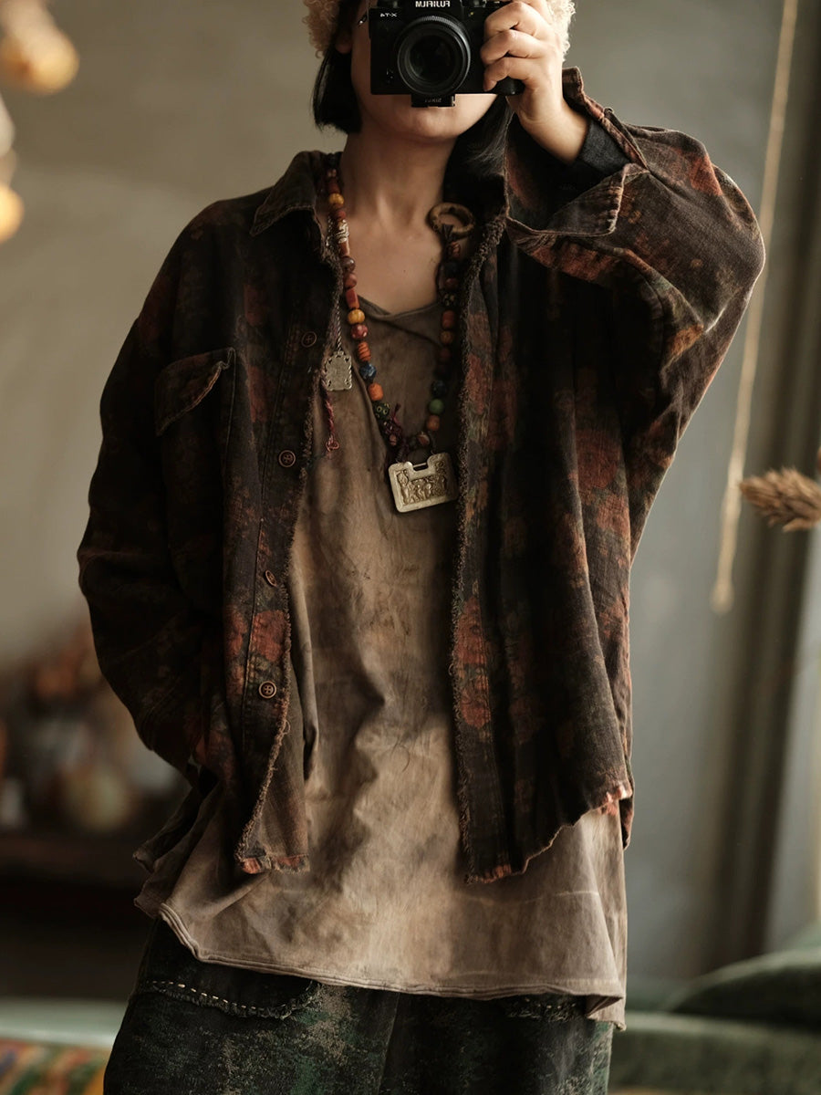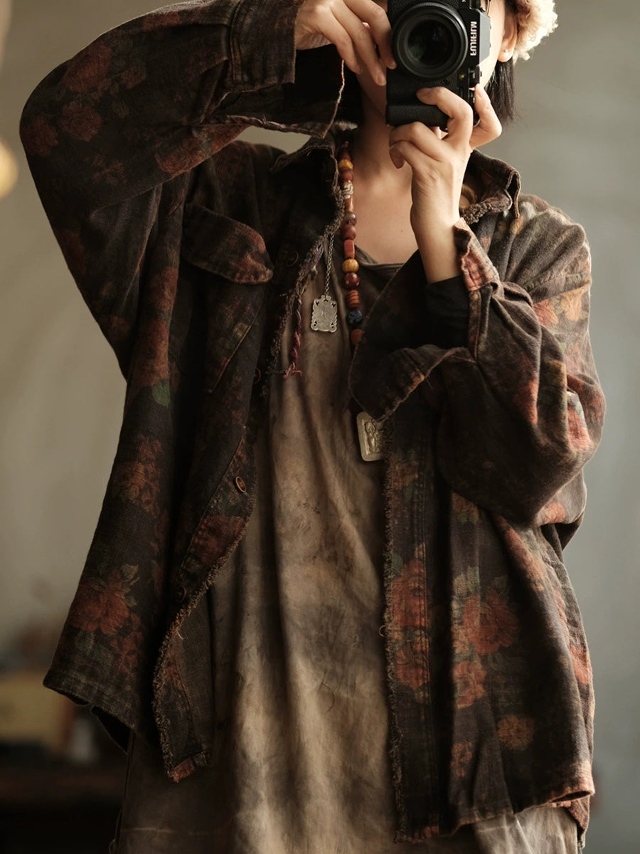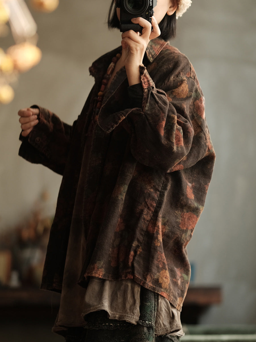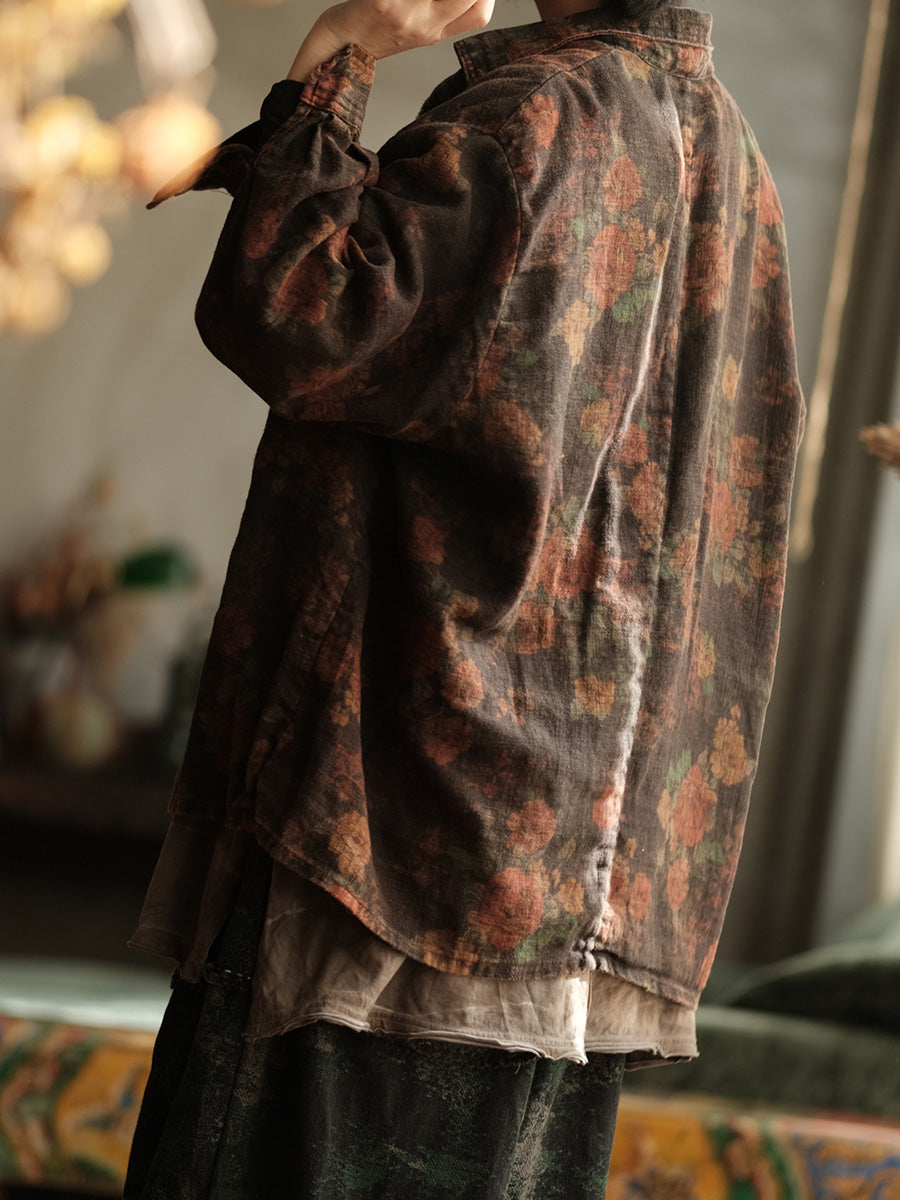Women Retro Autumn Flower Turn-down Collar Linen Shirt