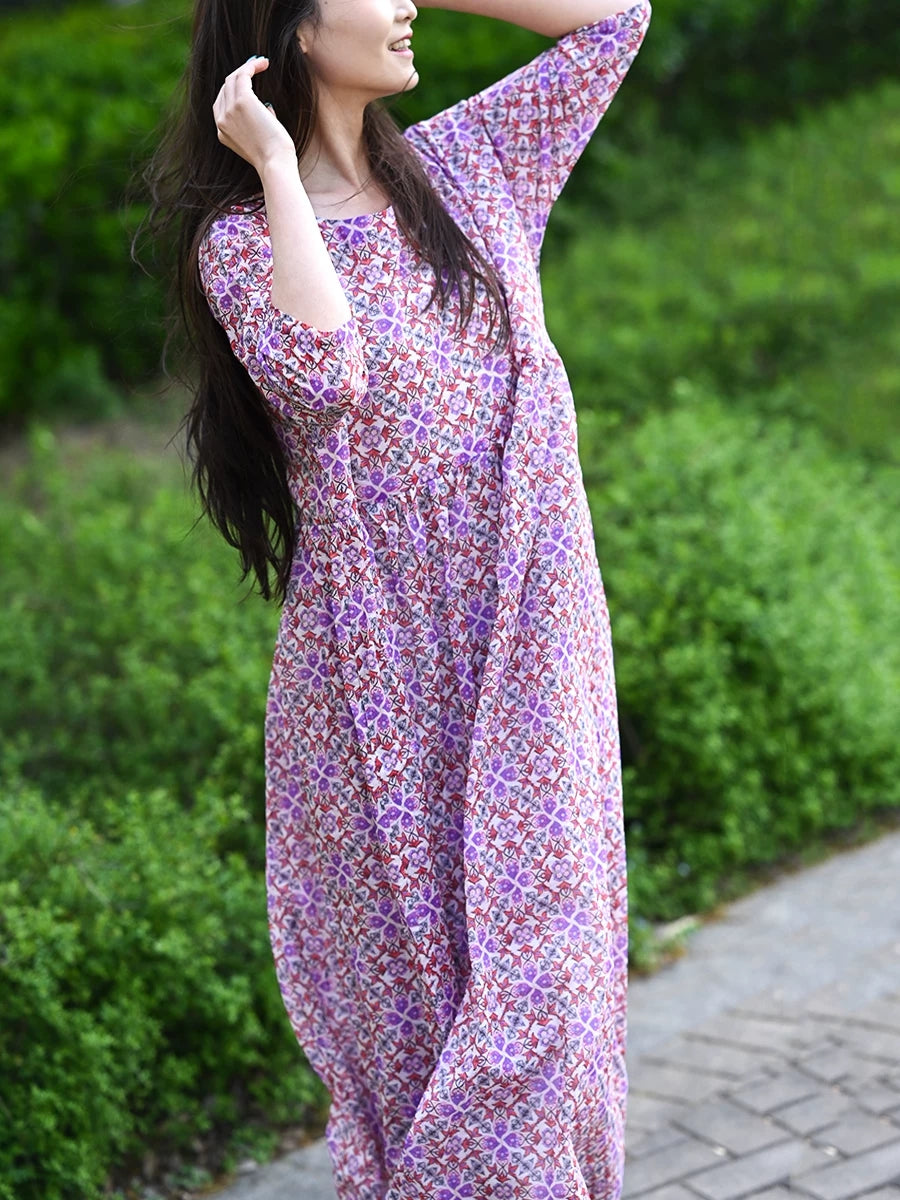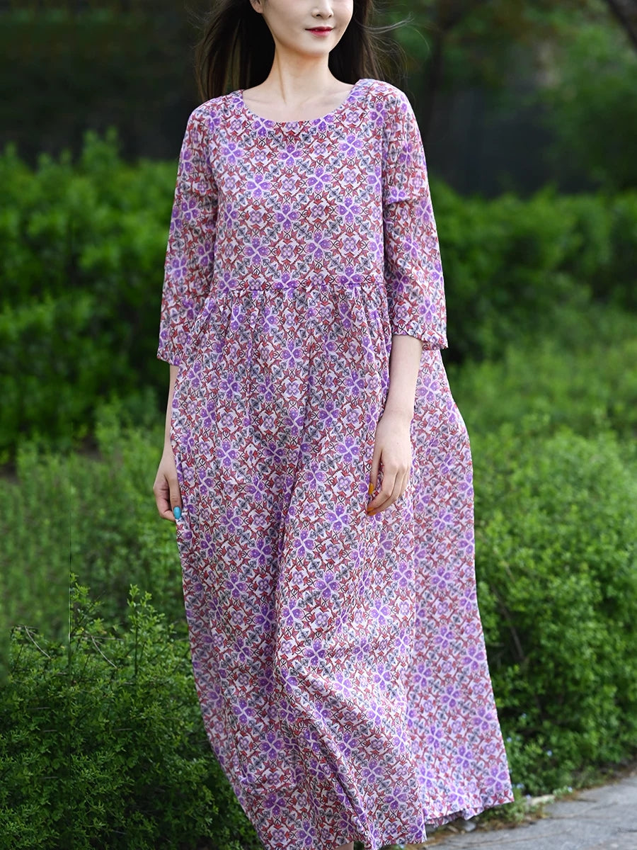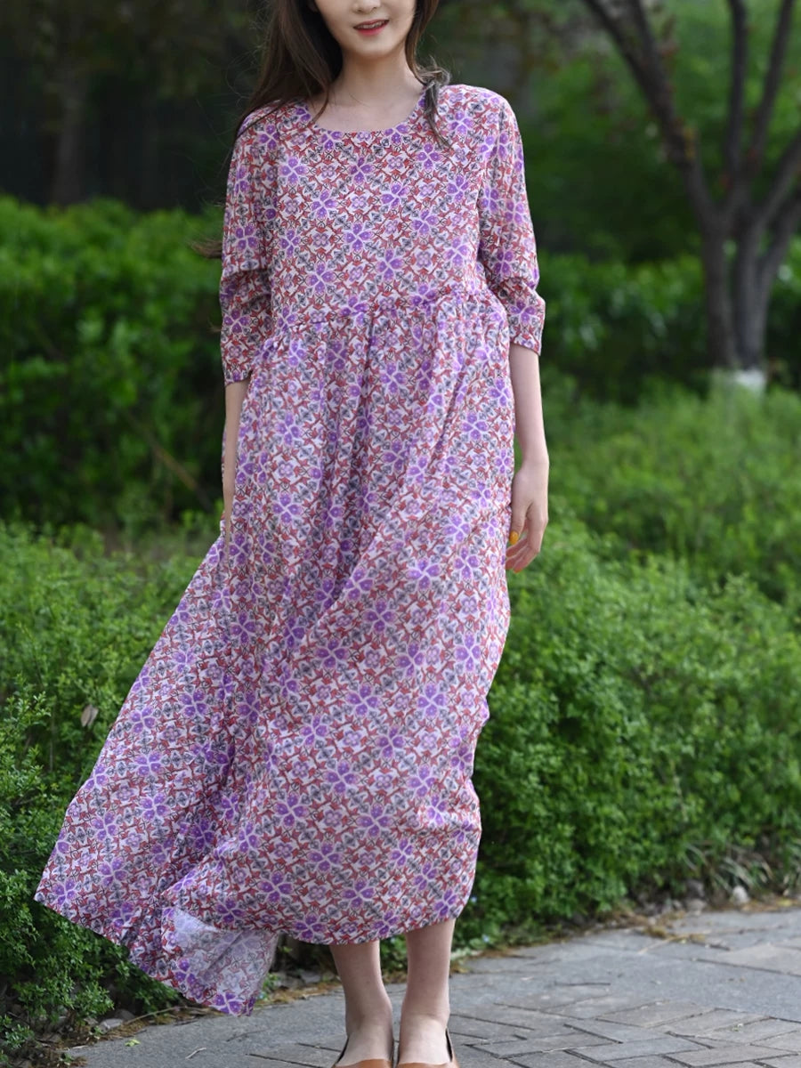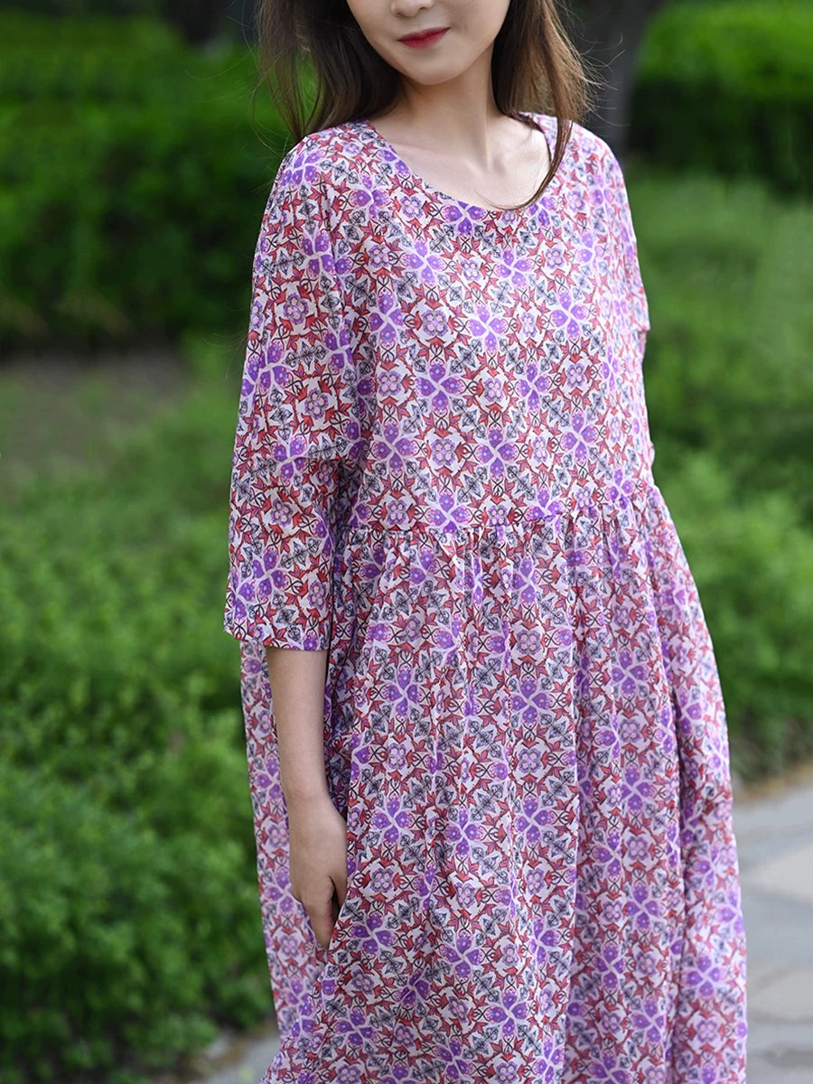 Women Summer Artsy Floral 100%Cotton O-Neck Dress