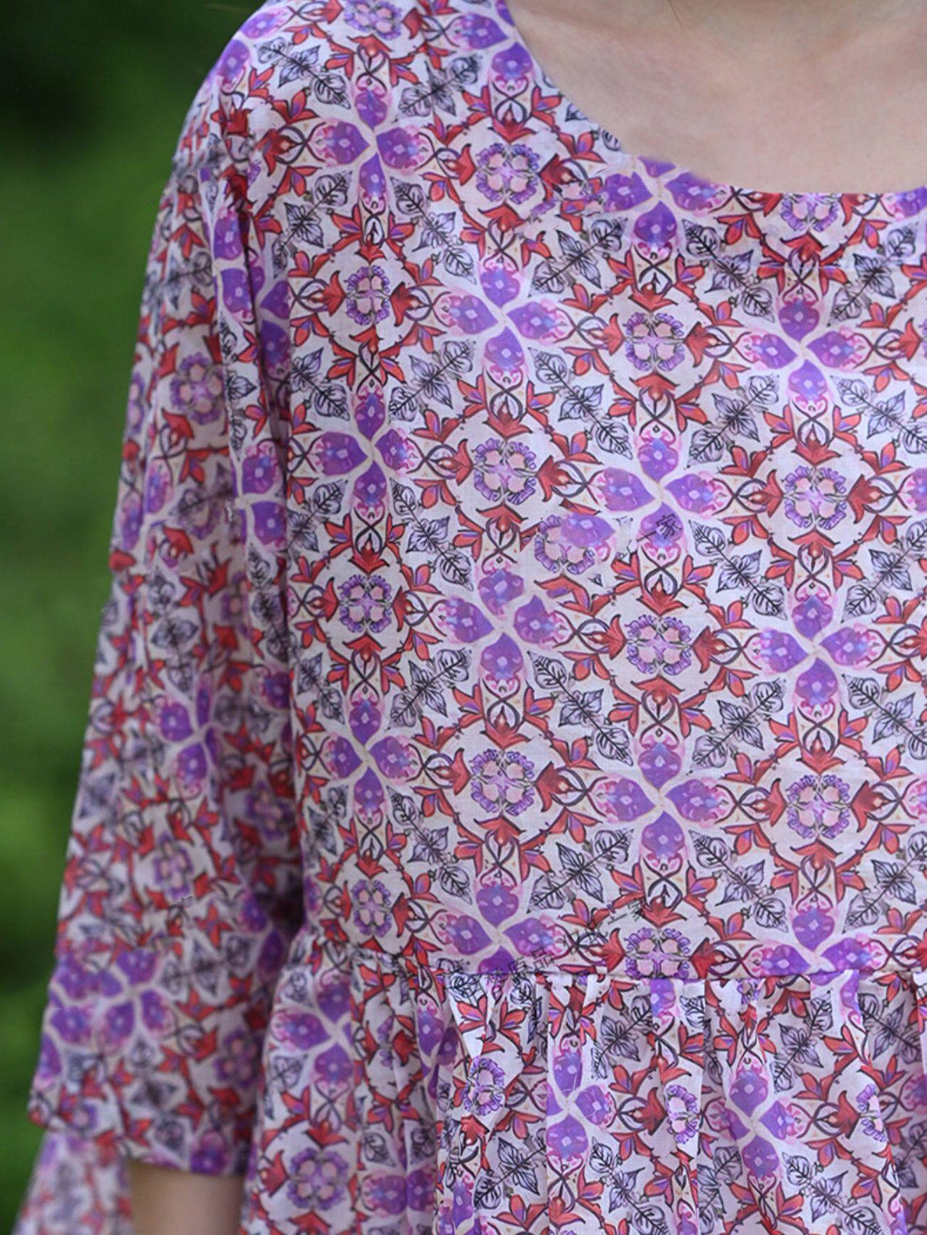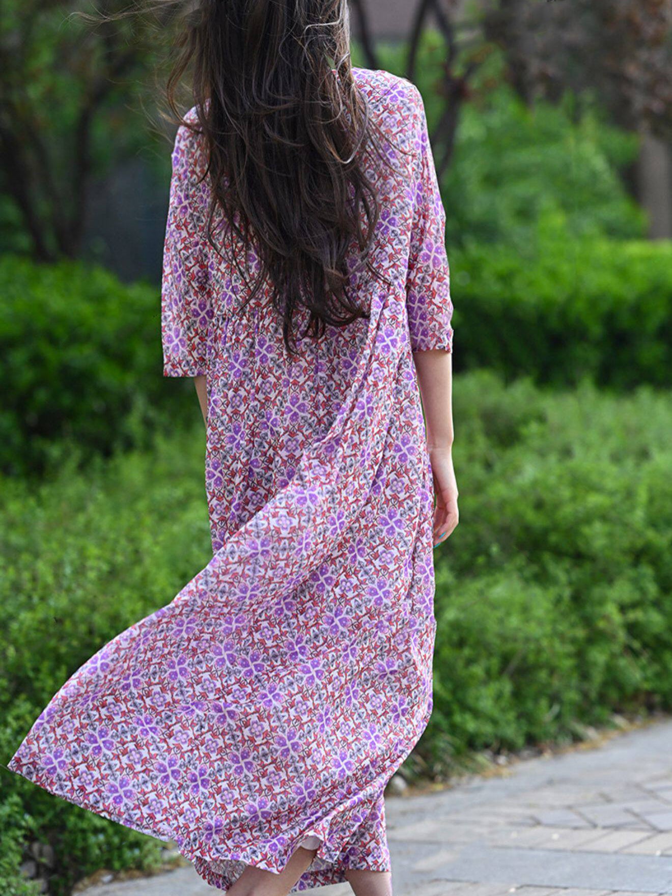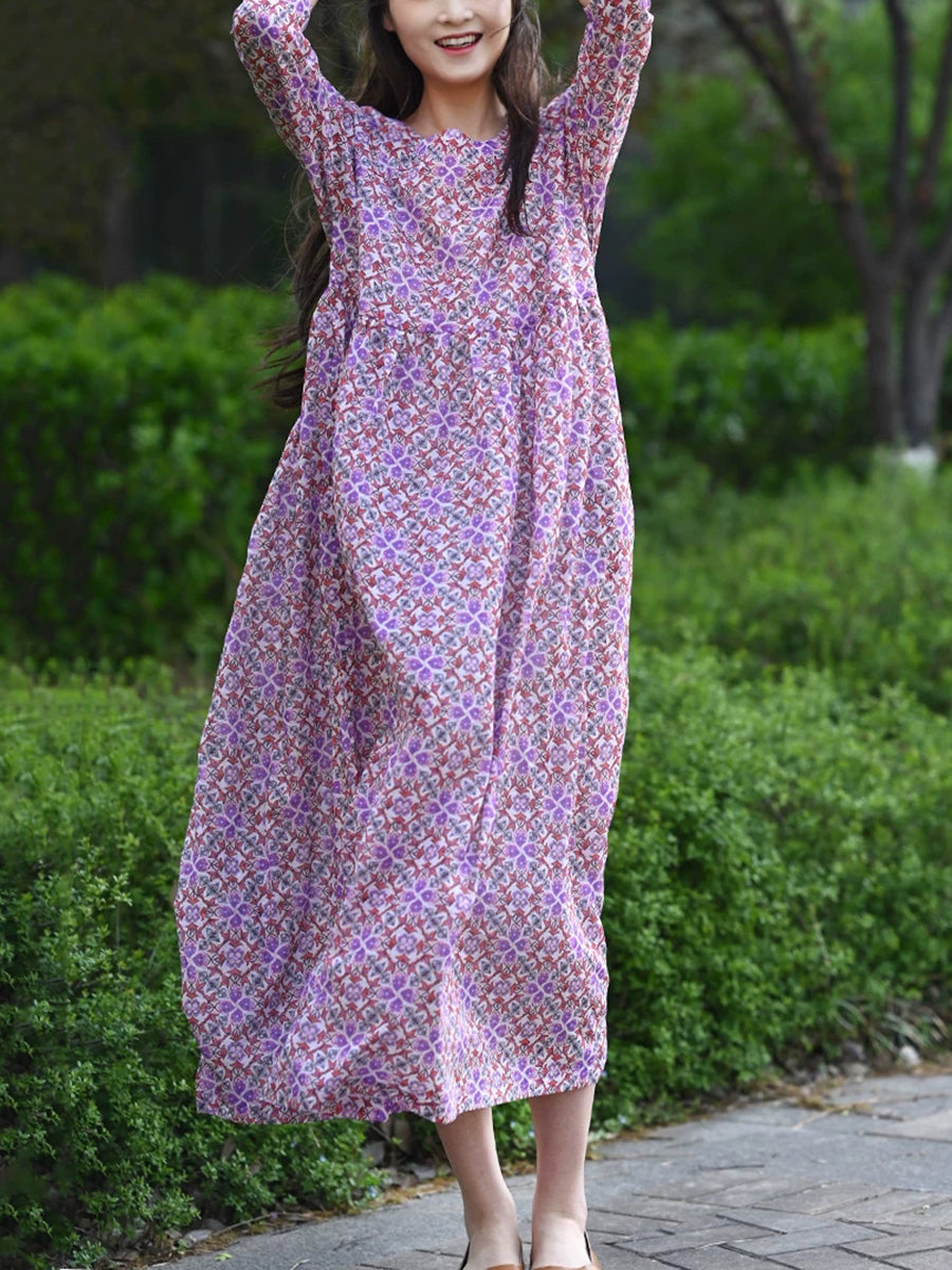 Women Summer Artsy Floral 100%Cotton O-Neck Dress