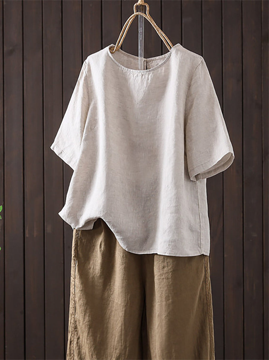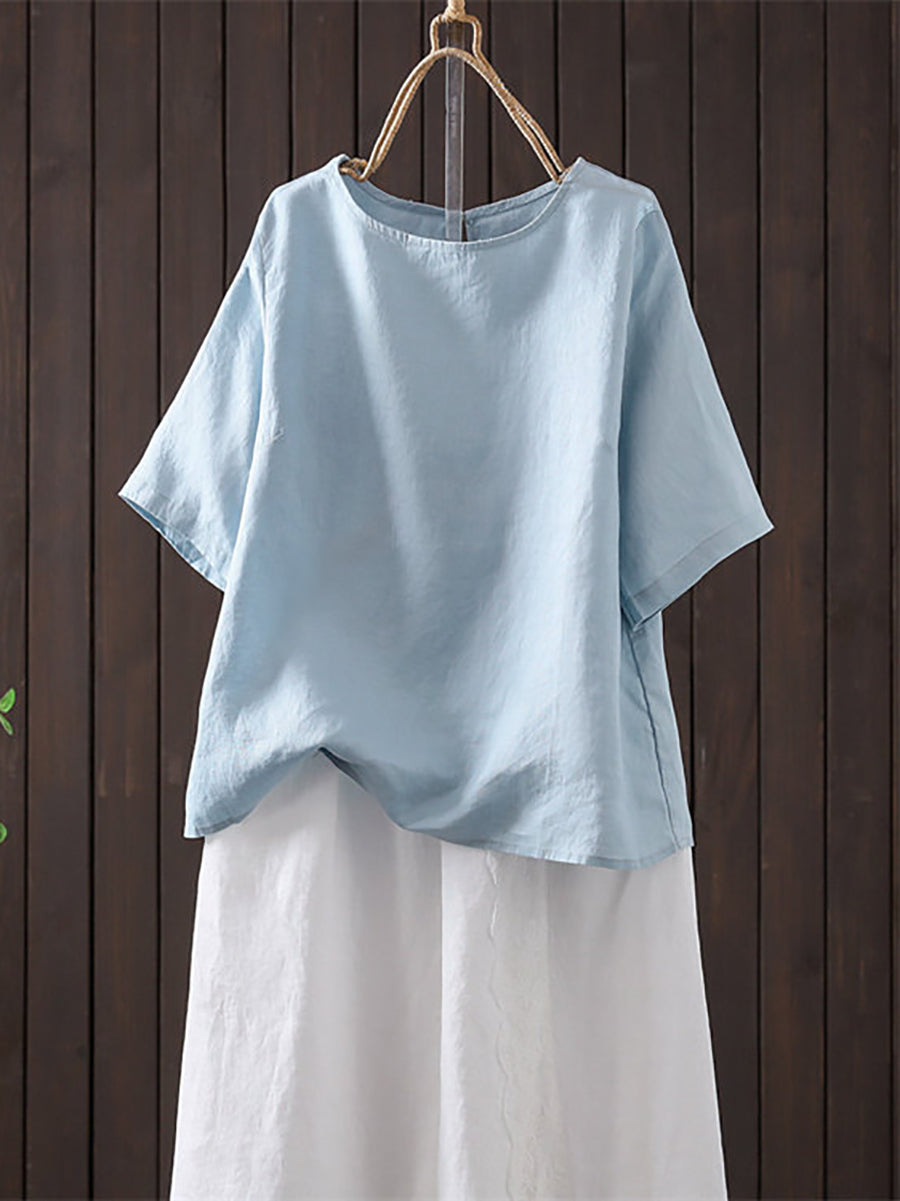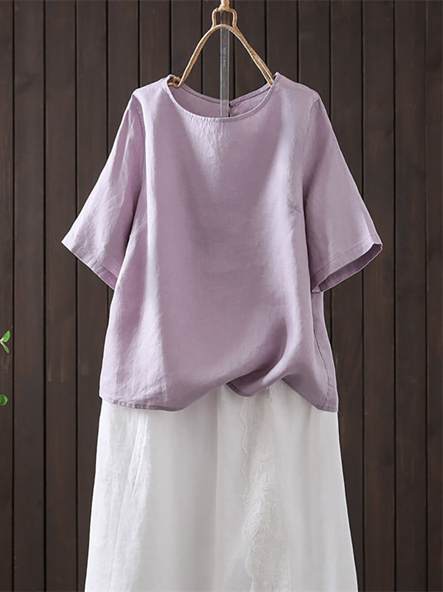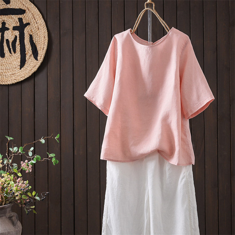 Women Summer Artsy O-Neck Pure Color Linen Blouse