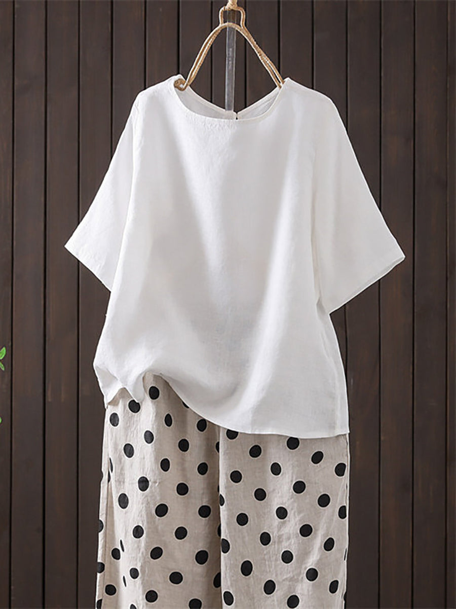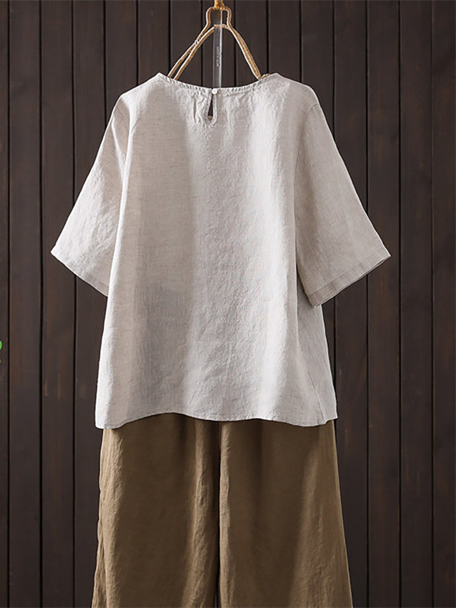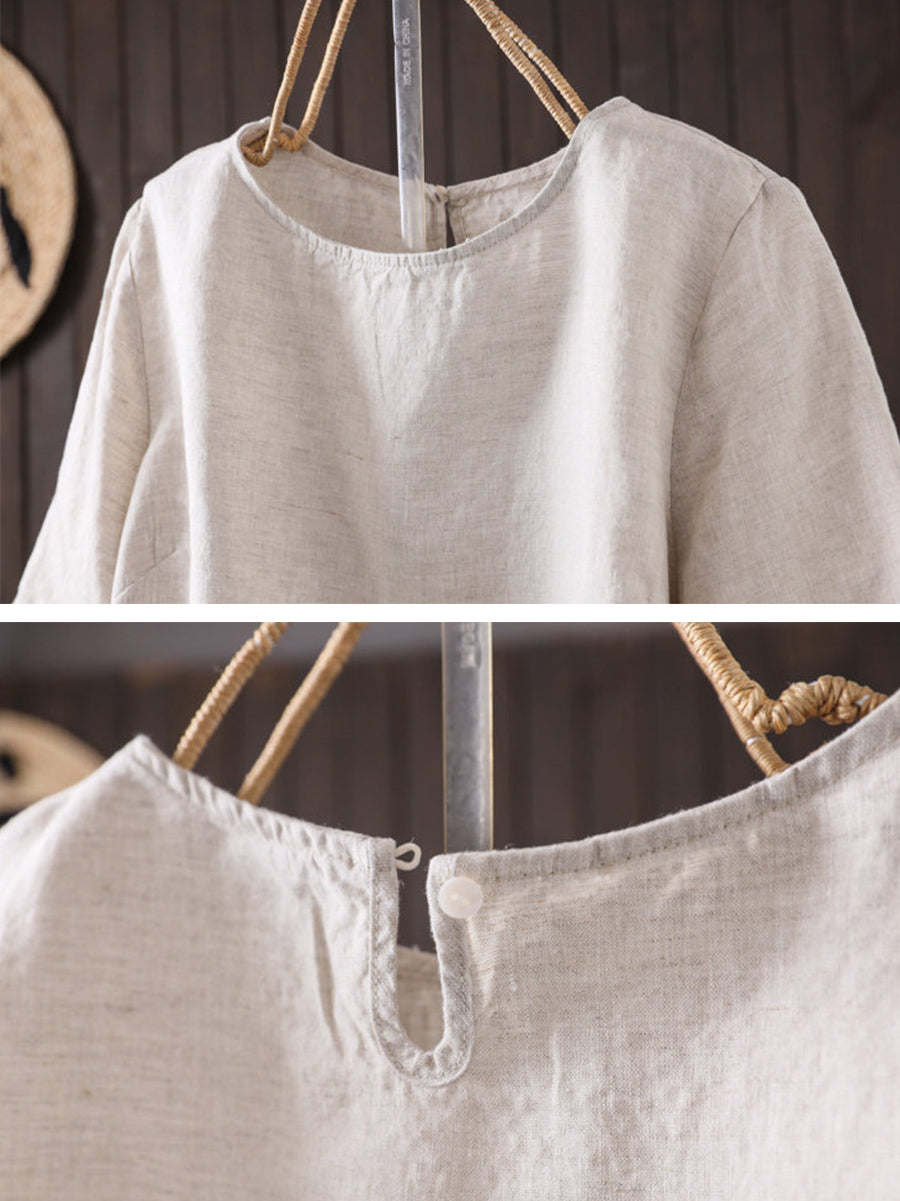 Women Summer Artsy O-Neck Pure Color Linen Blouse