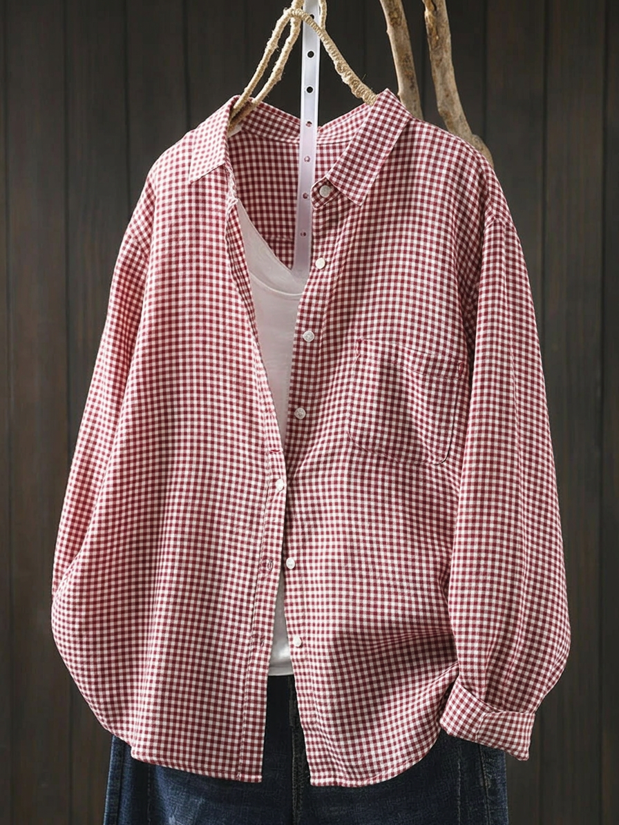 Plus Size Women Lattice Linen Cotton Turn-down Collar Shirt