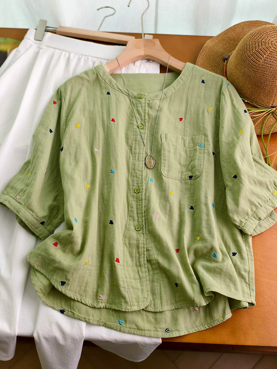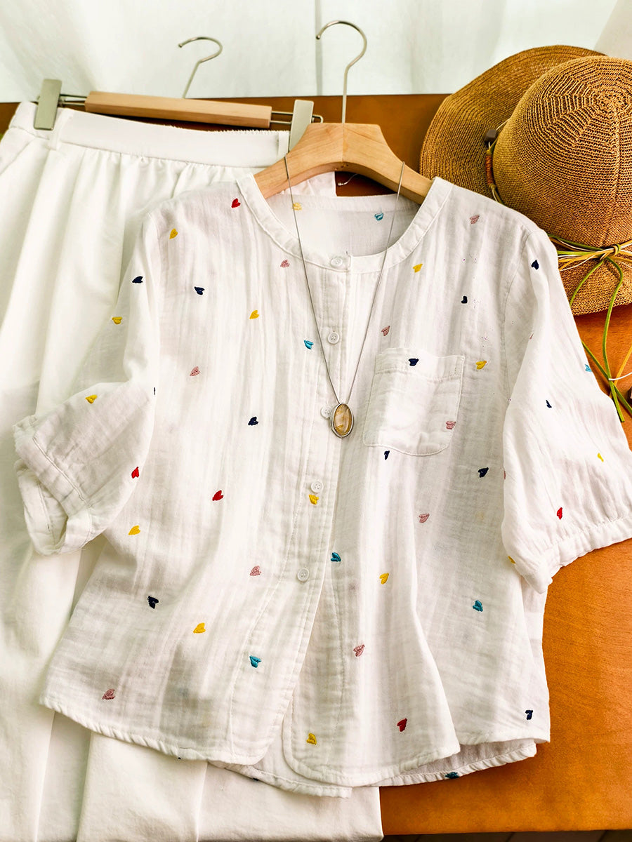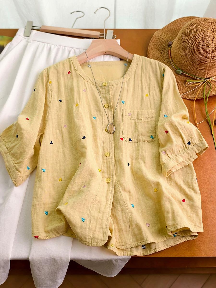 Women Summer Artsy Heart Embroidery 100%Cotton Shirt