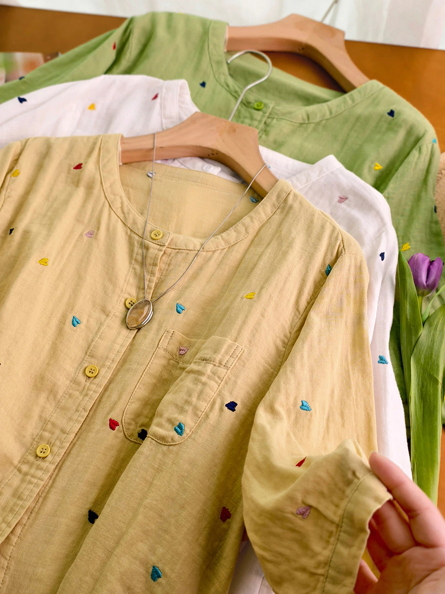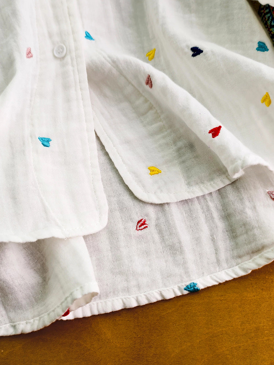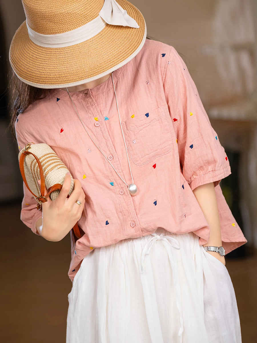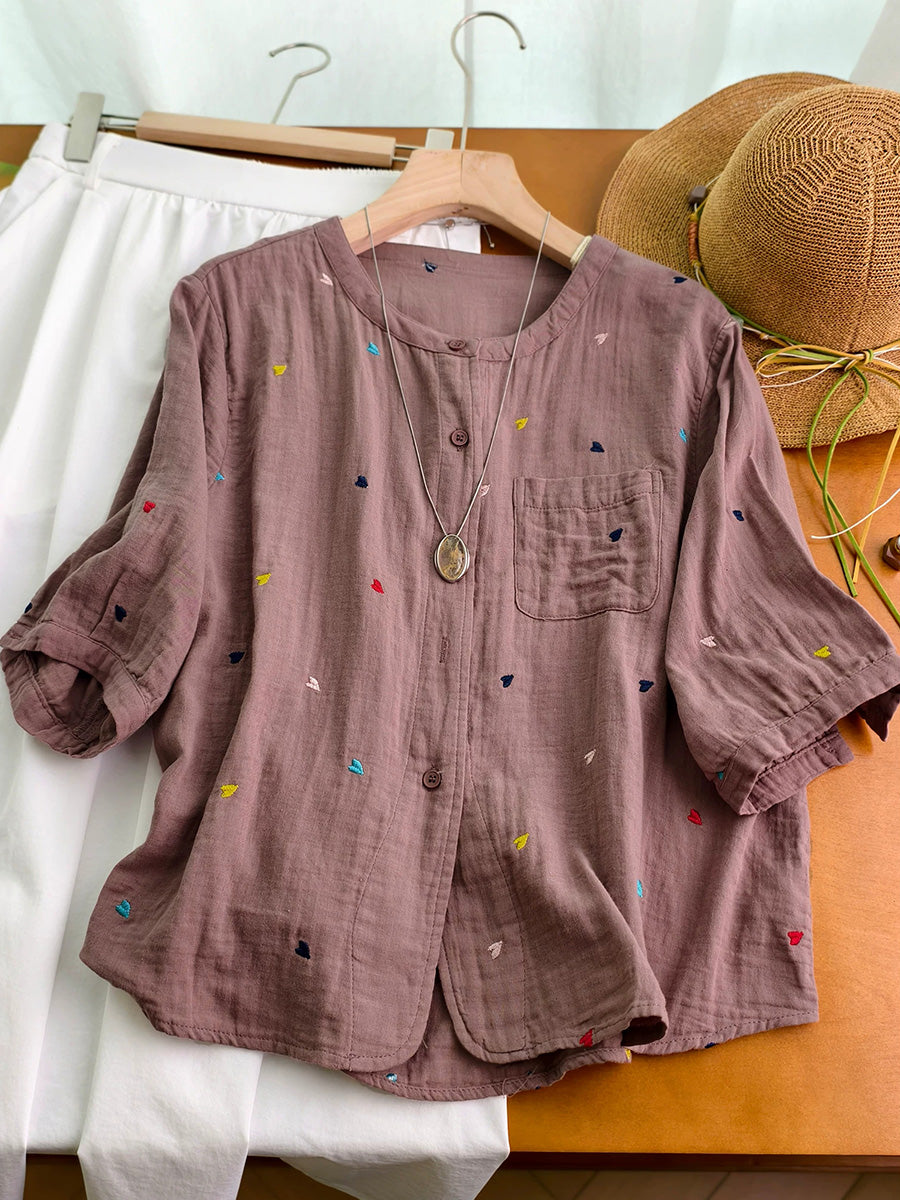 Women Summer Artsy Heart Embroidery 100%Cotton Shirt