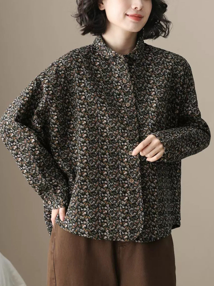 Women Artsy Autumn Floral Turn-down Collar Cotton Shirt