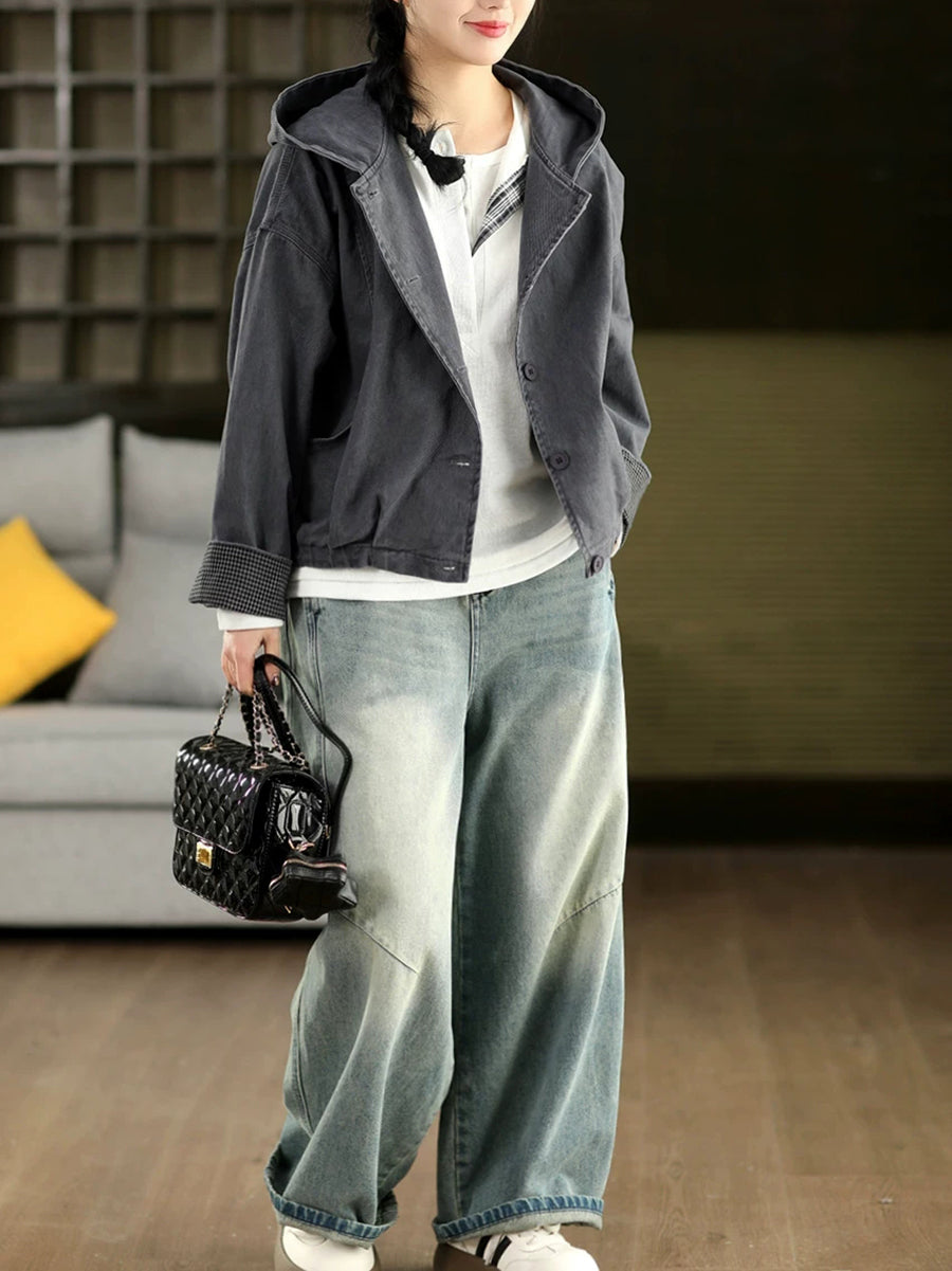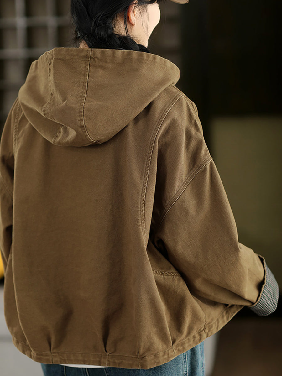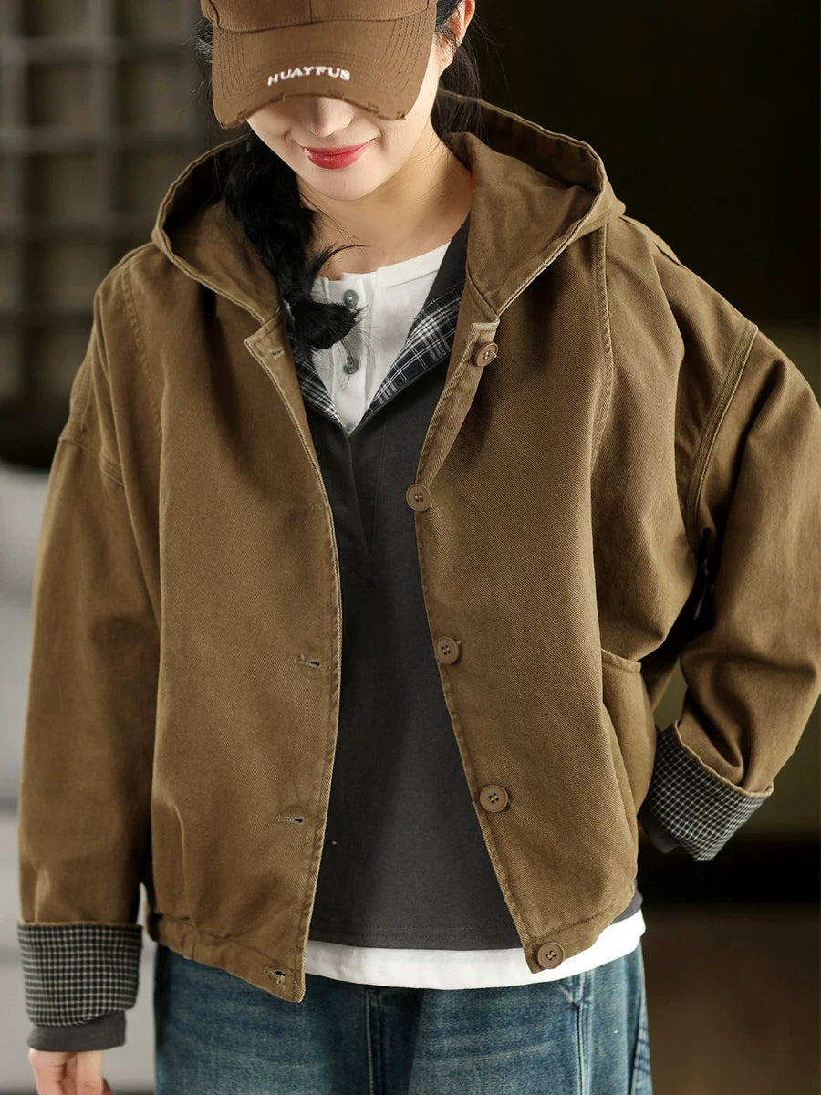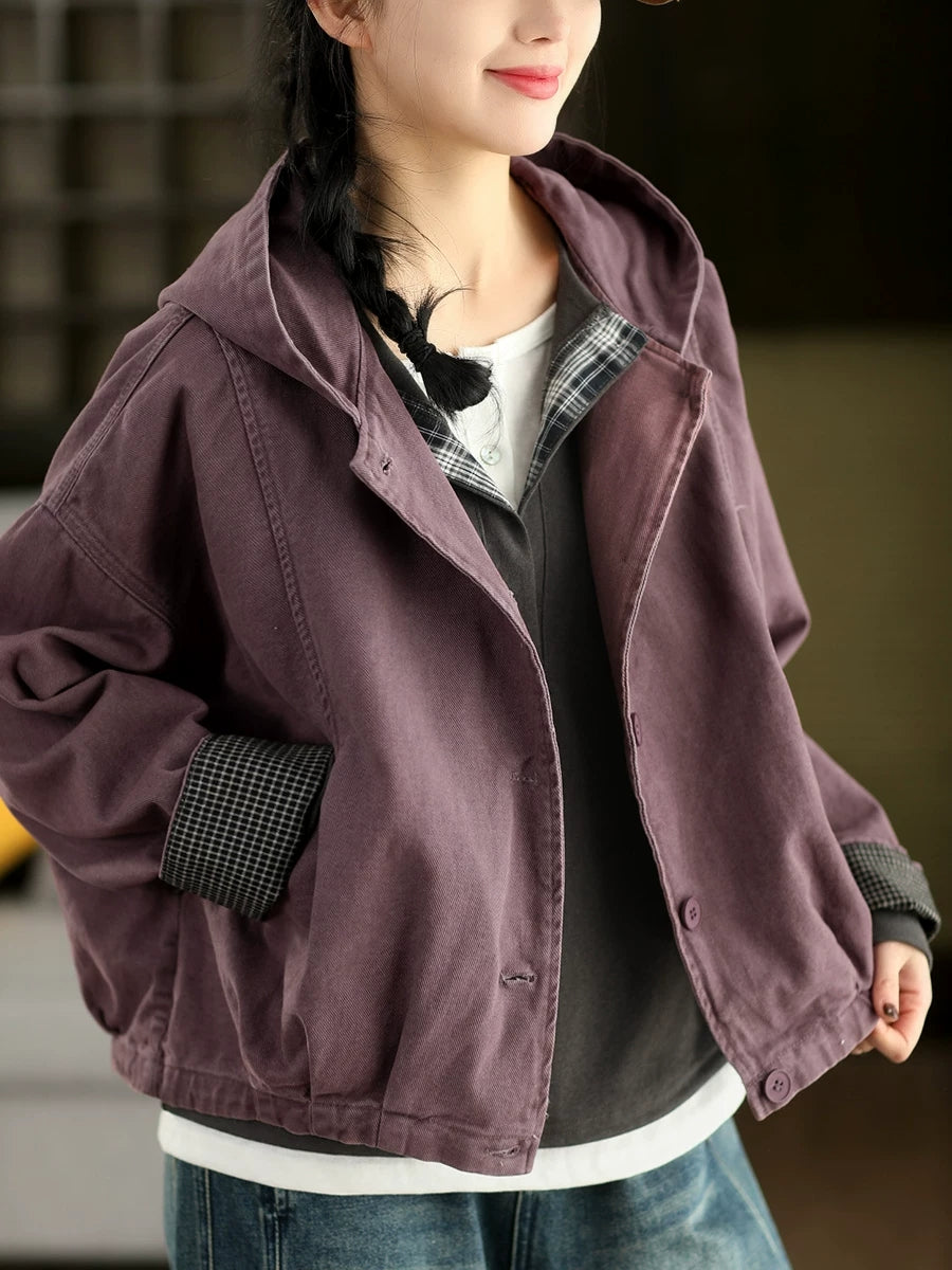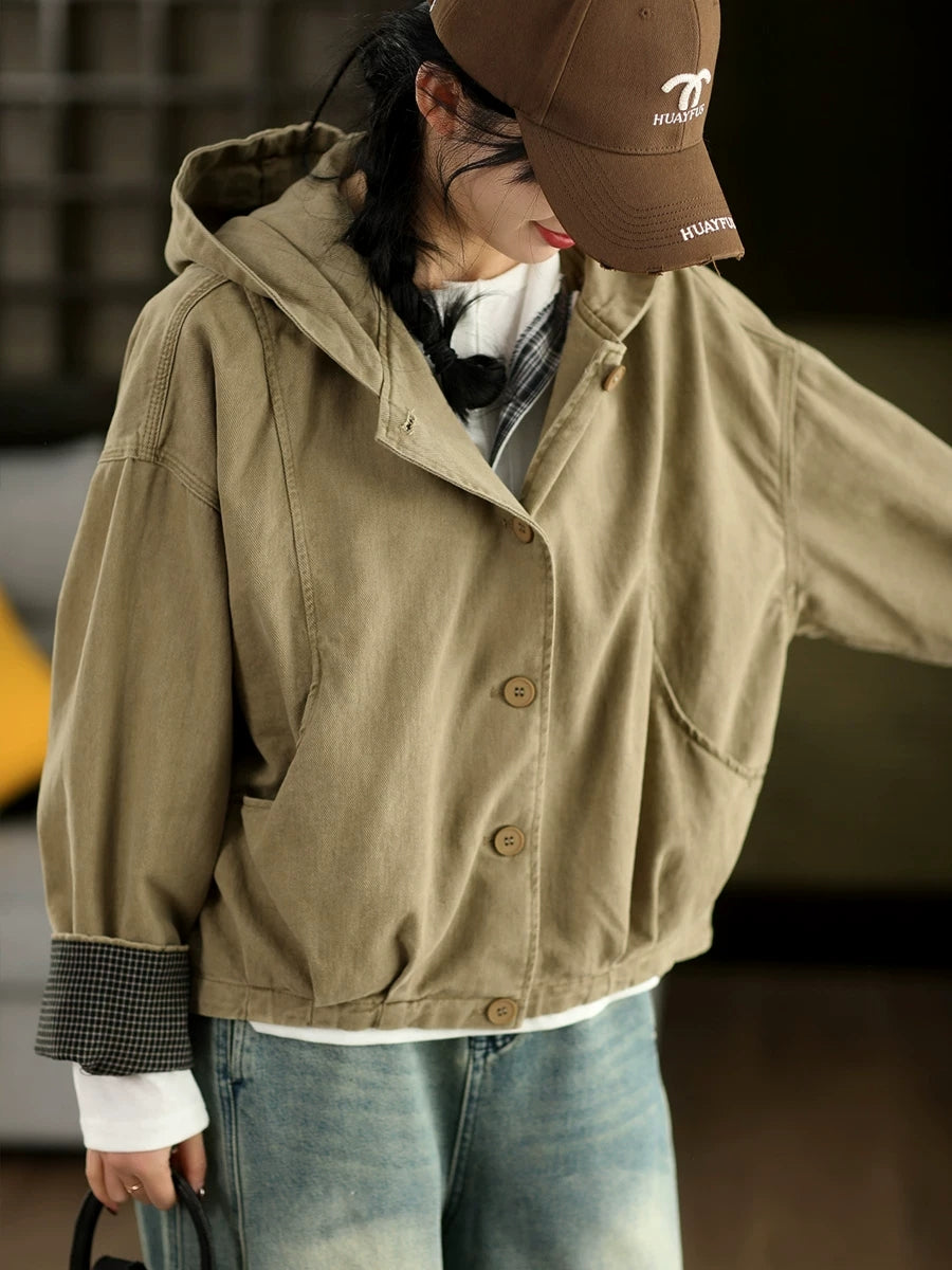 Women Spring Casual Pure Color 100%Cotton Hooded Coat