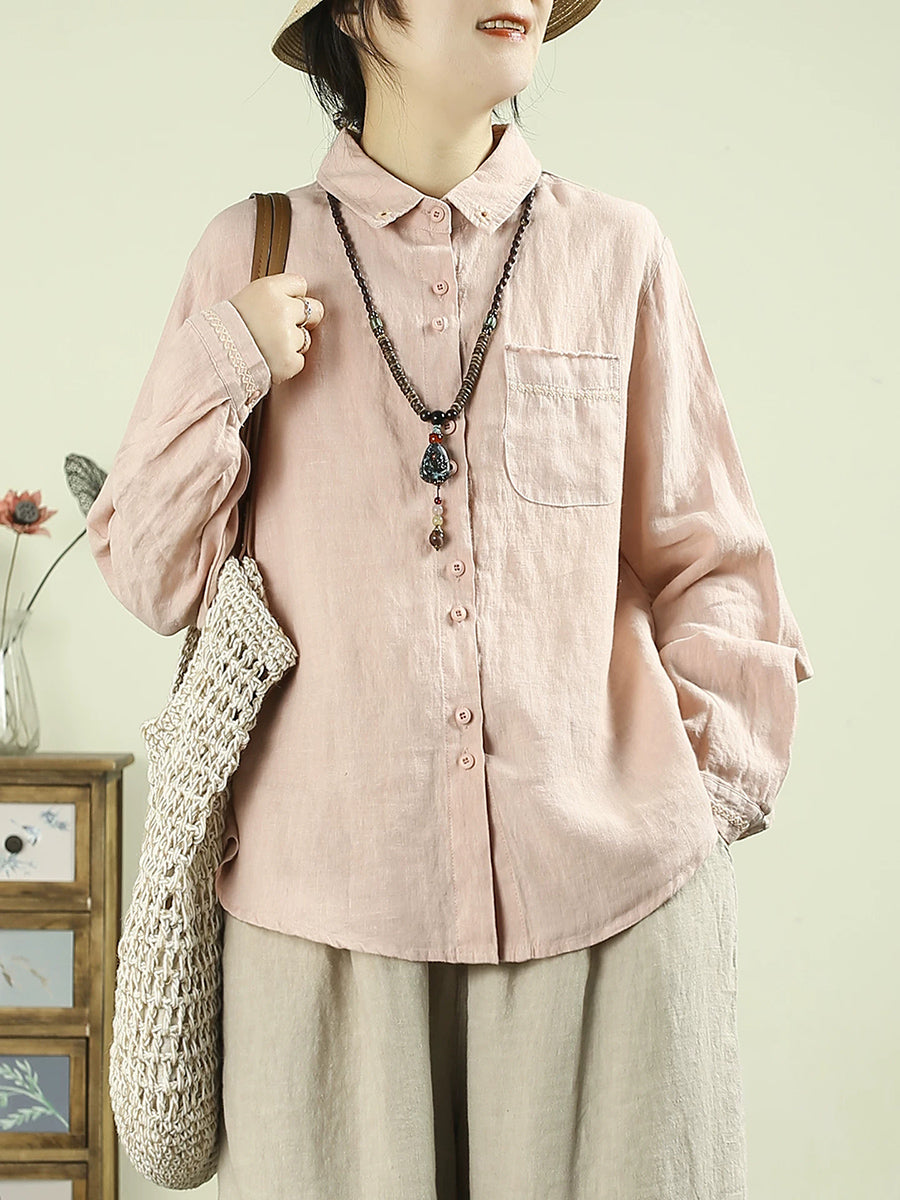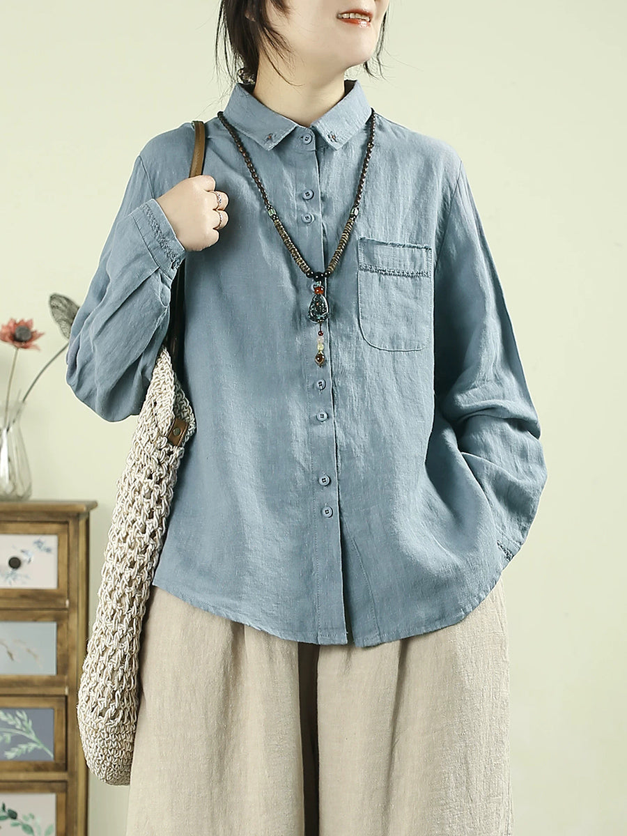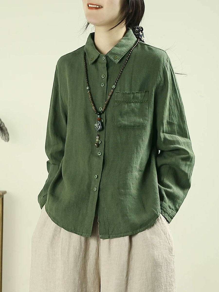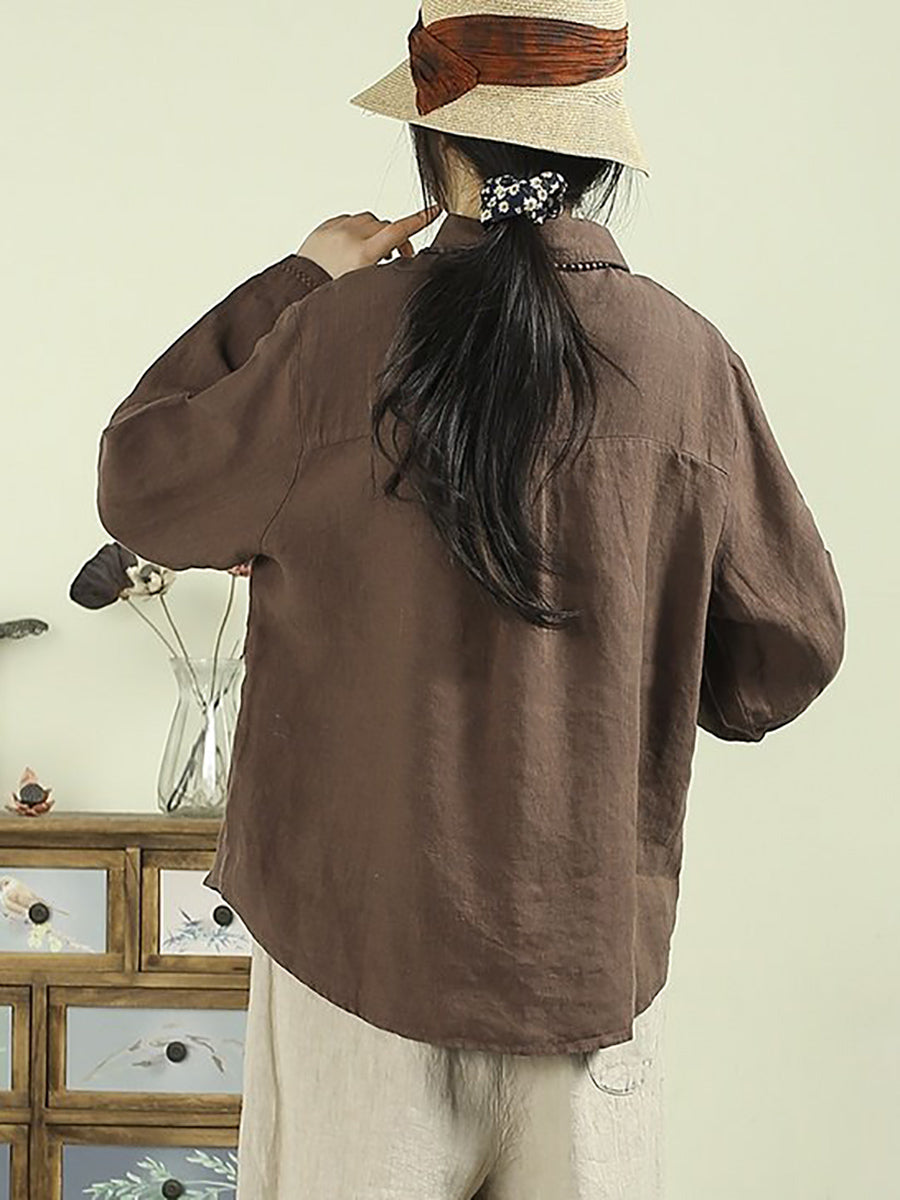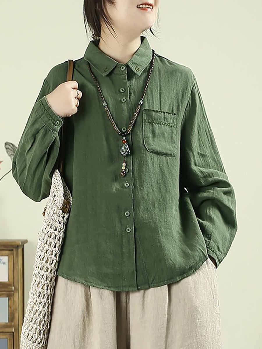 Women Artsy Spring Pure Color 100%Linen Turn-down Collar Shirt