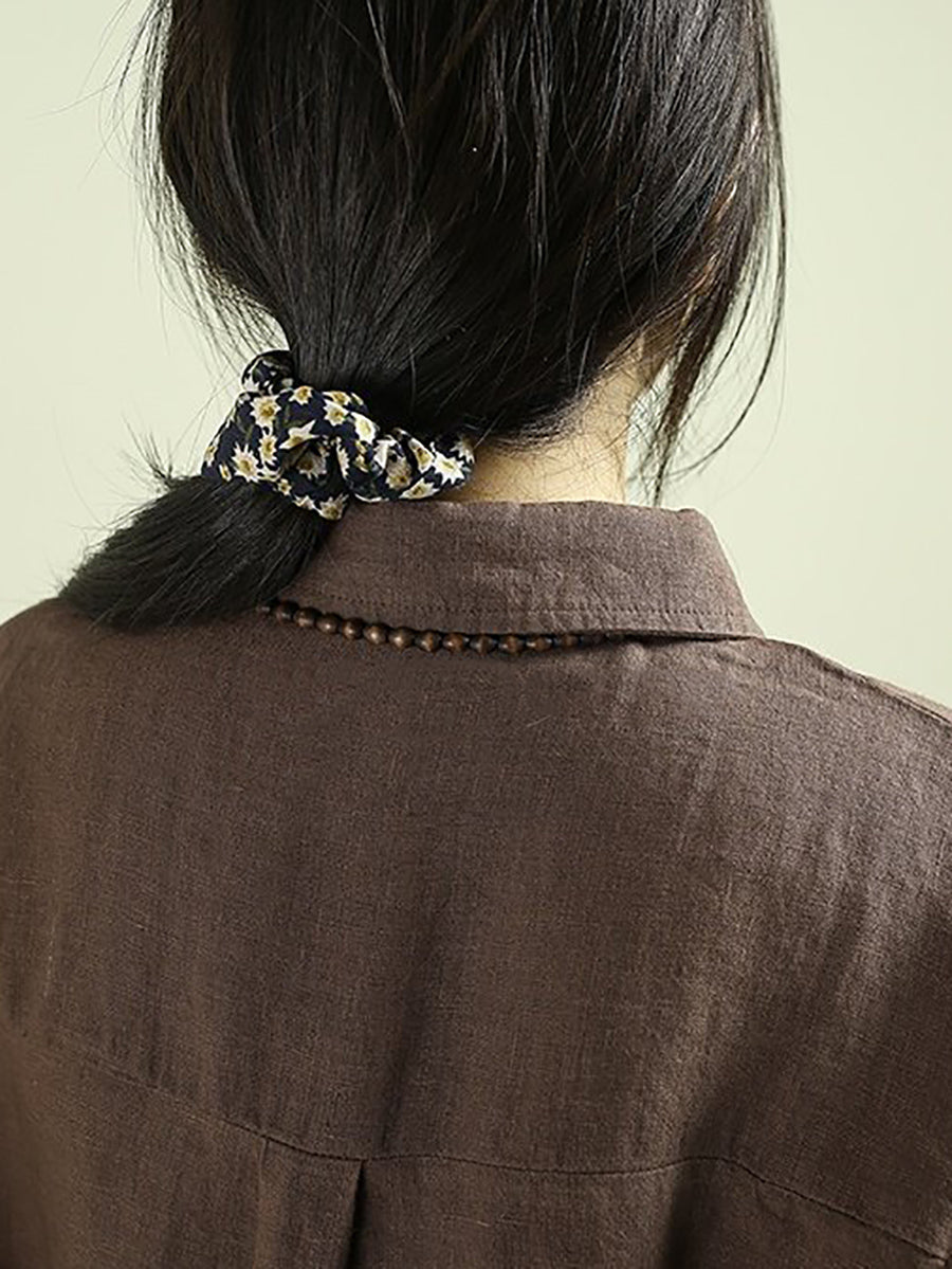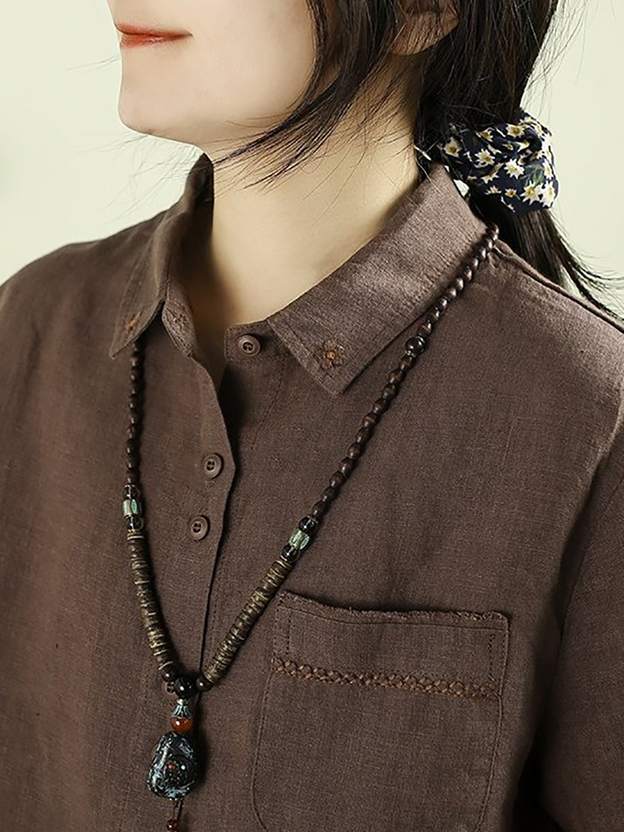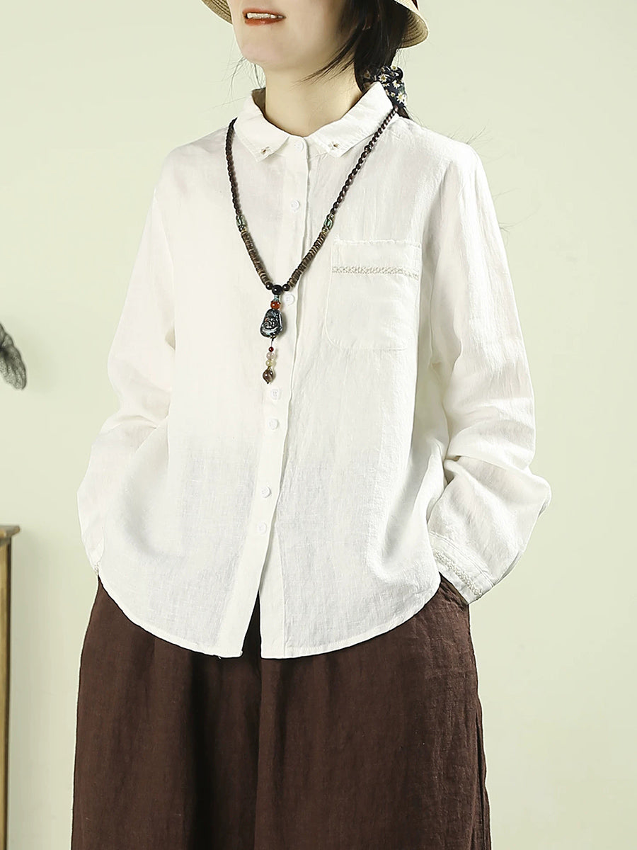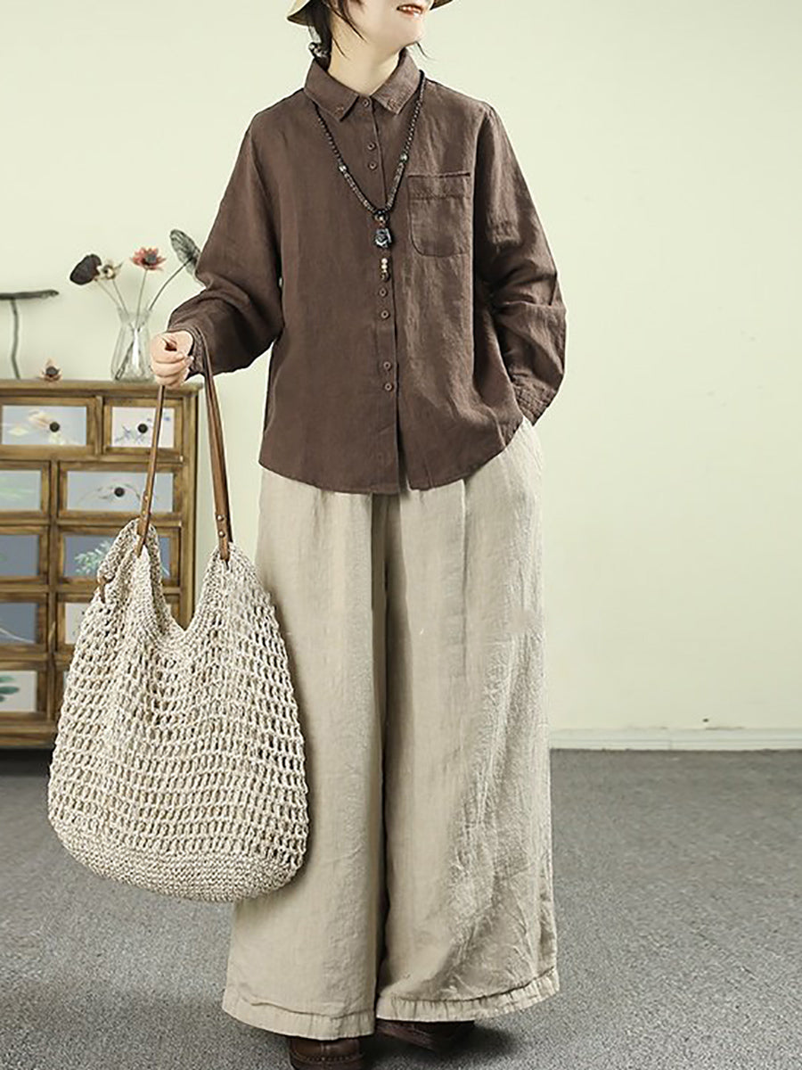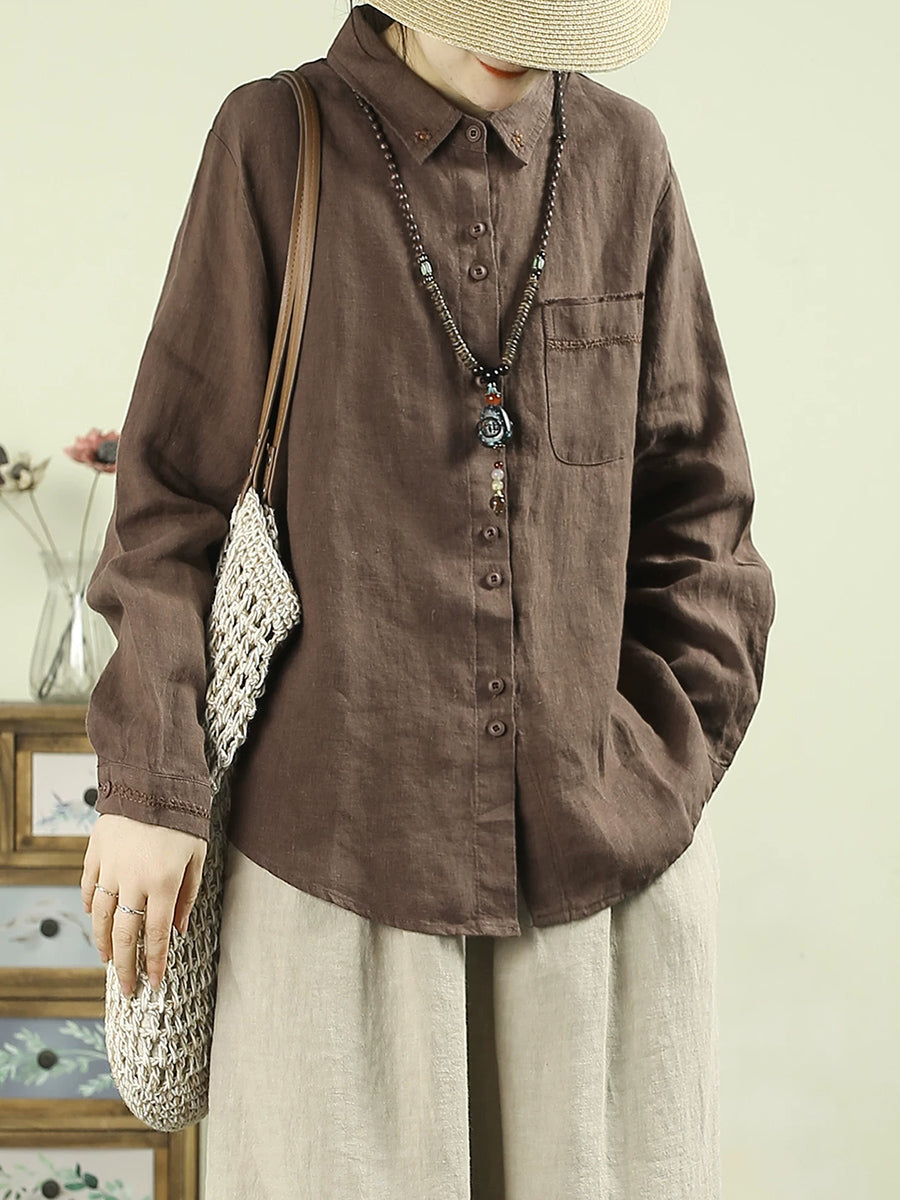 Women Artsy Spring Pure Color 100%Linen Turn-down Collar Shirt