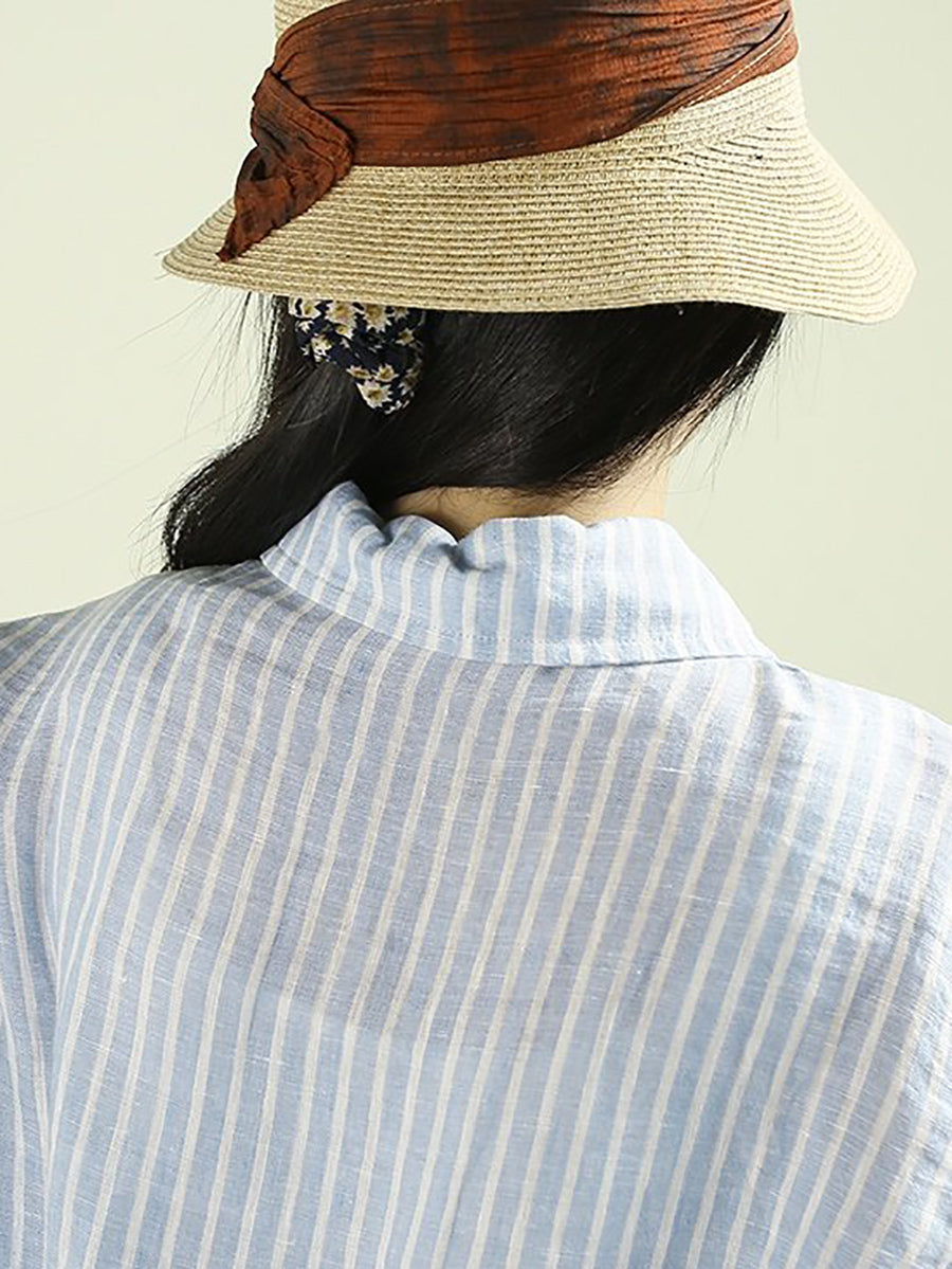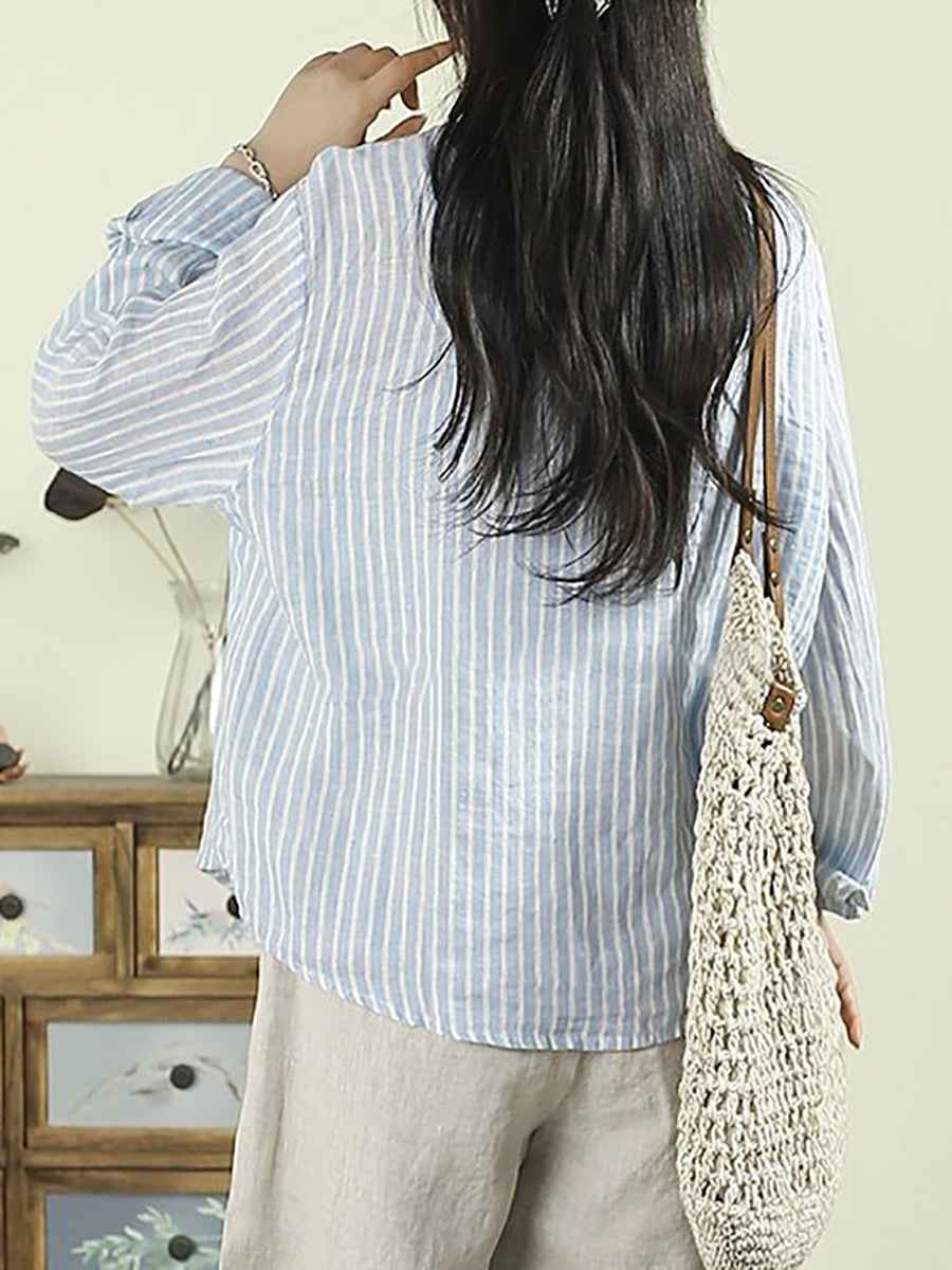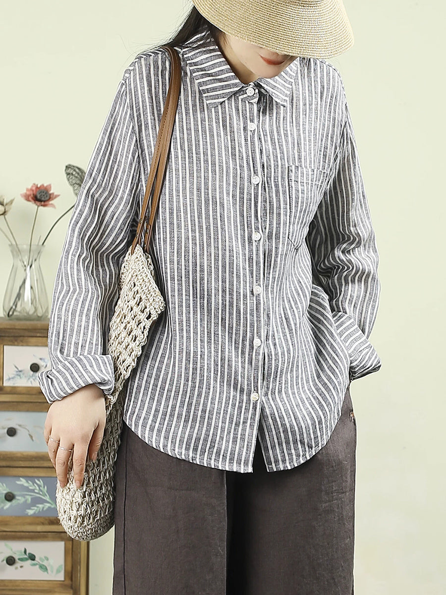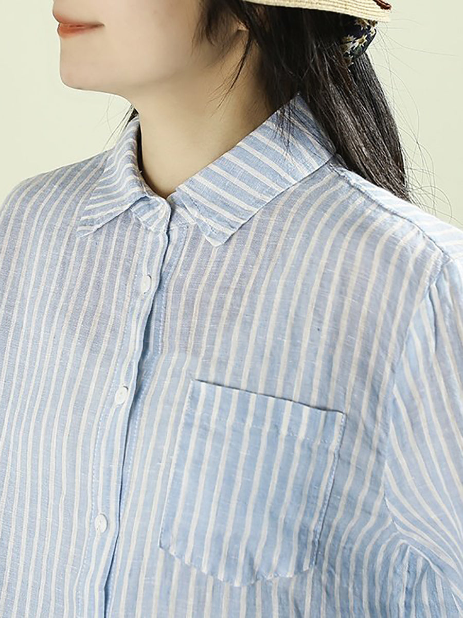 Women Artsy Spring Stripe 100%Linen Turn-down Collar Shirt