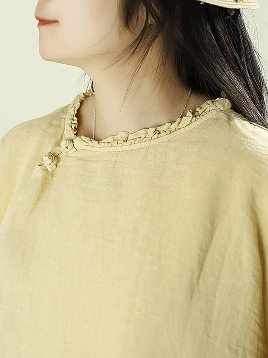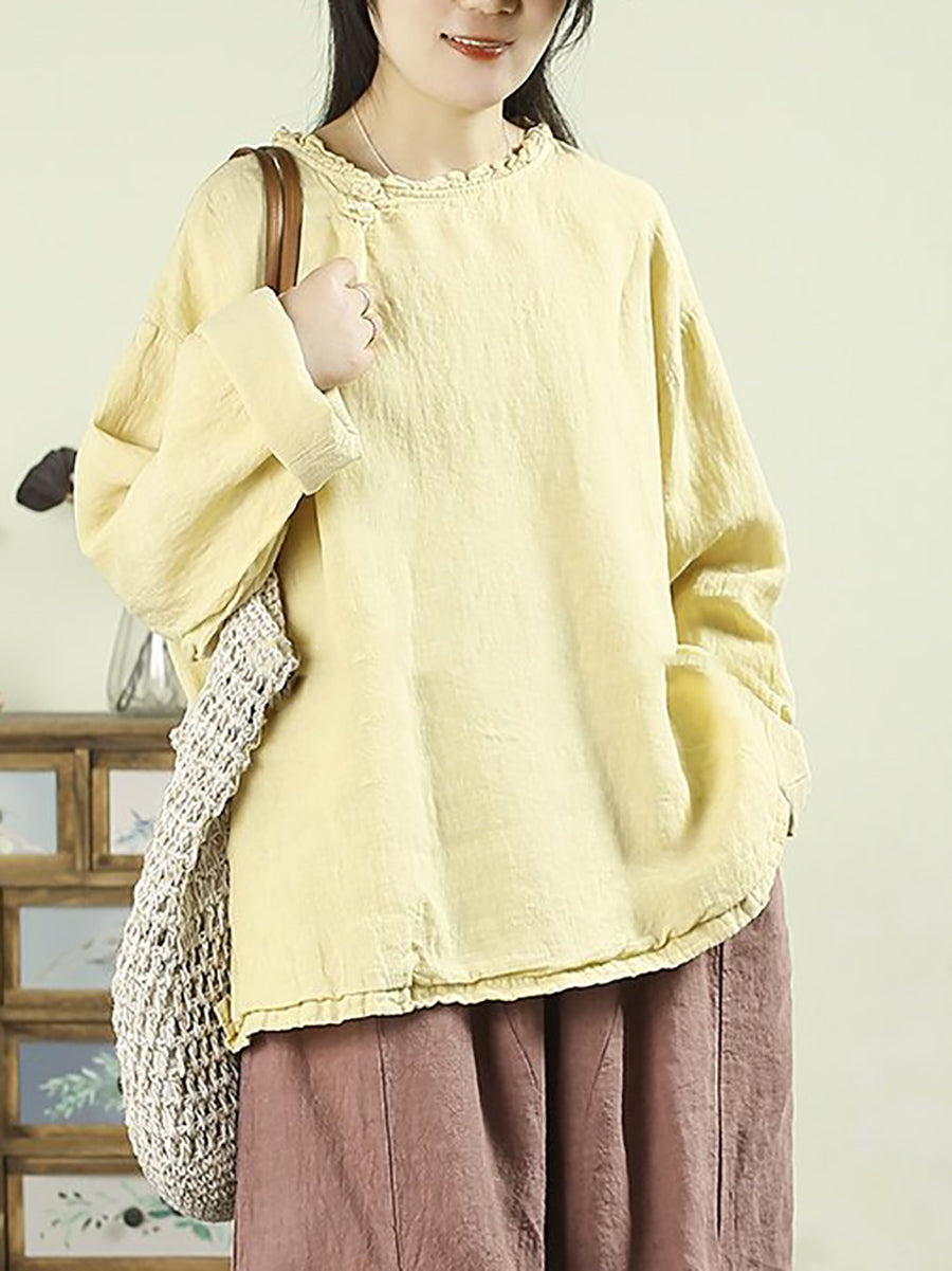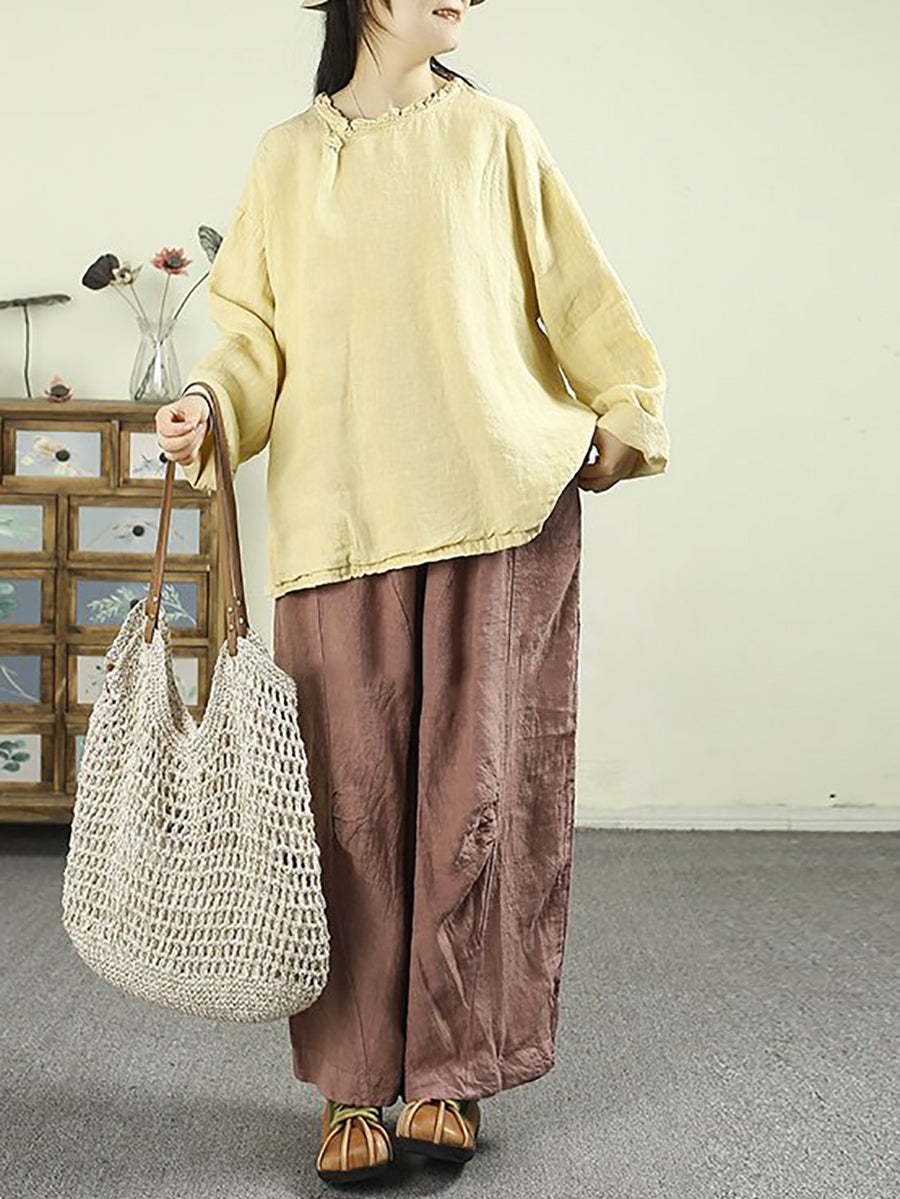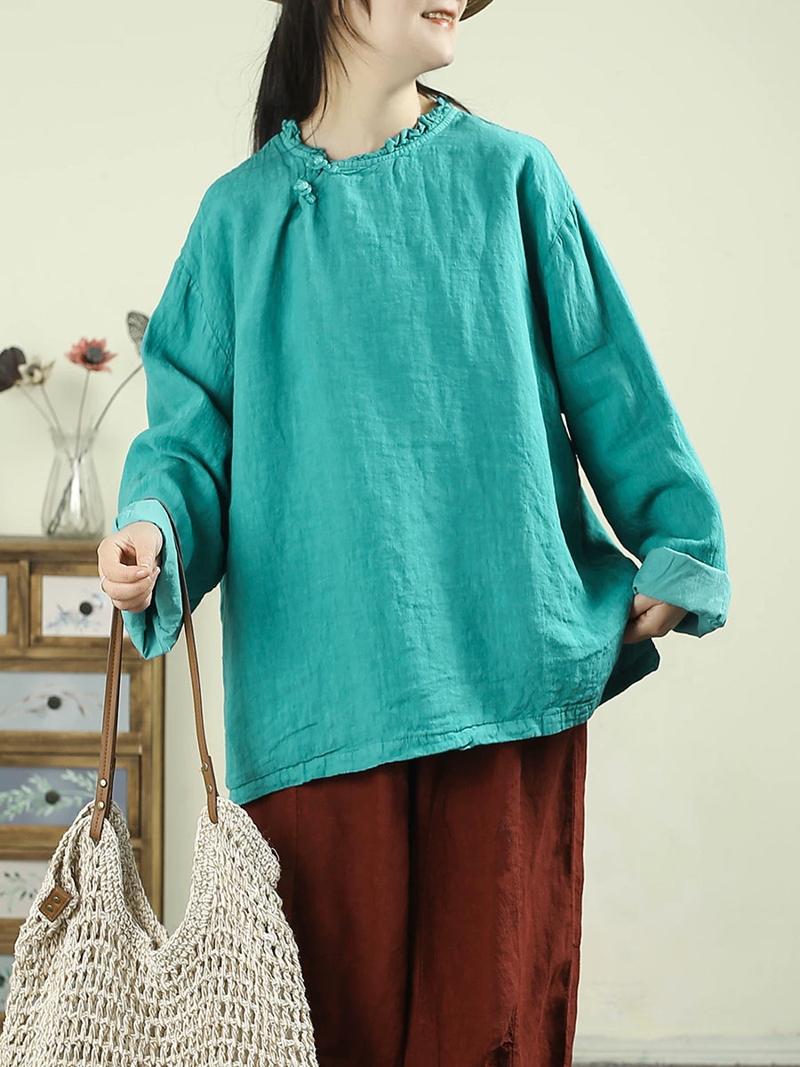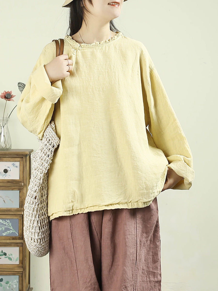 Women Spring Ethnic Pure Color O-Neck 100%Linen Blouse