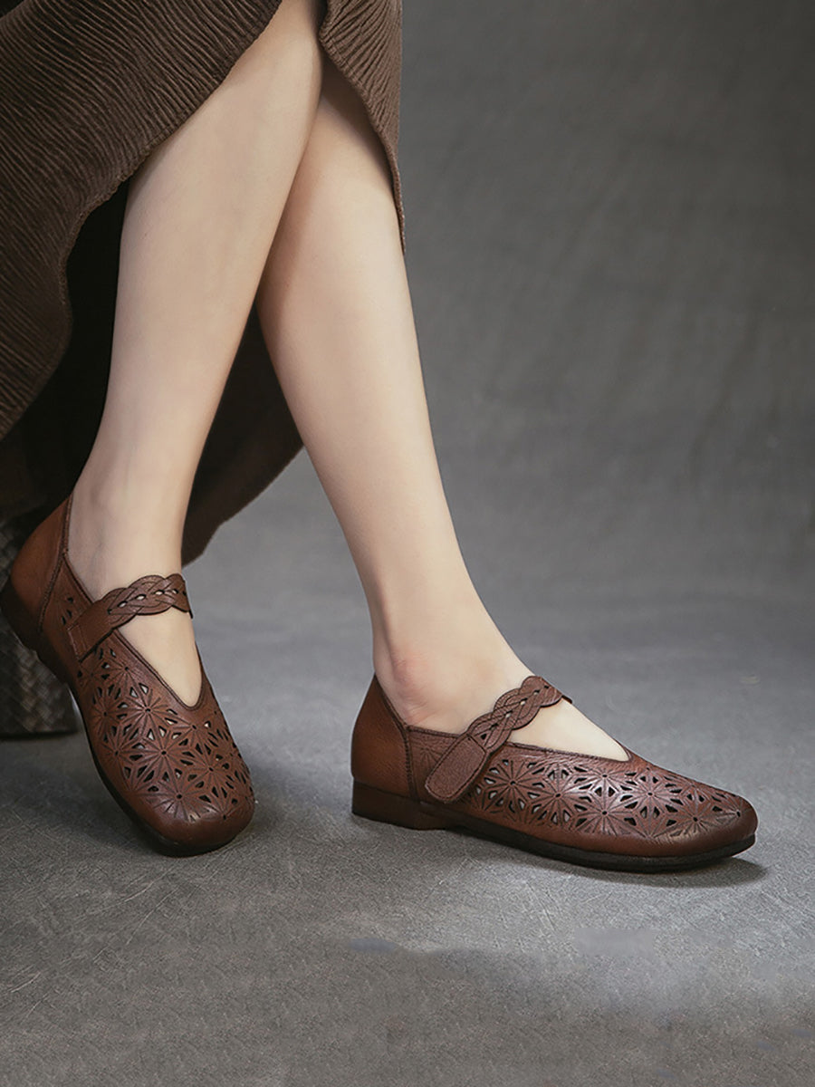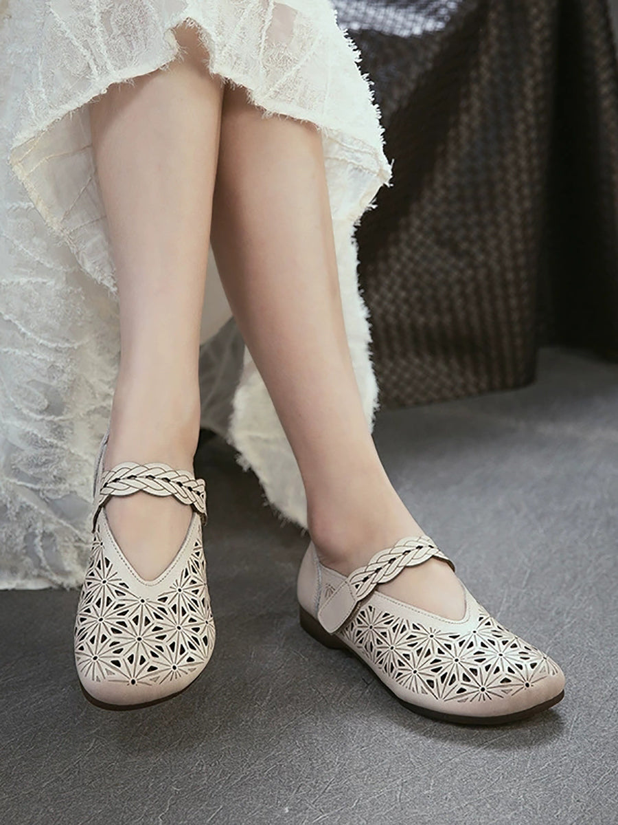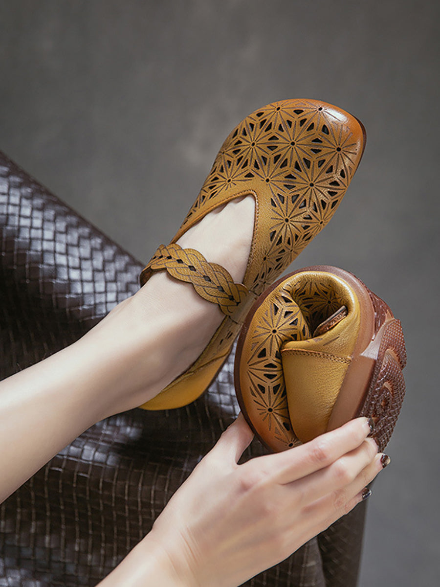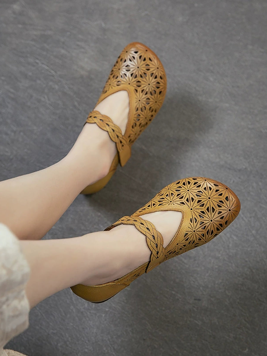Women Genuine Leather Hollow Out Low Heel Sandals