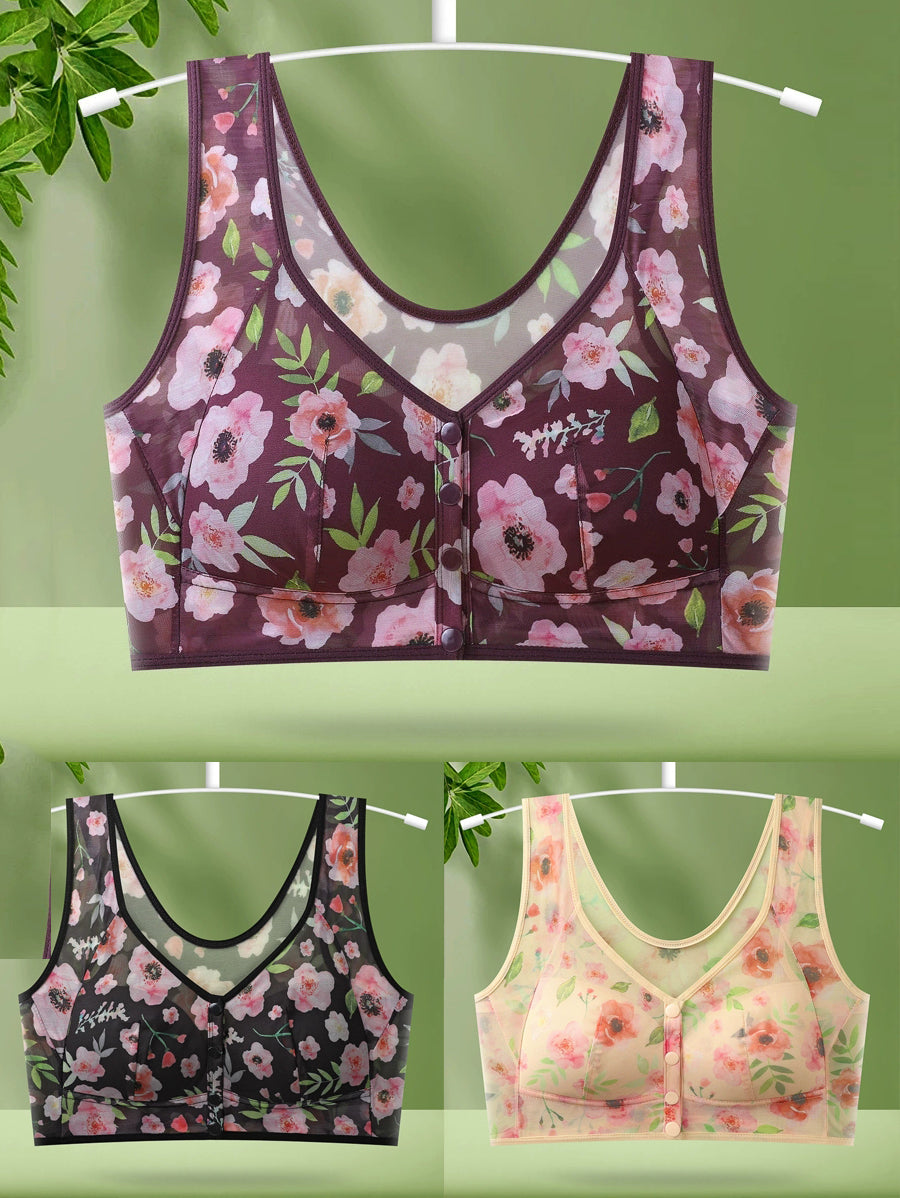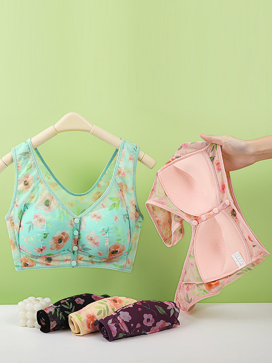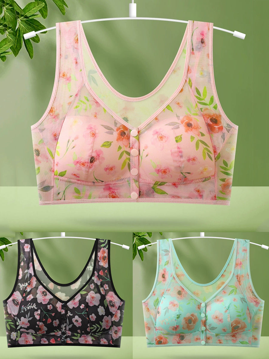 3 Pieces Women Artsy Flower Front Buckle Wireless Bra