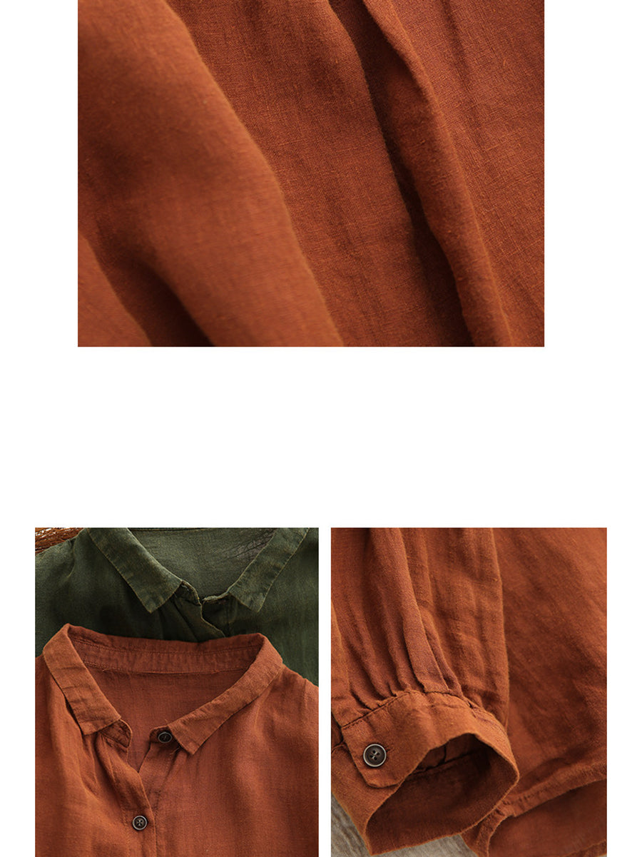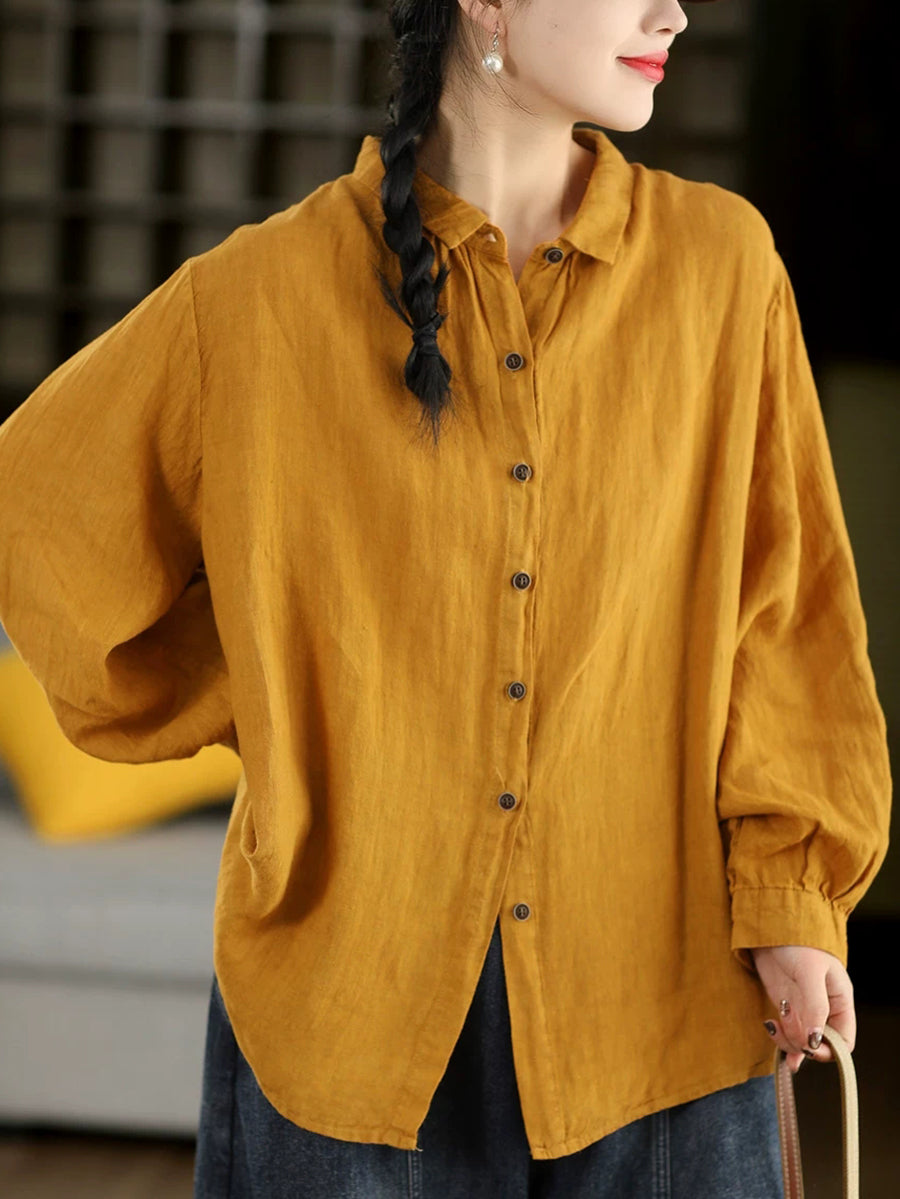 Women Spring Artsy Pure Color 100%Linen Turn-down Collar Shirt