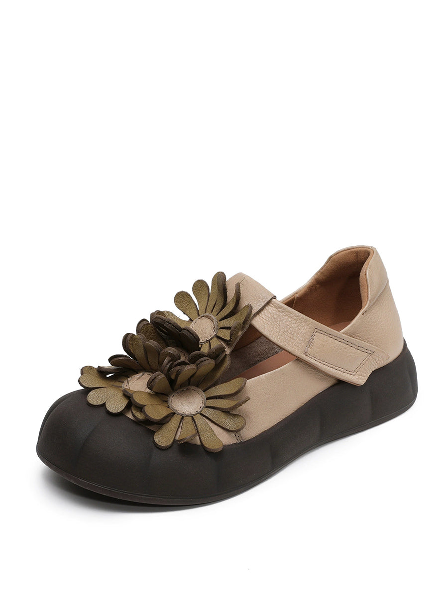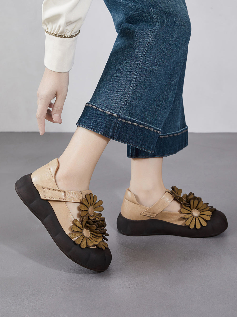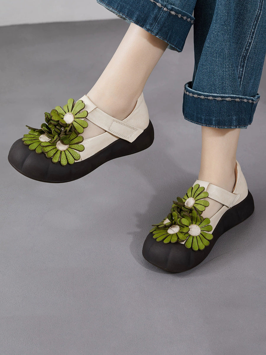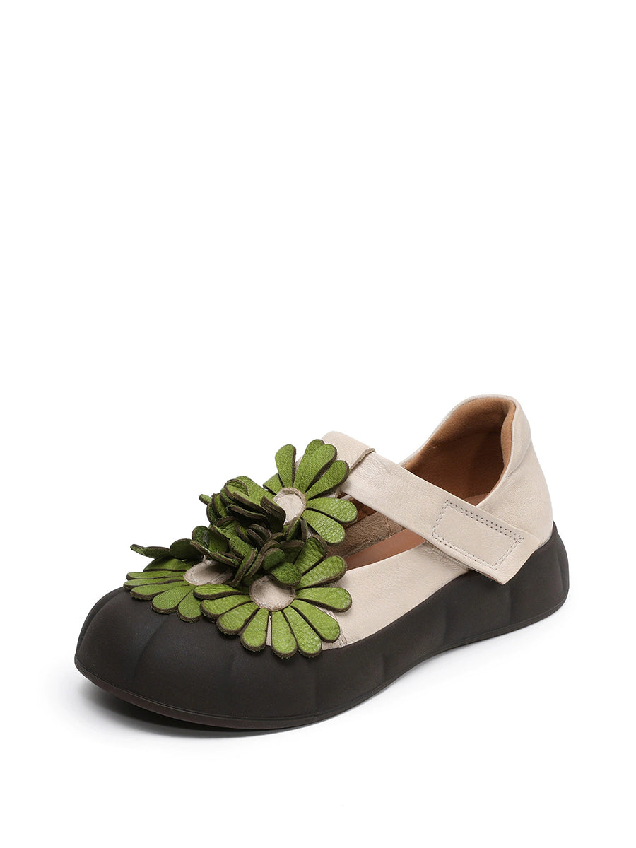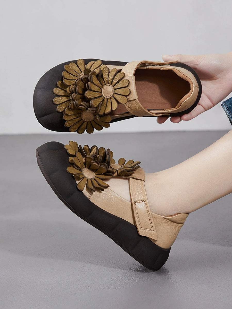 Women Summer Retro Genuine Leather Flower Shoes