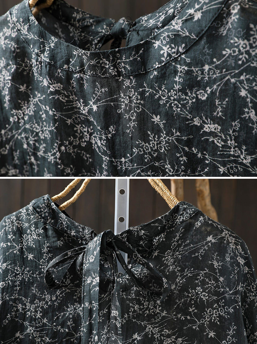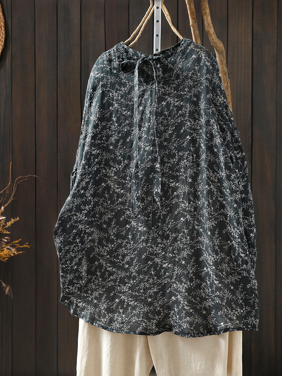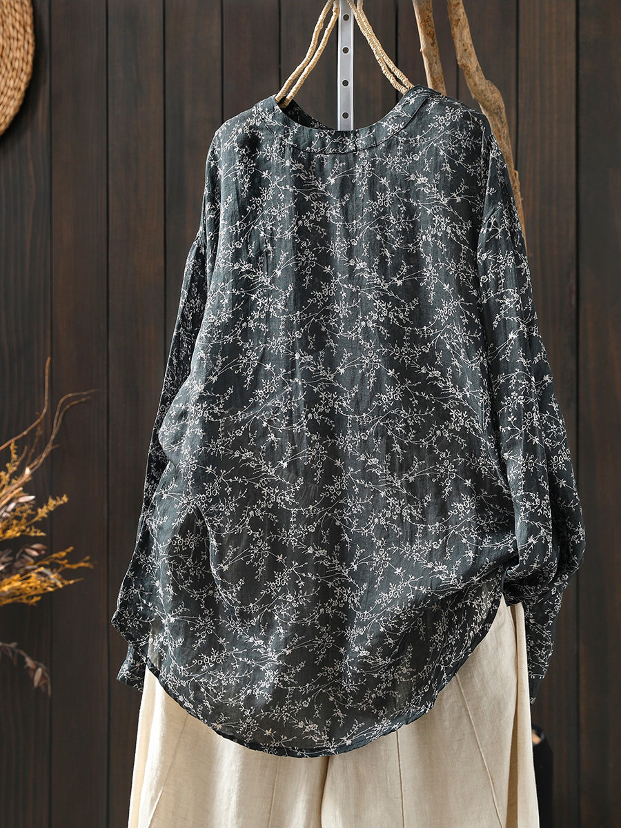 Women Spring Artsy Floral 100%Ramie O-Neck Blouse