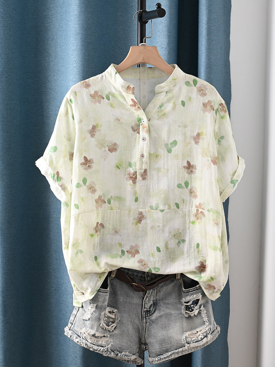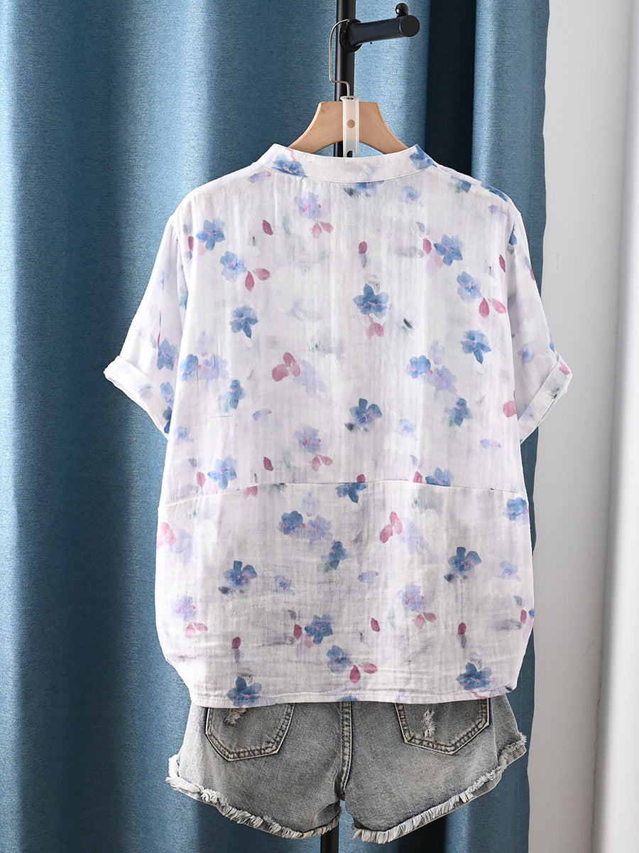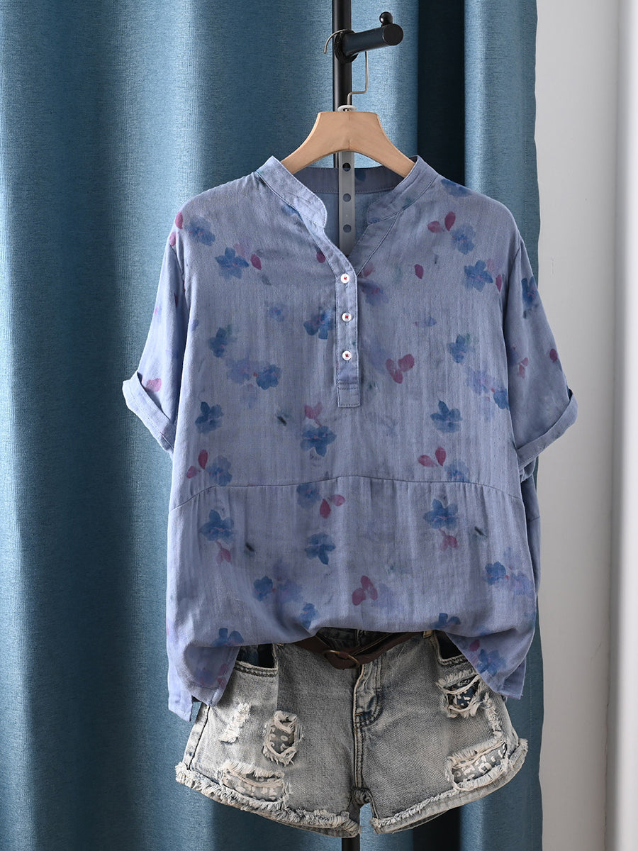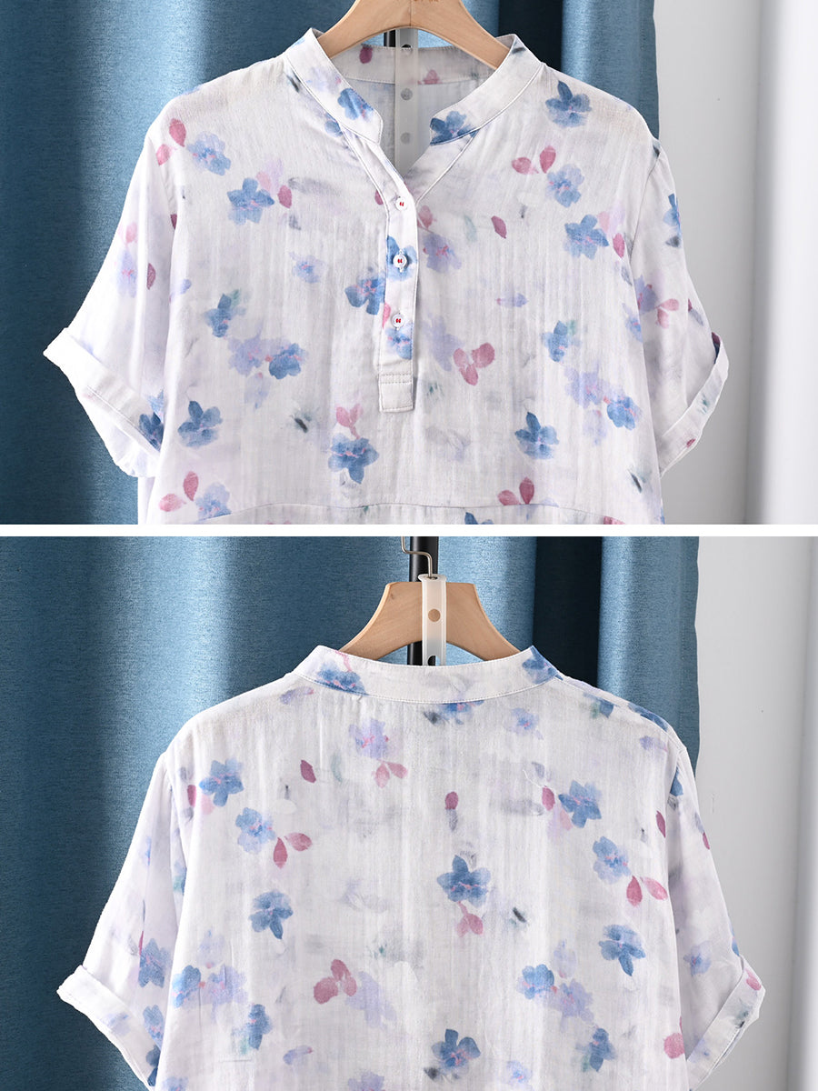 Women Summer Artsy Flower 100%Cotton V-Neck Blouse