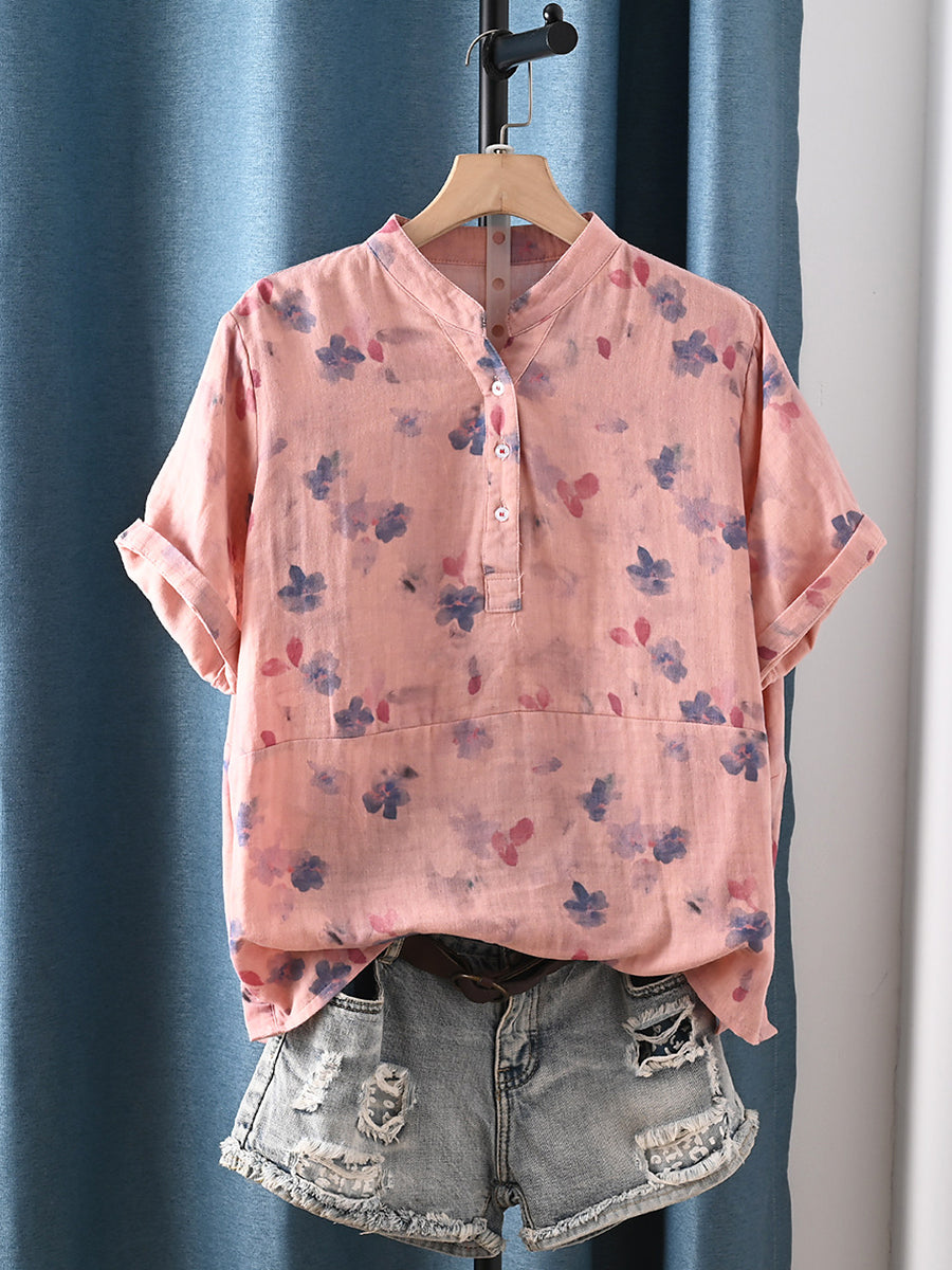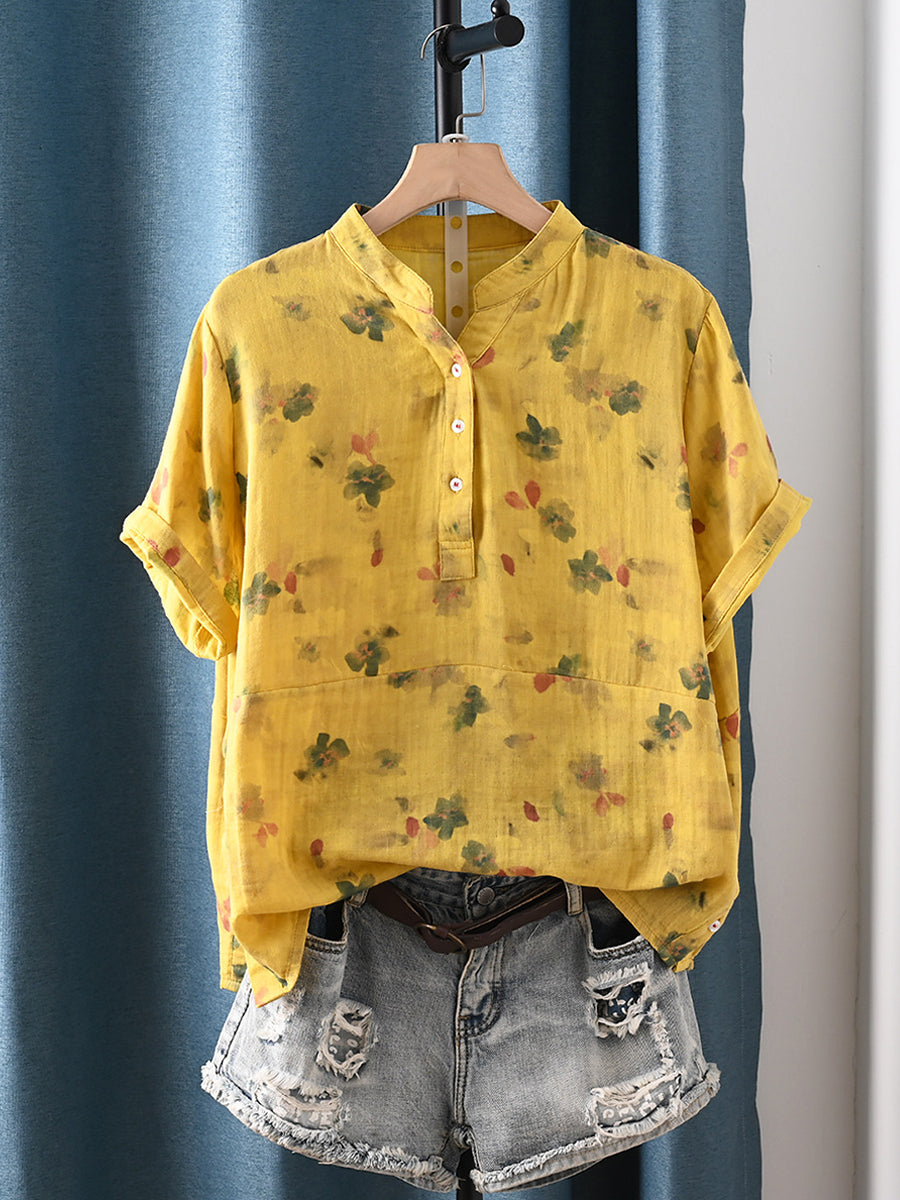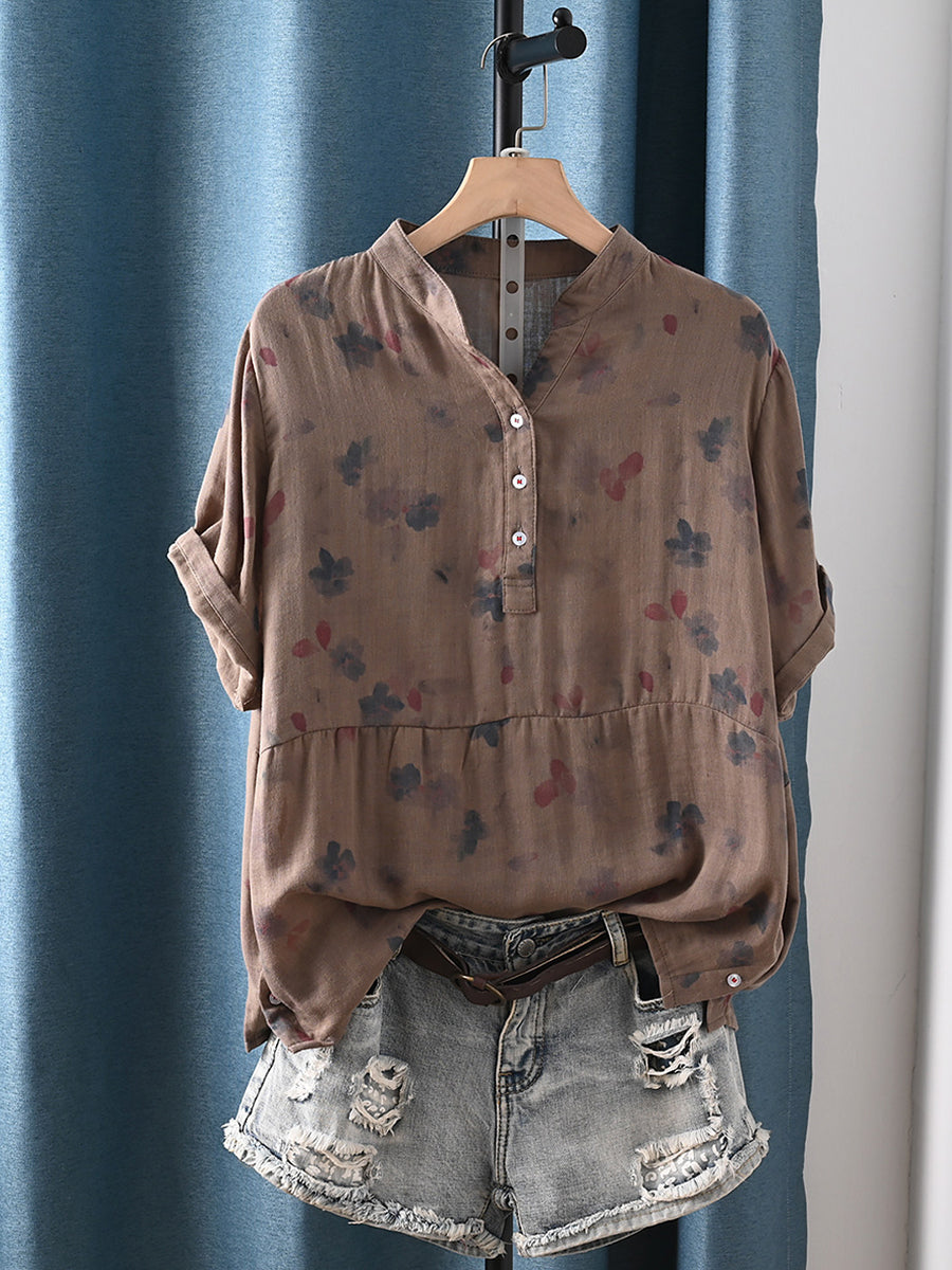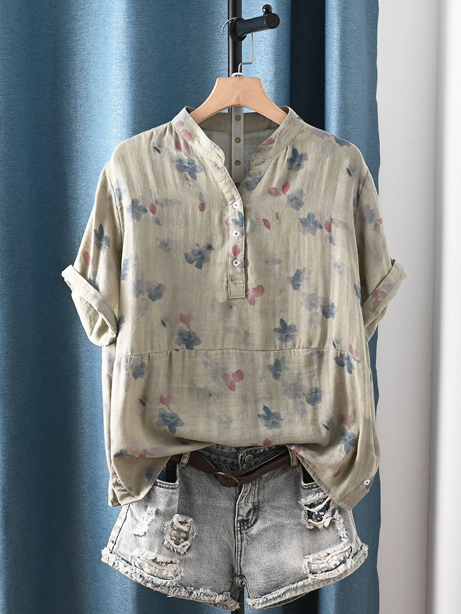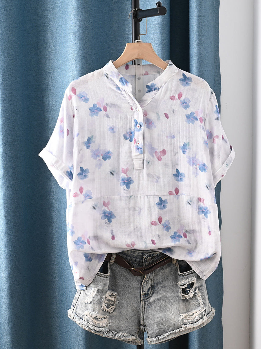 Women Summer Artsy Flower 100%Cotton V-Neck Blouse
