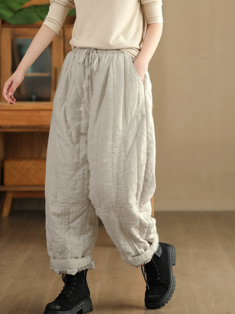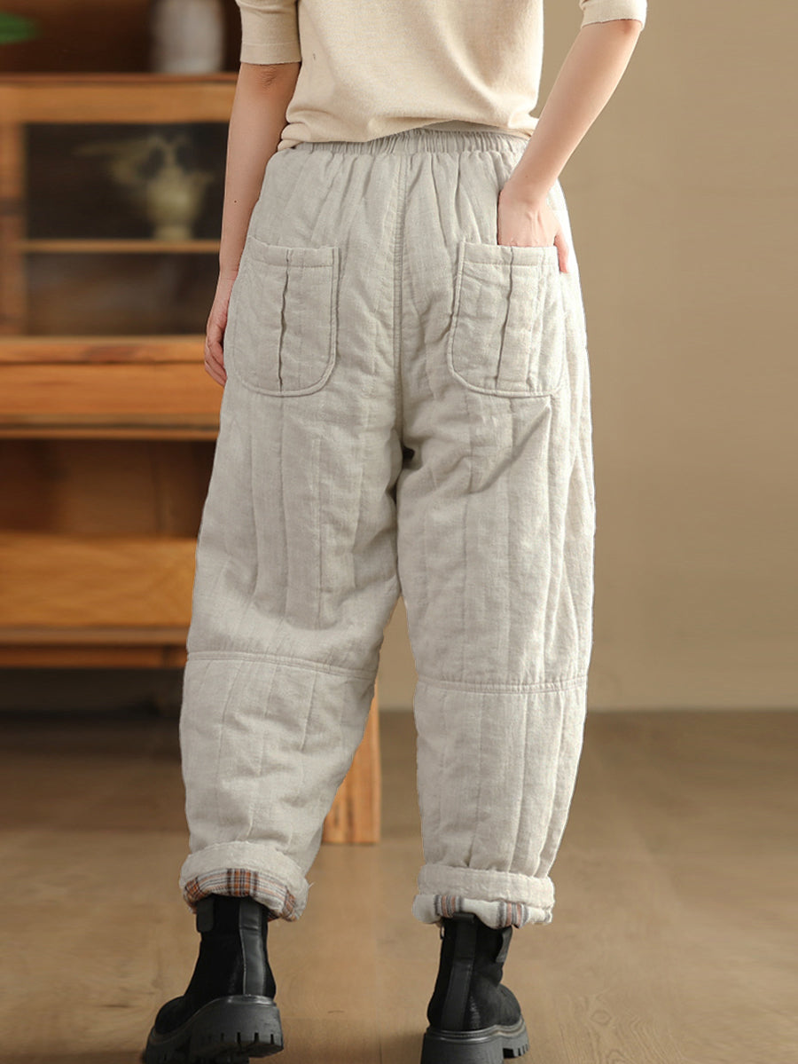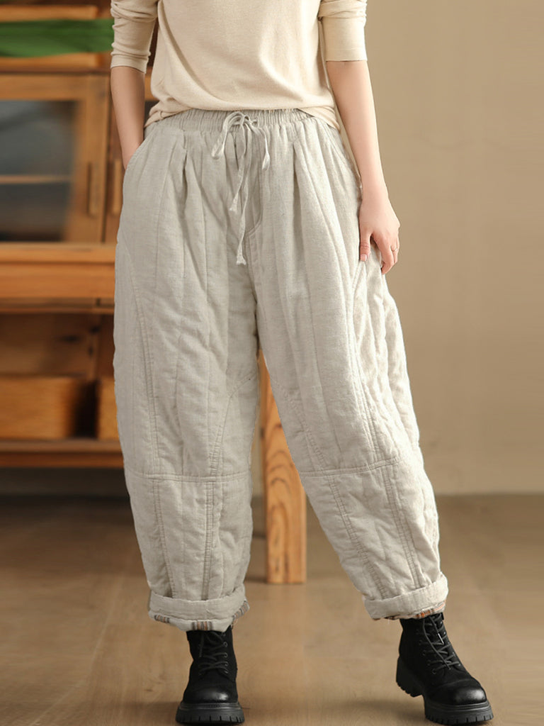 Women Autumn Pure Color 100%Linen Padded Harem Pants