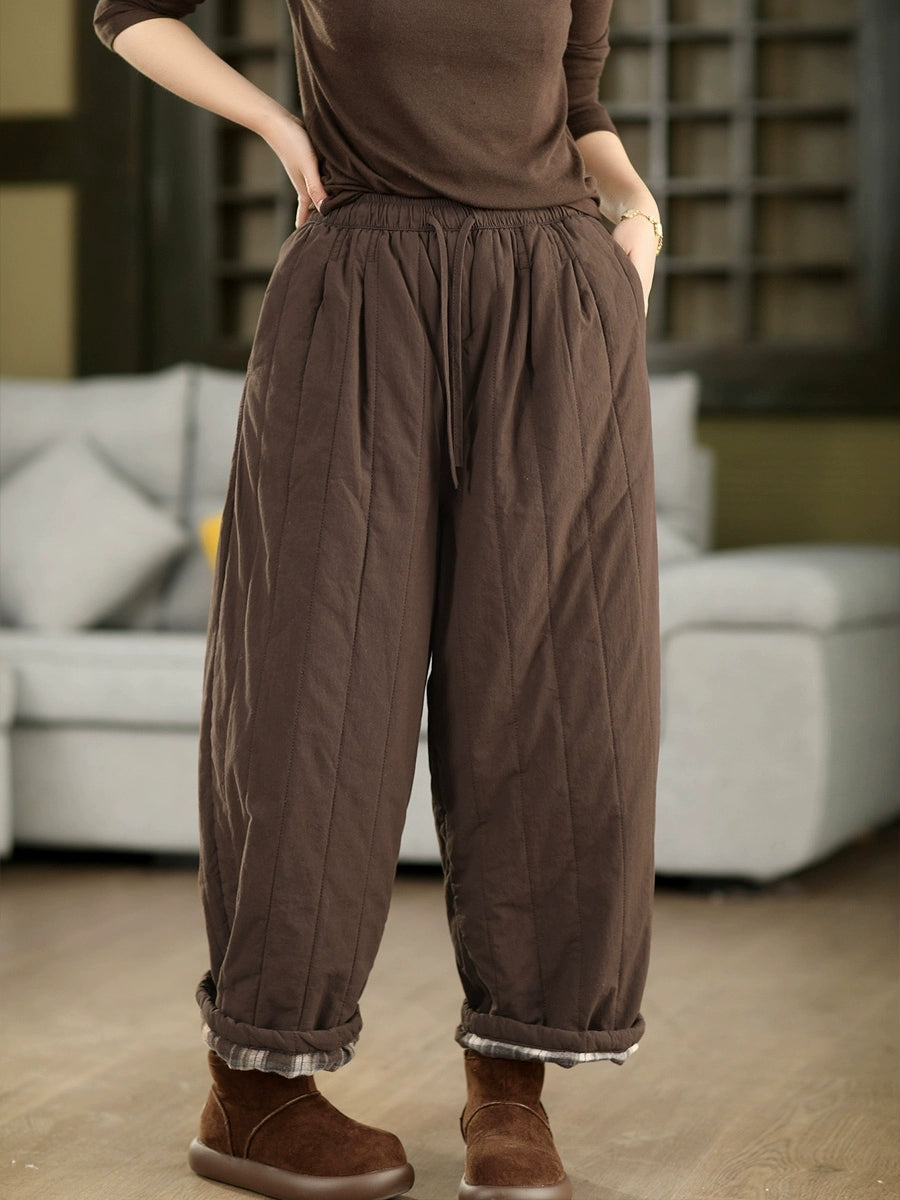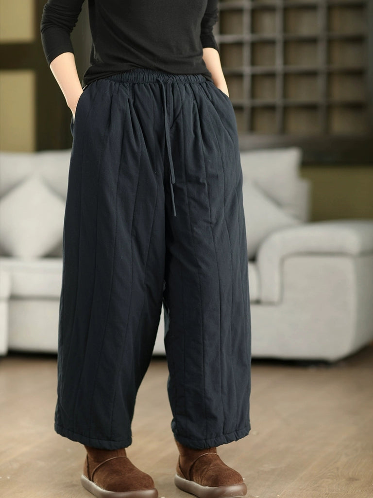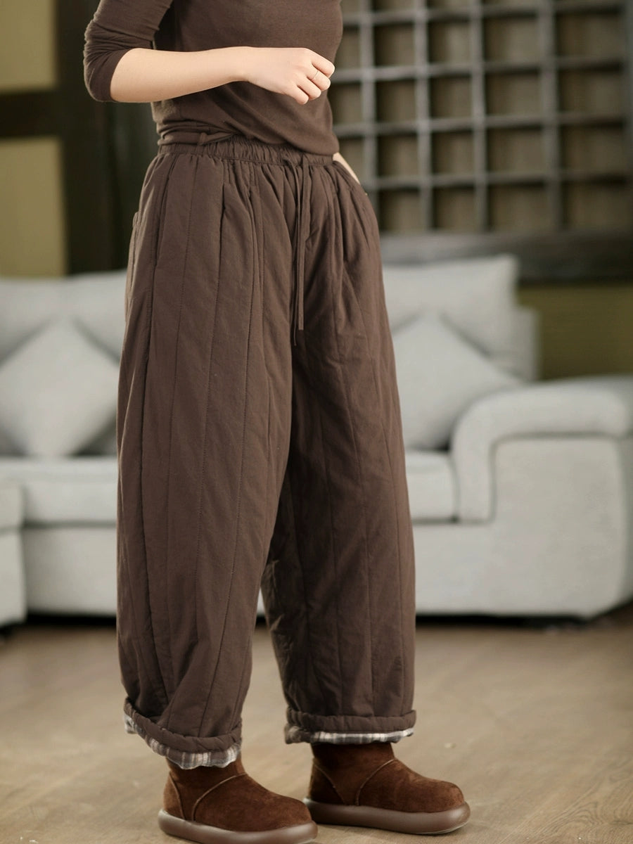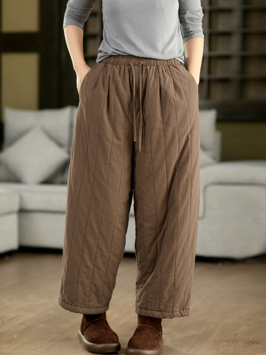 Women Winter Retro Pure Color 100%Cotton Padded Pants