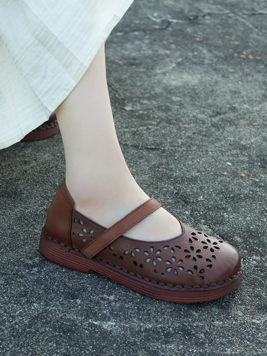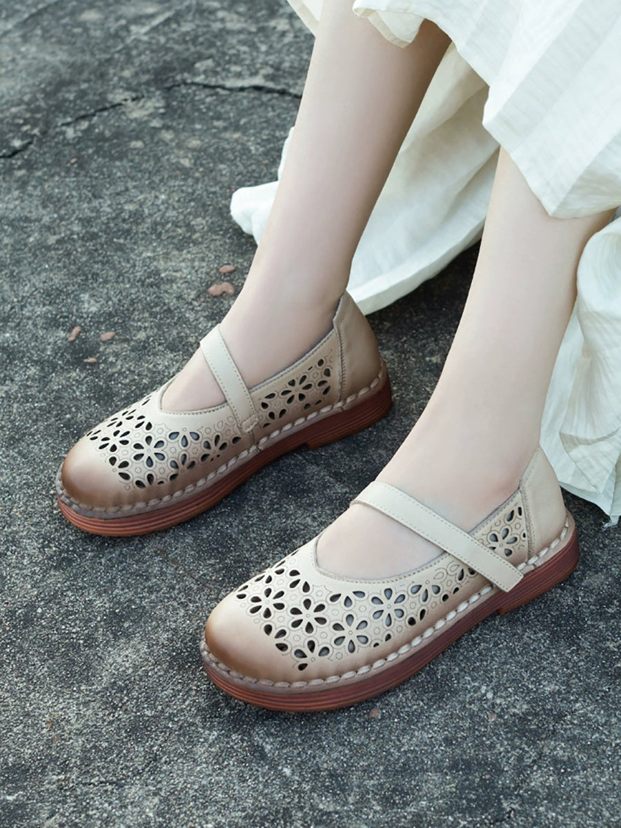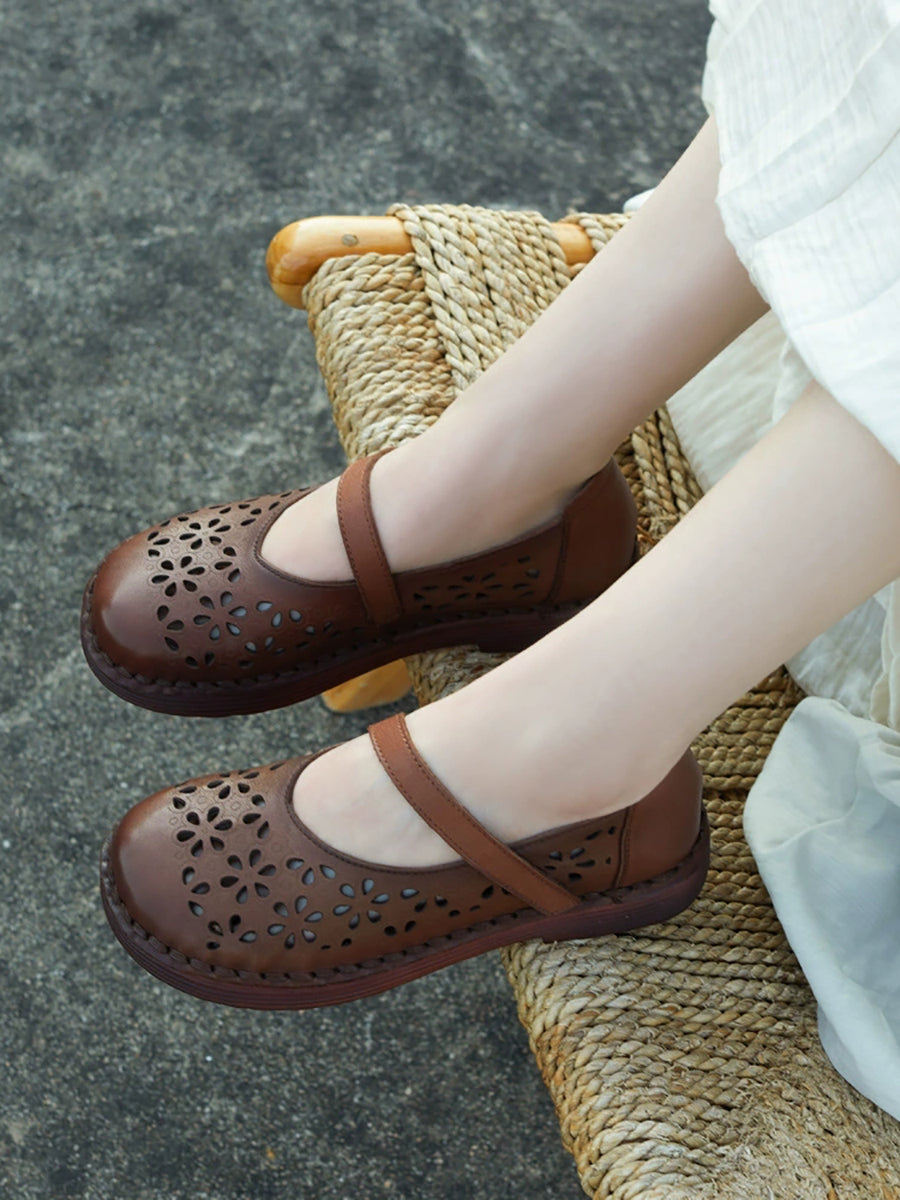 Women Summer Leather Flower Hollow Out Flat Shoes