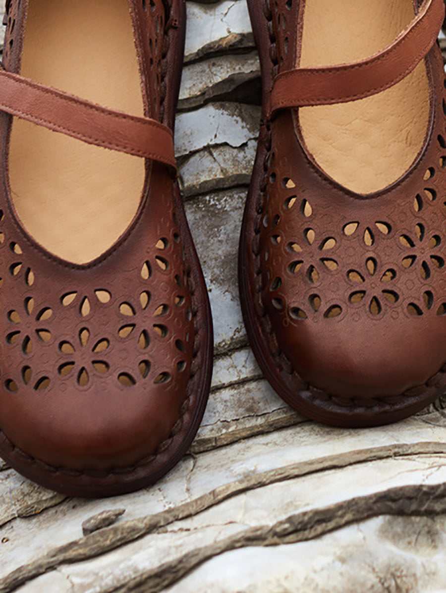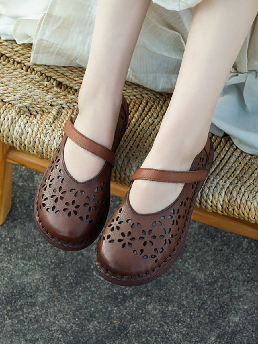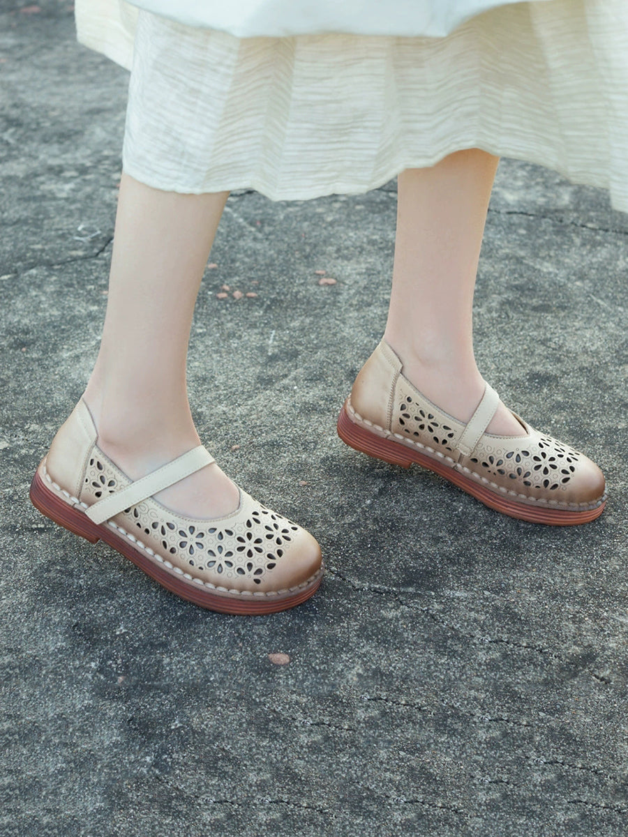 Women Summer Leather Flower Hollow Out Flat Shoes