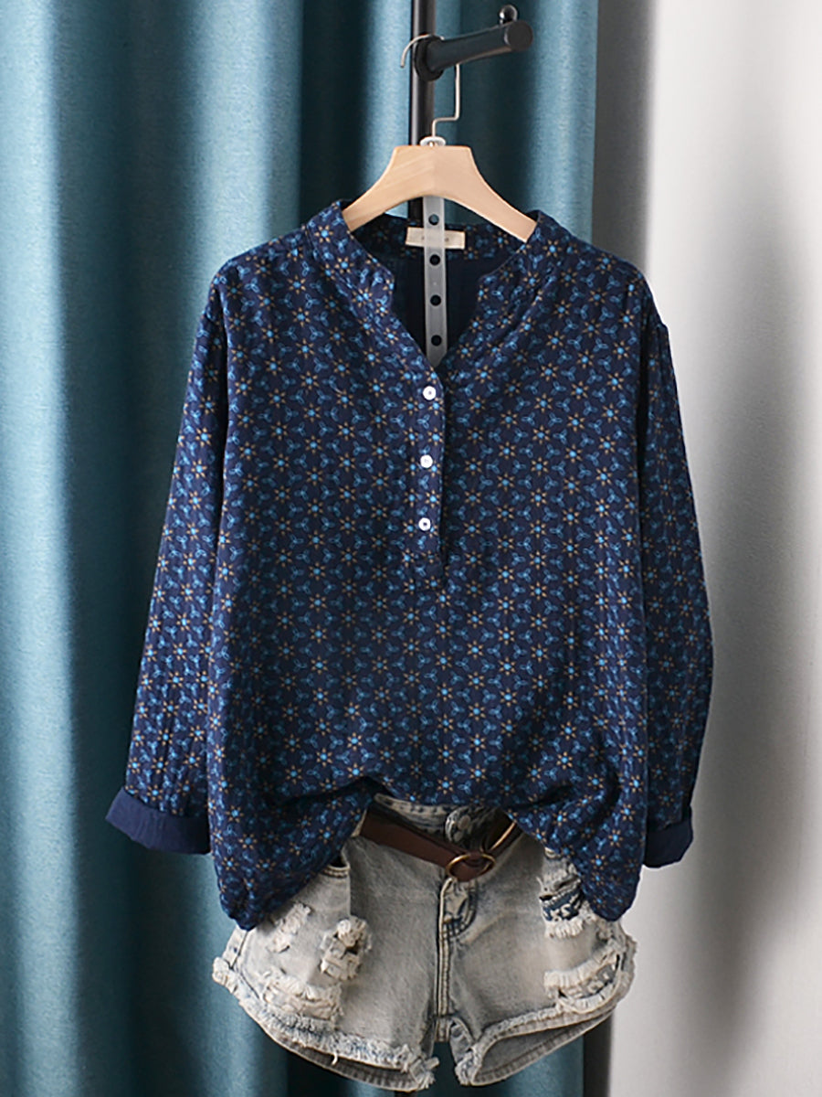 Women Artsy Floral 100%Cotton Stand Collar Blouse