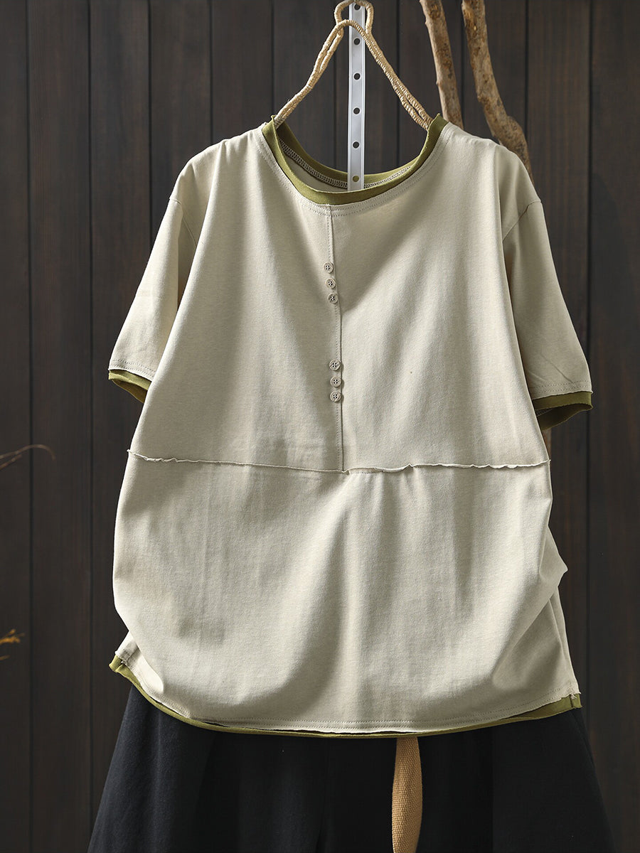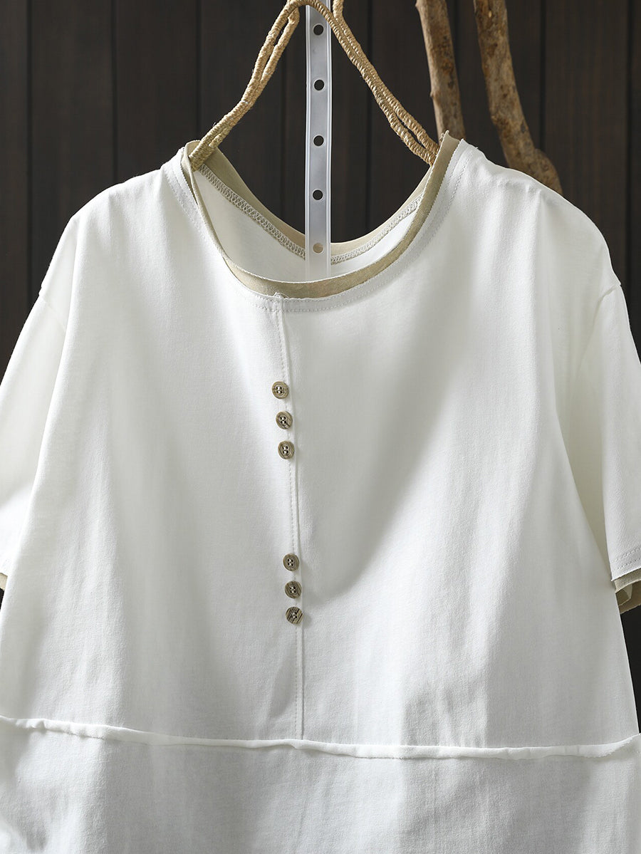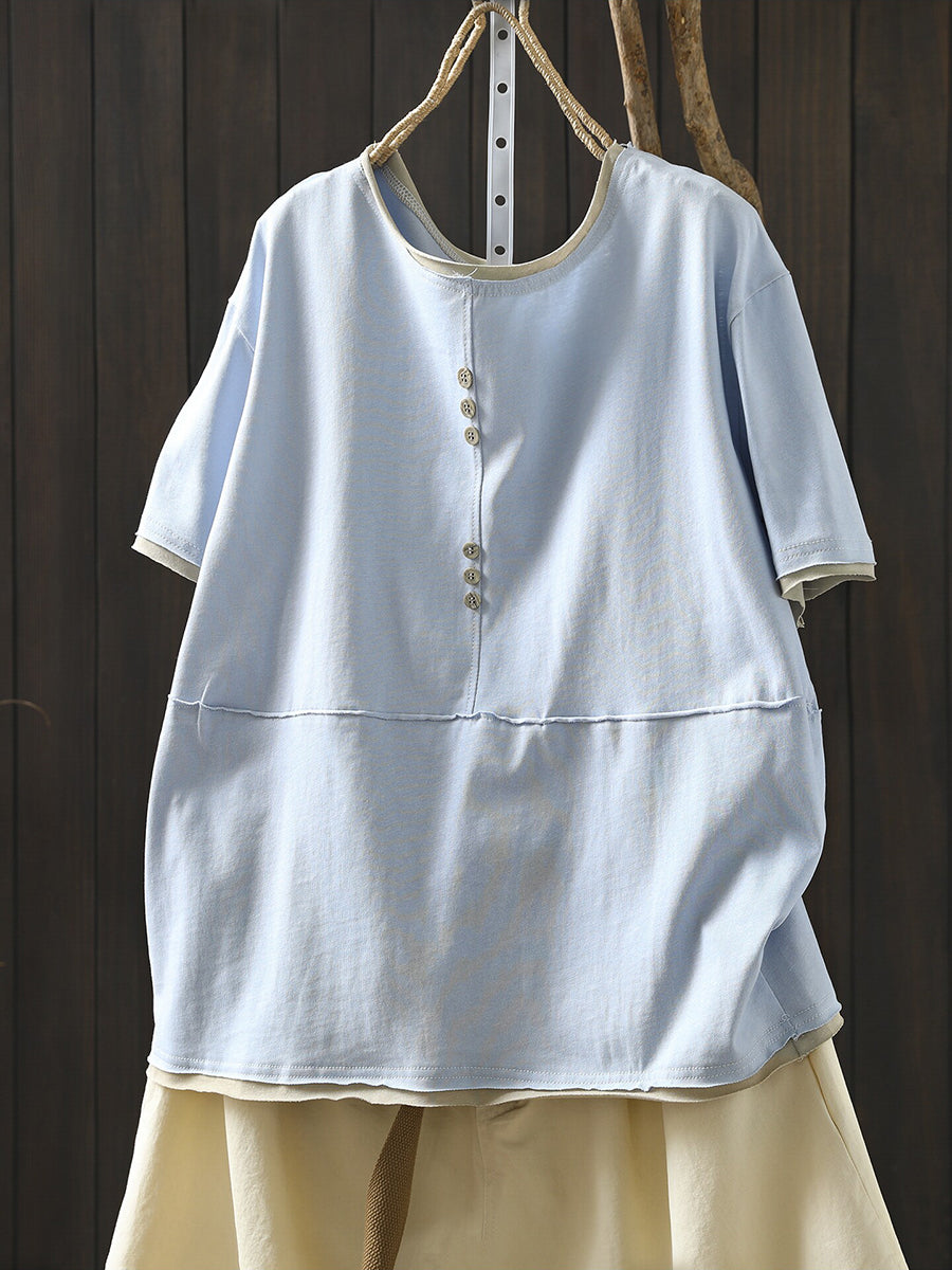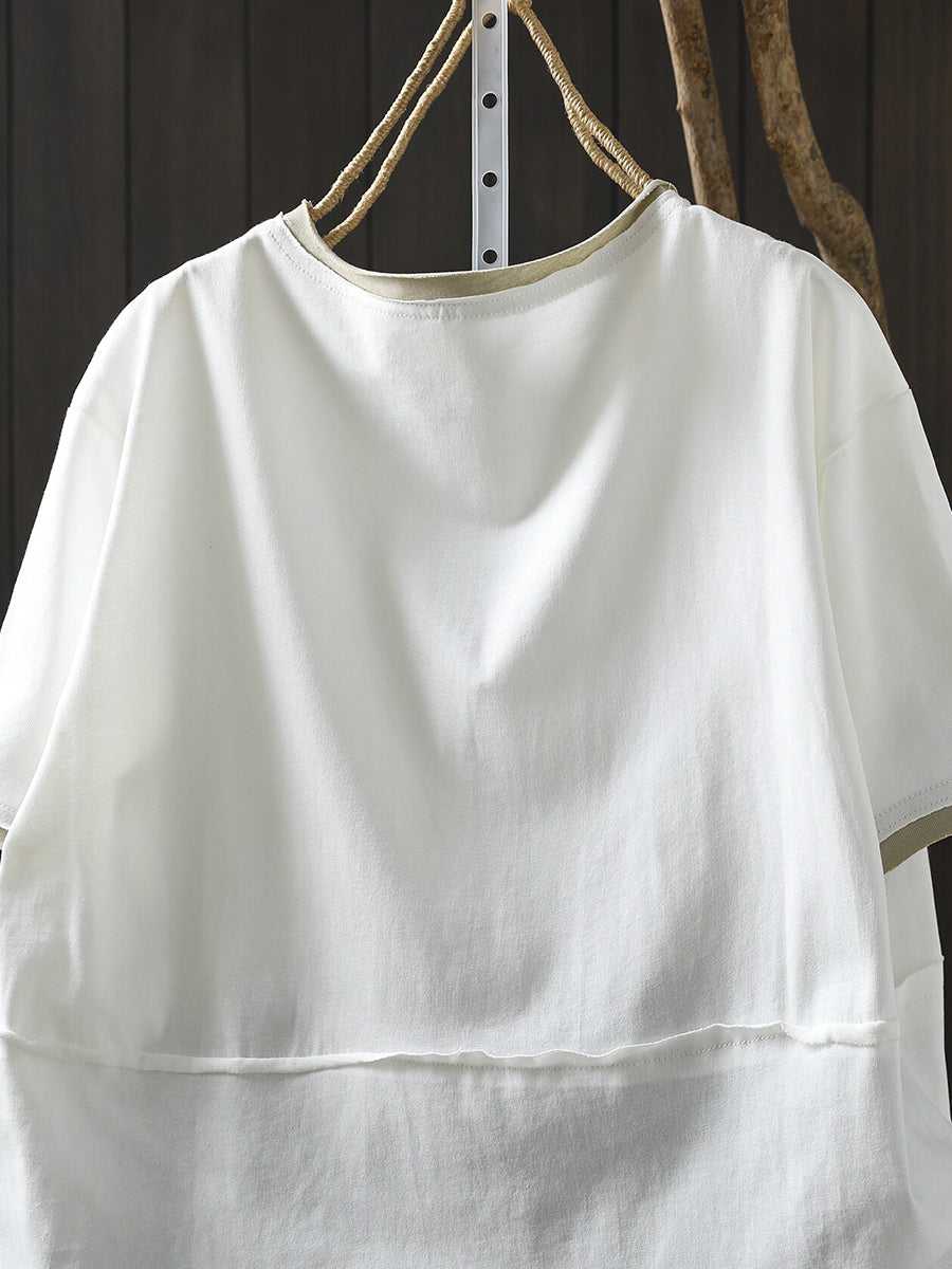 Women Casual Colorblock O-Neck 100%Cotton Shirt