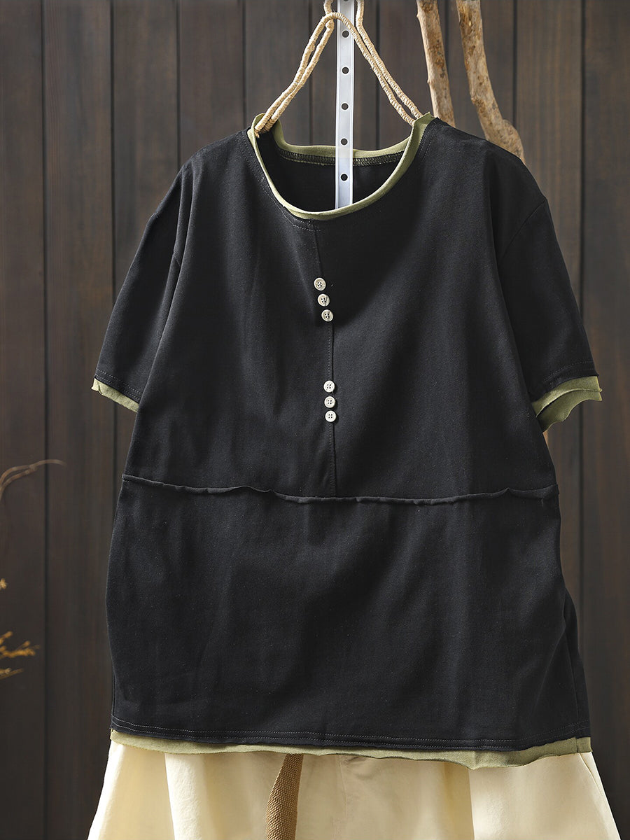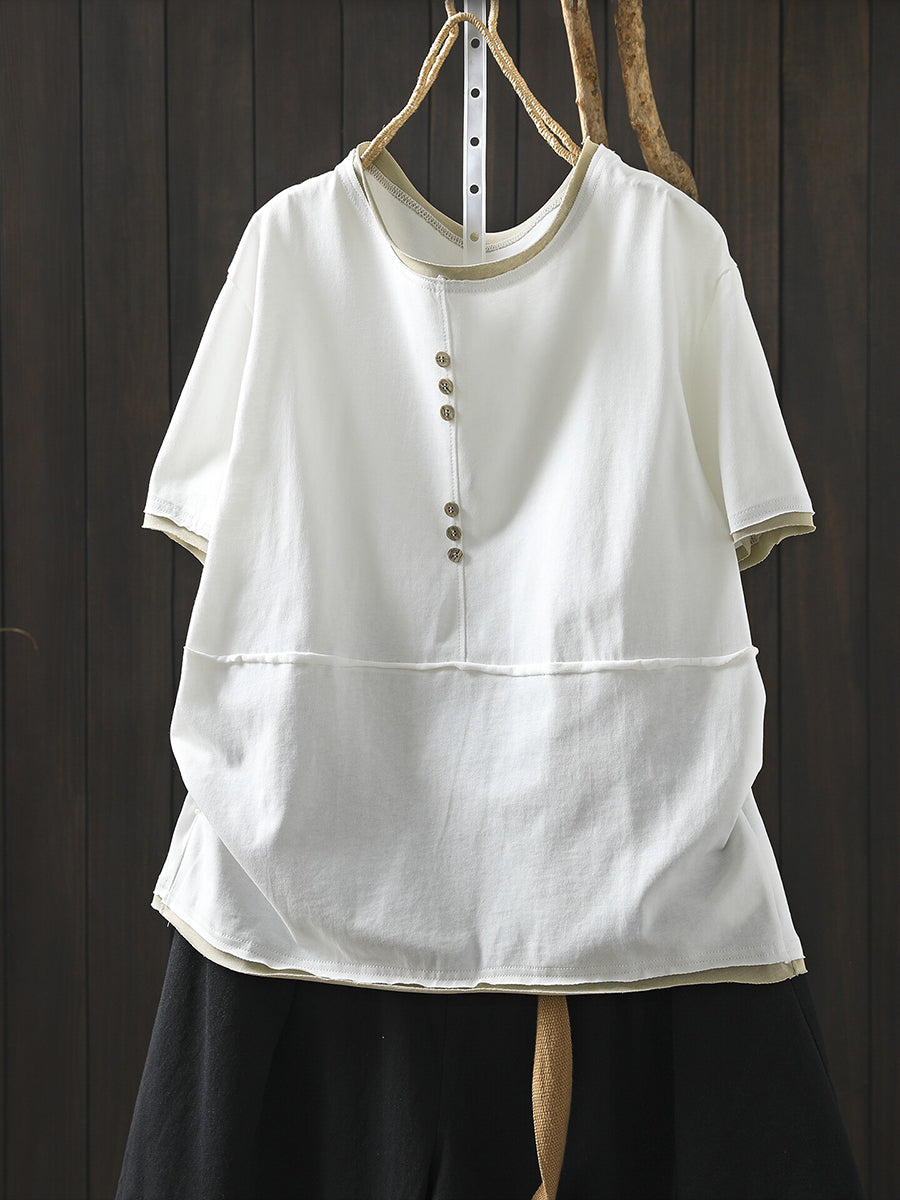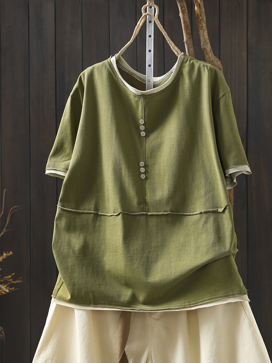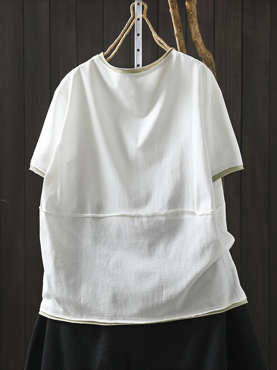 Women Casual Colorblock O-Neck 100%Cotton Shirt