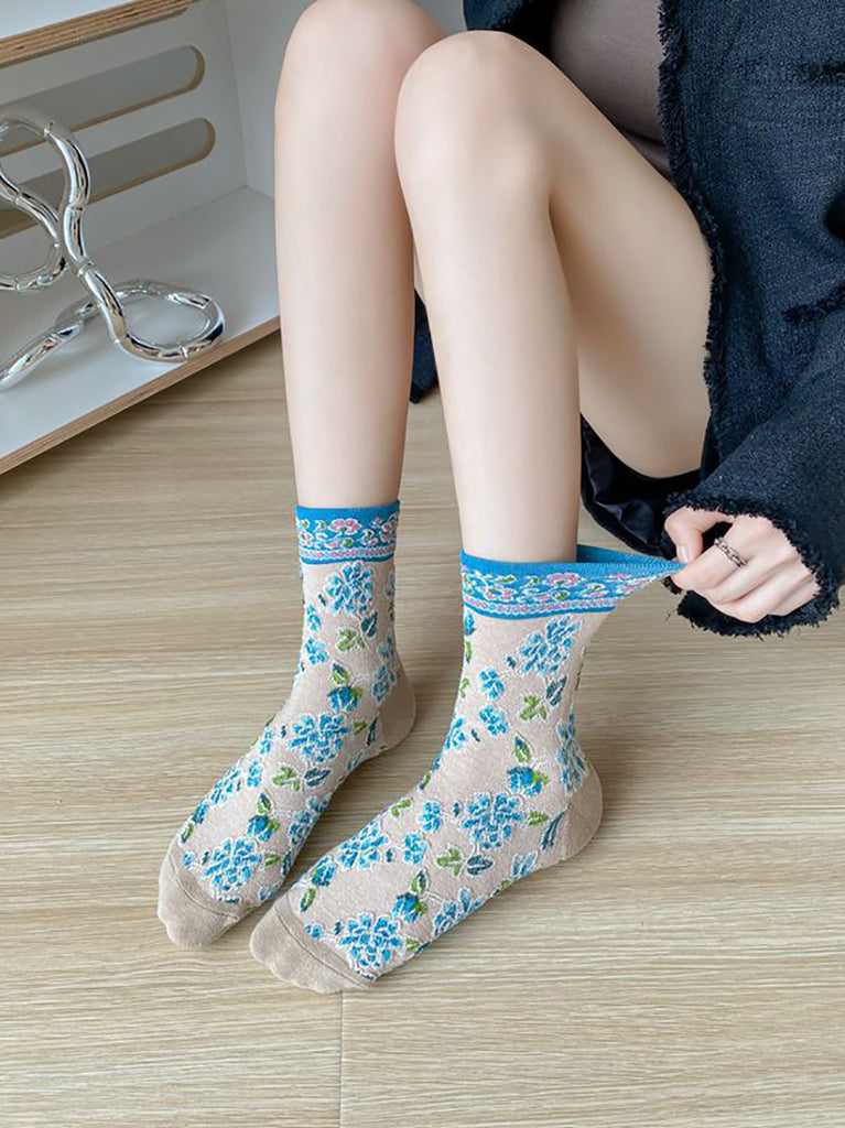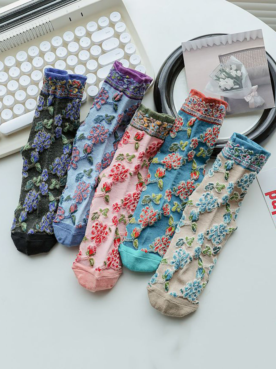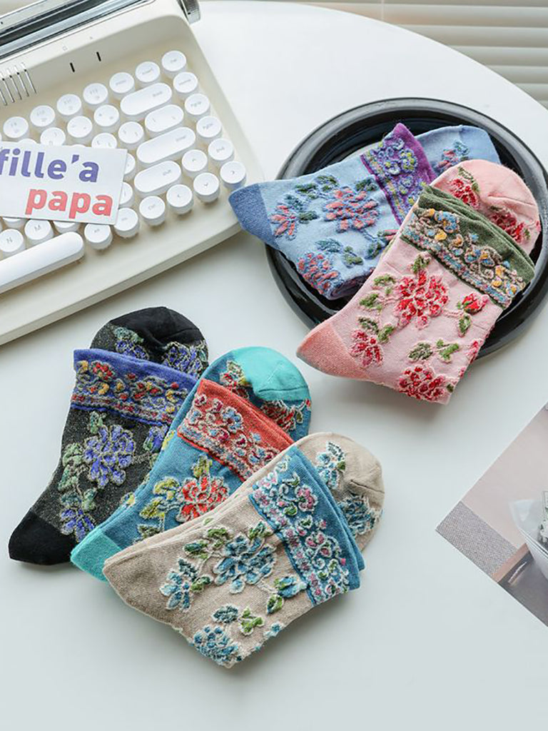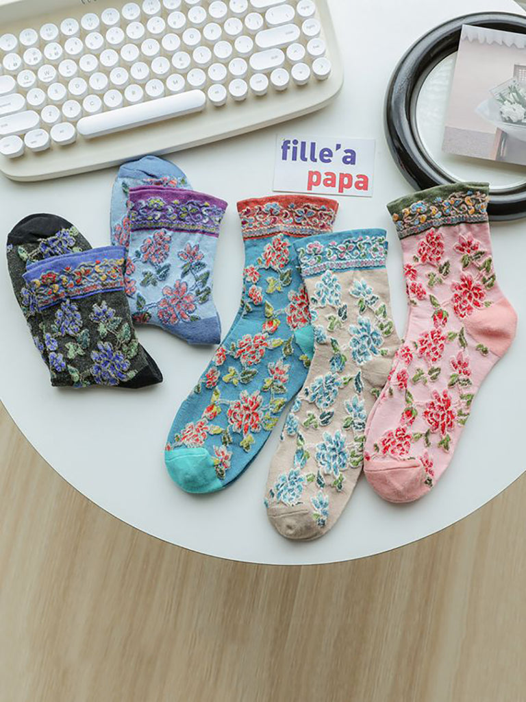 5 Pairs Women Vintage Floral Jacquard Cotton Socks