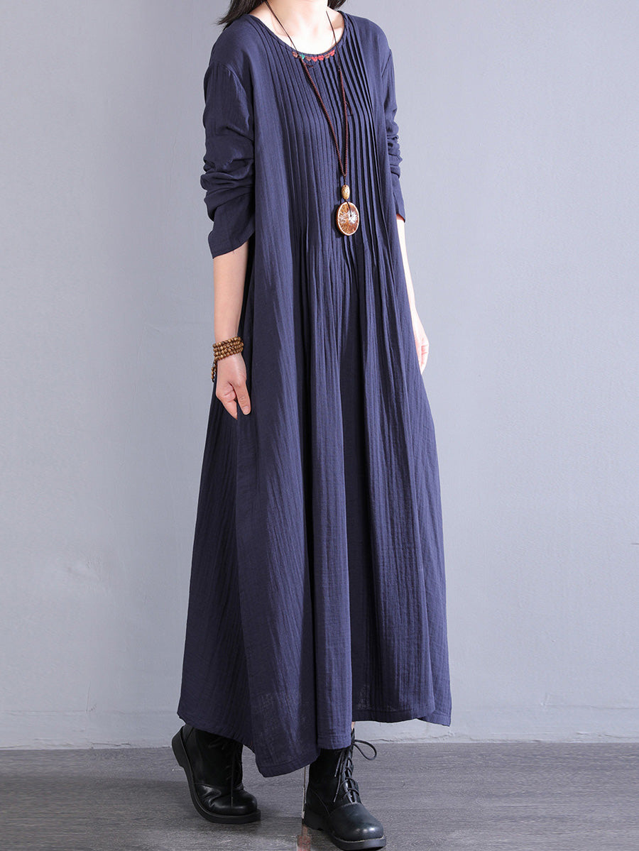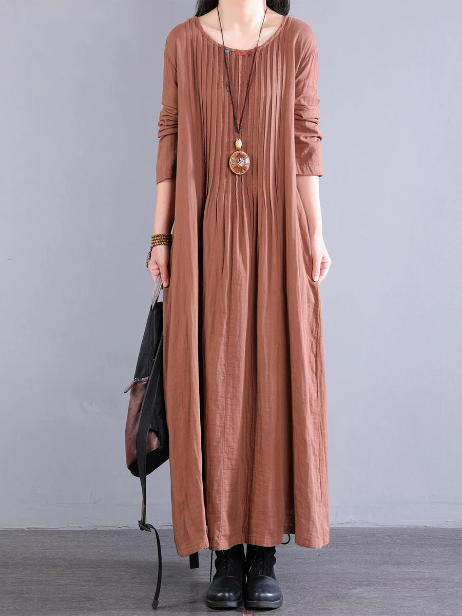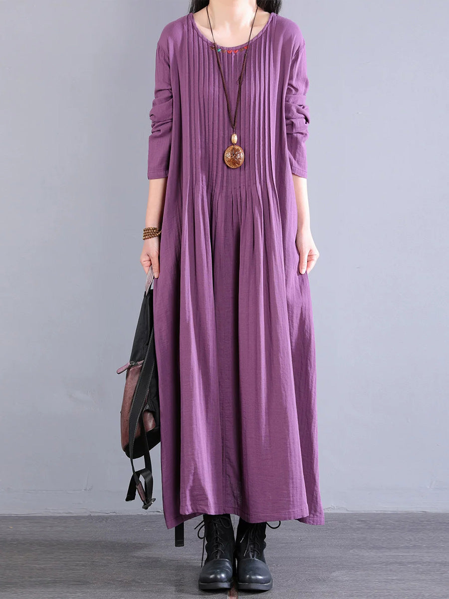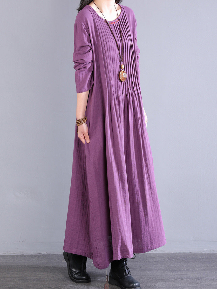 Women Artsy Pure Color Shirred 100%Cotton O-Neck Dress